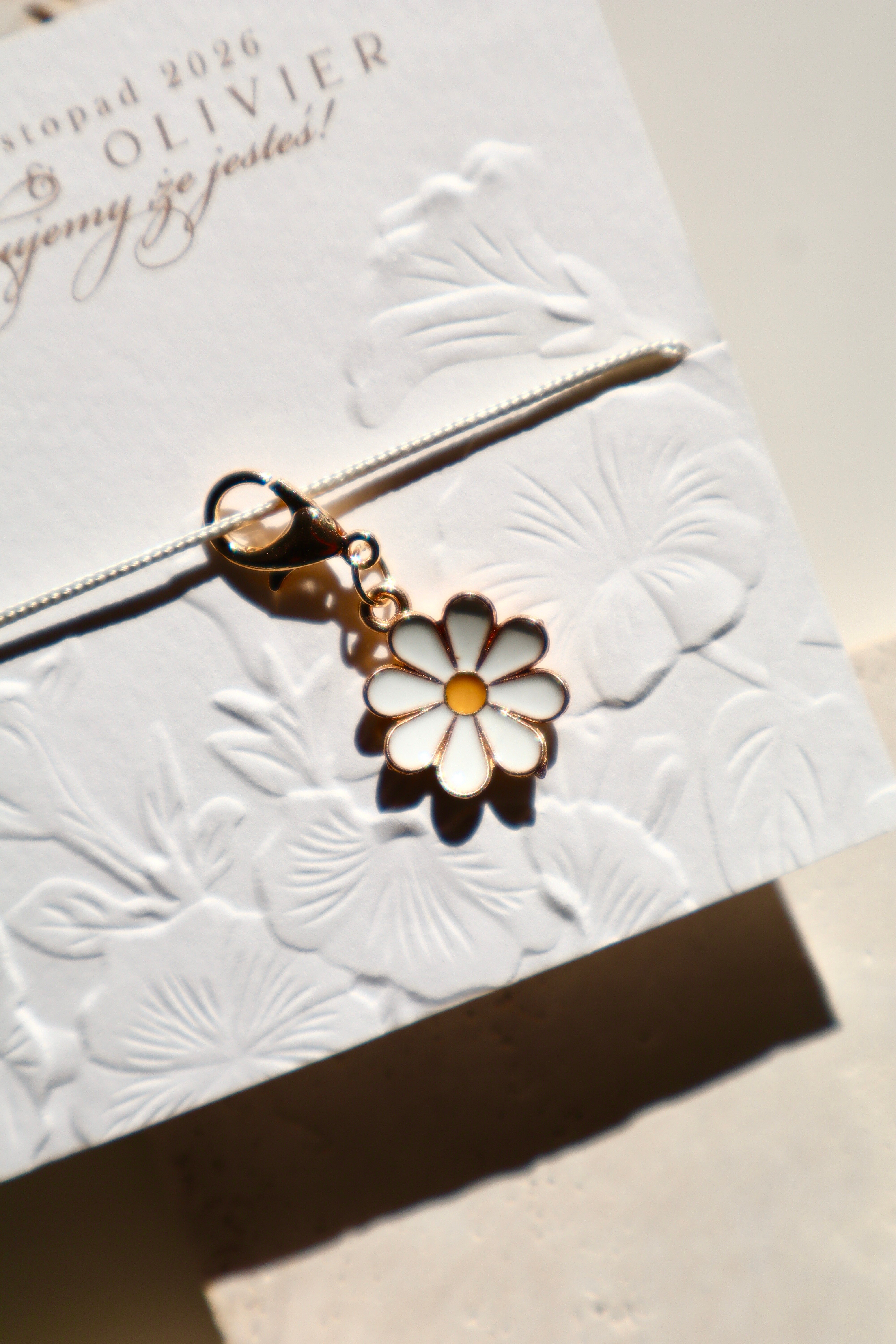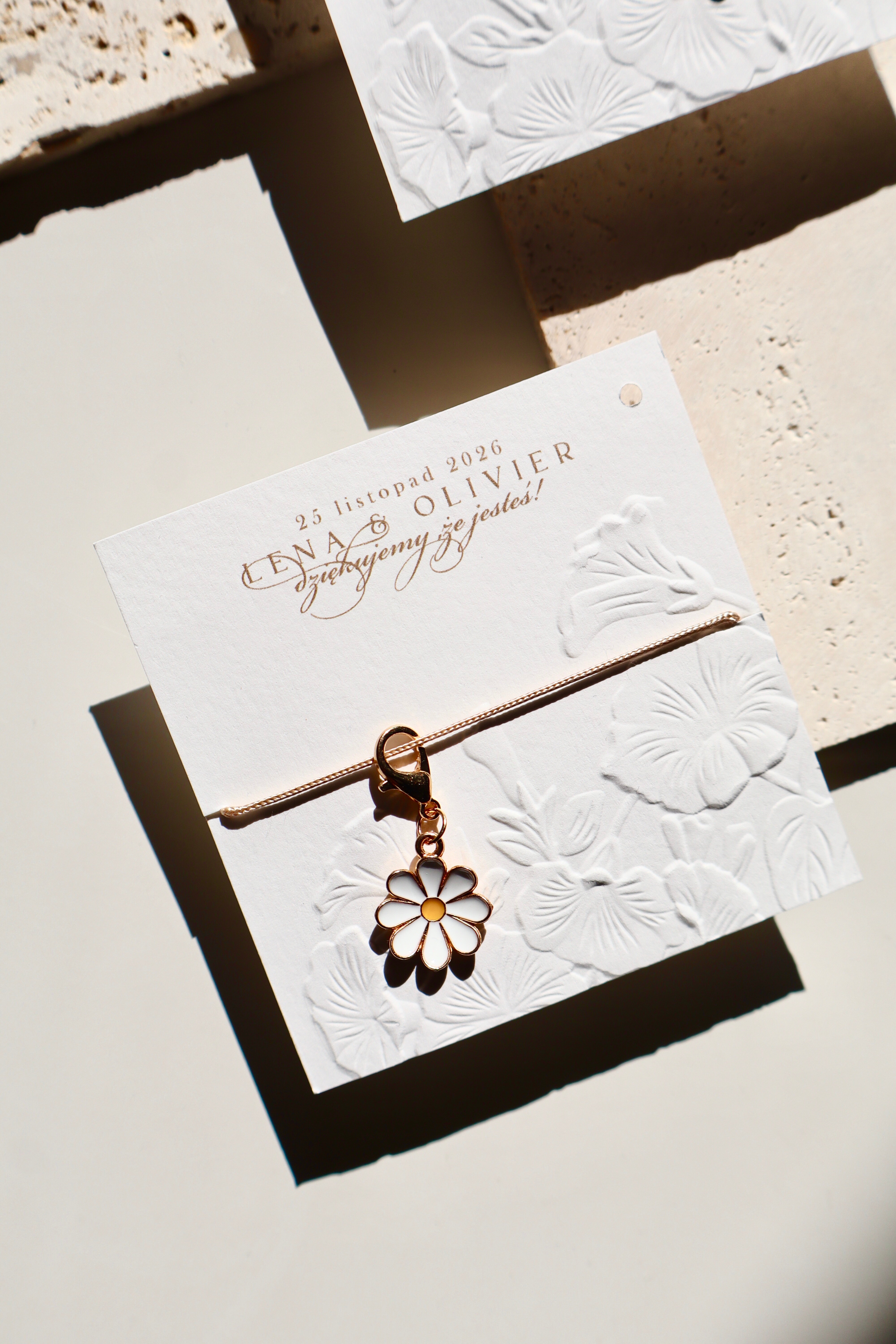 Minimalistyczna forma w połączeniu z delikatnym kolorem i złotym wykończeniem sprawia, że breloczek wygląda elegancko, a jednocześnie naturalnie. To drobny upominek, który może towarzyszyć na co dzień – przypominając o wyjątkowym dniu.