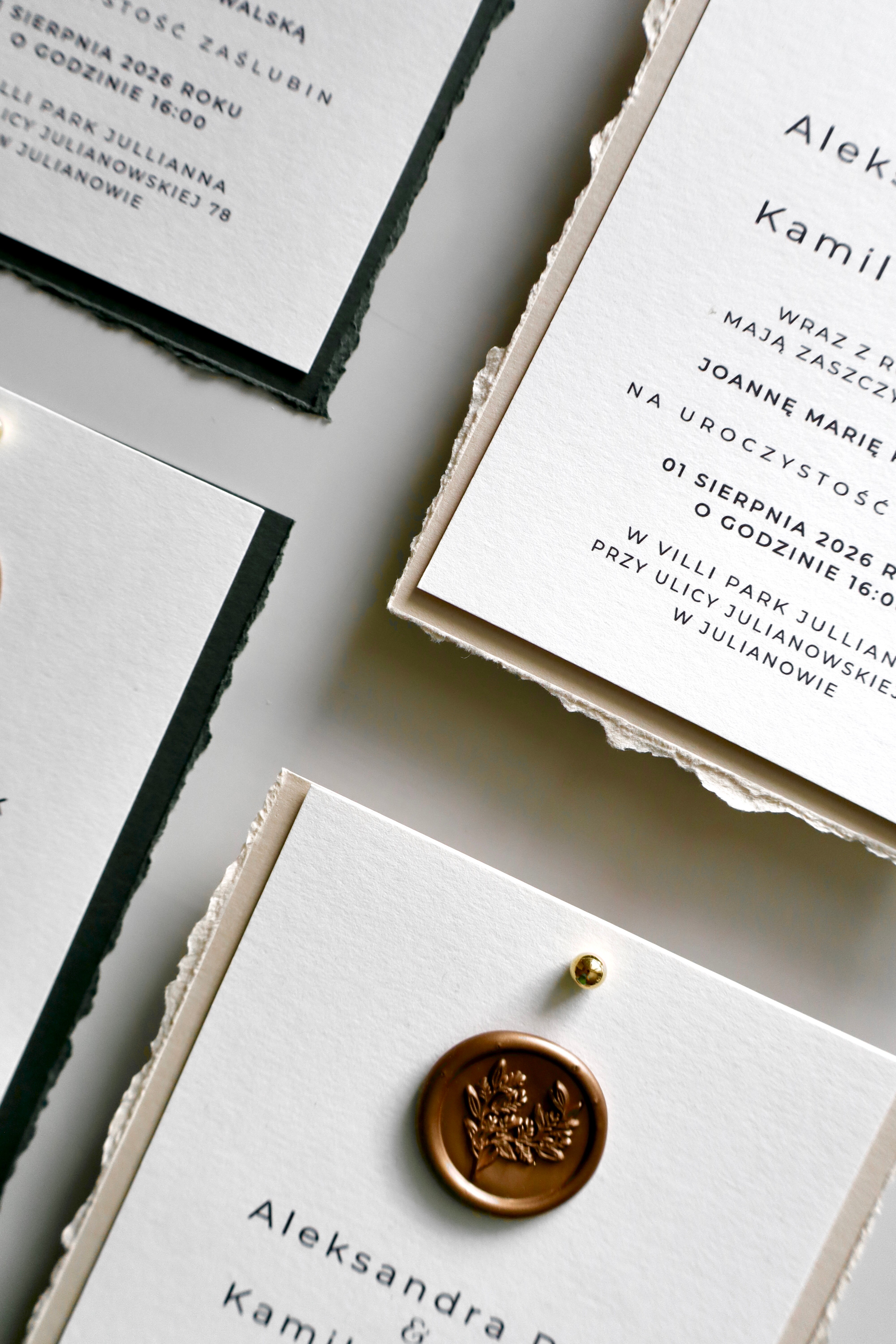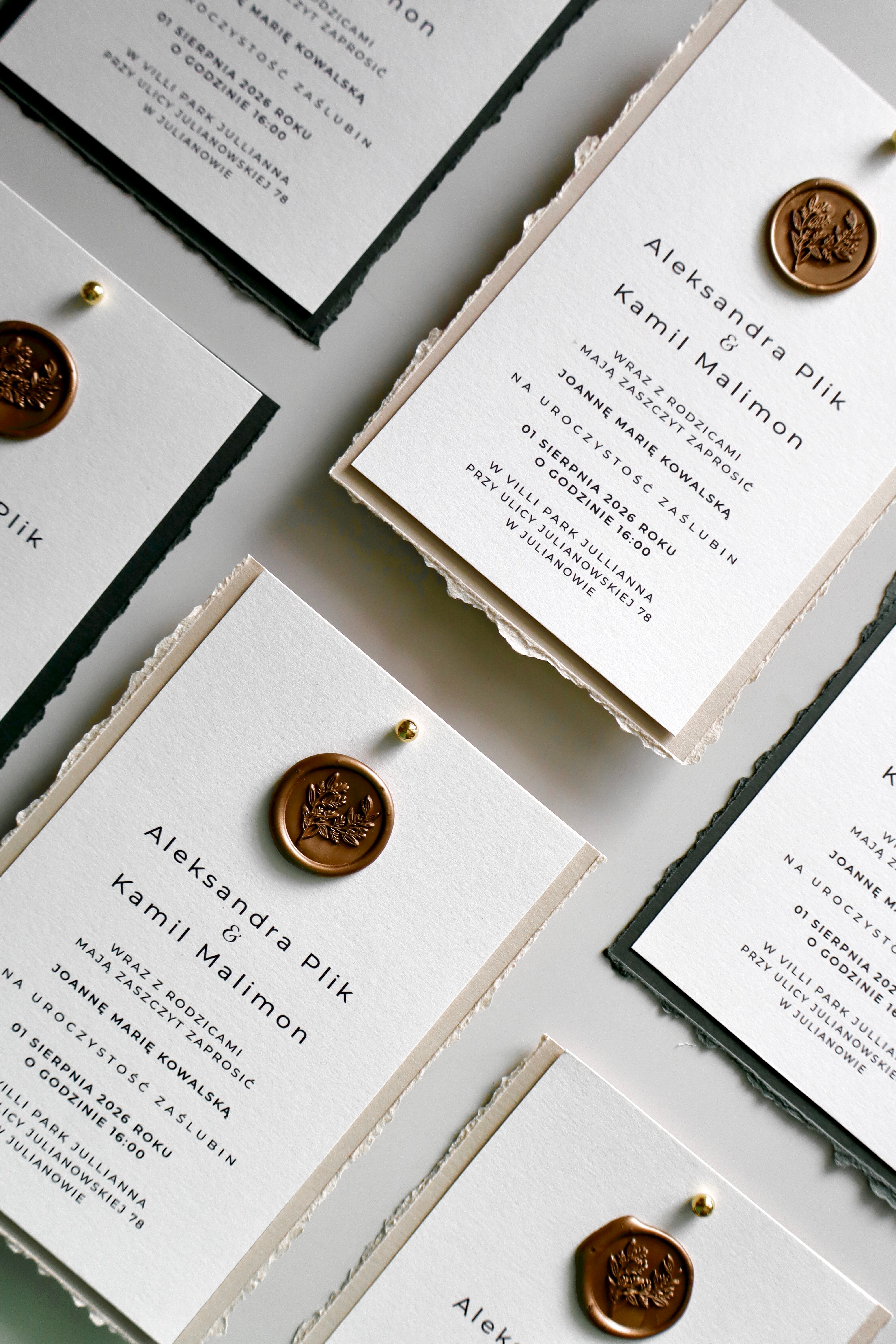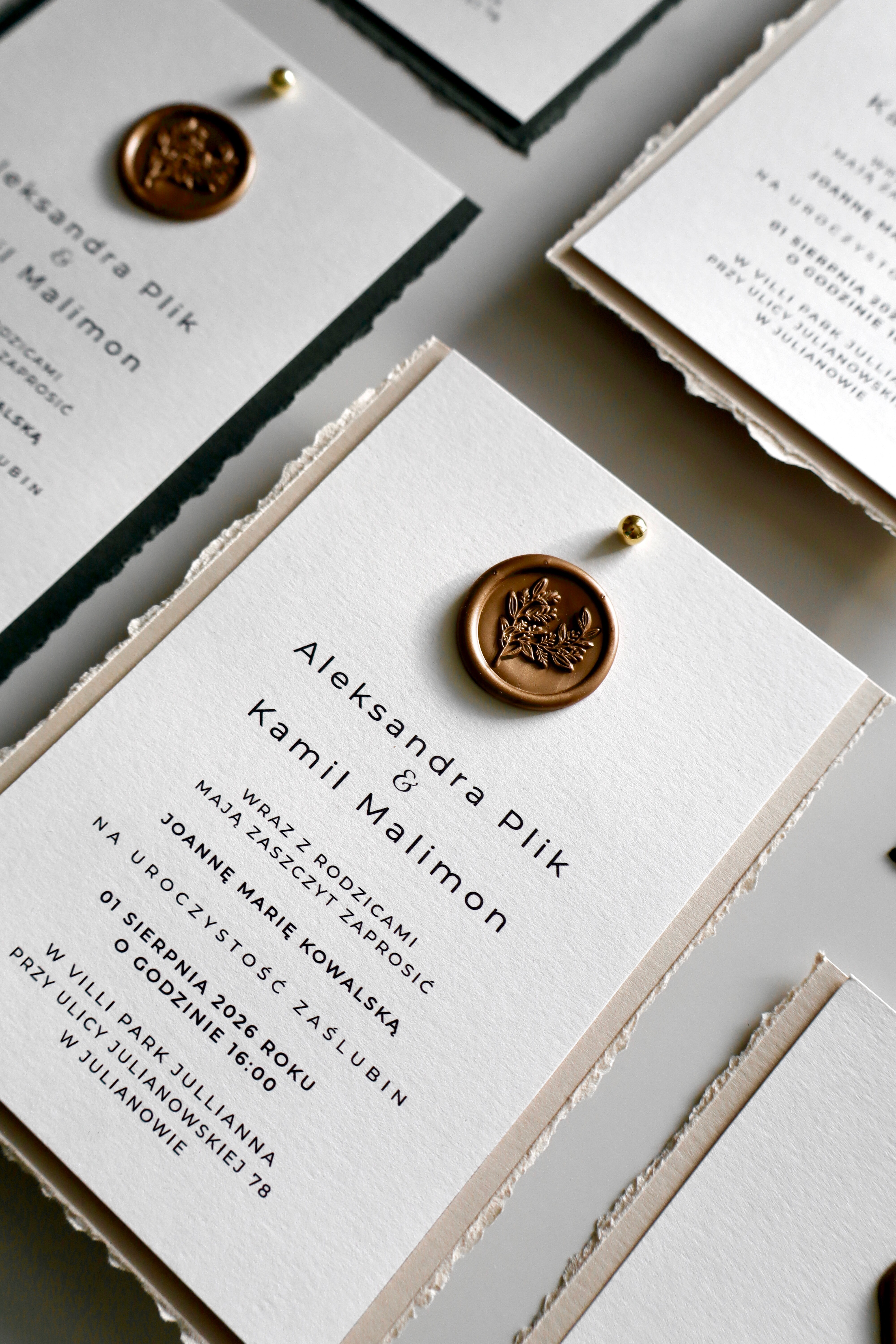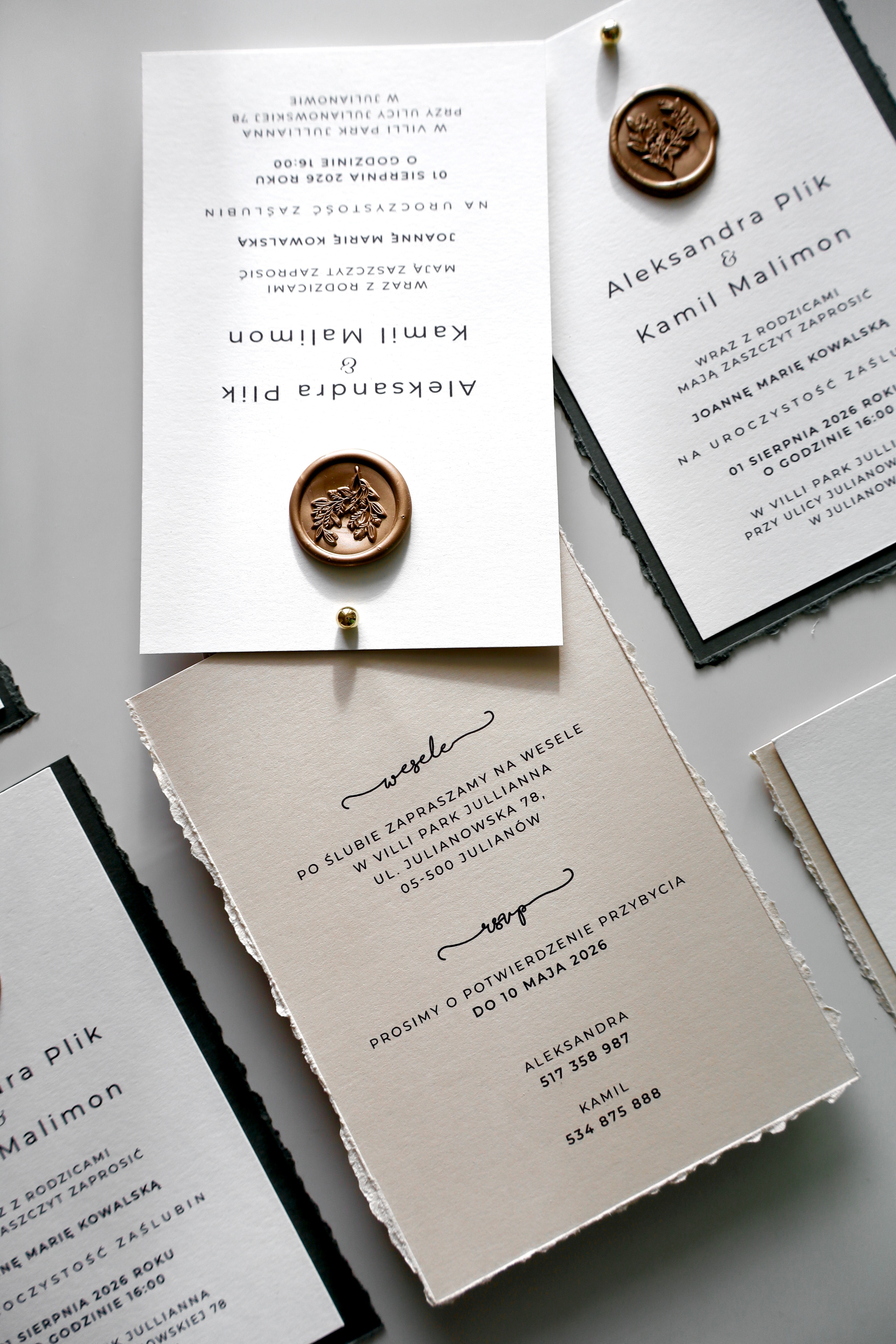 Zaproszenia ślubne Melanie zostały stworzone z myślą o Parach, które cenią minimalizm i subtelne dodatki. Główna karta jest na naszym ulubionym śmietankowym papierze o bawełnianej fakturze. Bilecik informacyjny pokazaliśmy w dwóch odcieniach - beżu oraz khaki. Ma on ręcznie rwane brzegi, które podkreślają unikatowy charakter zaproszenia.