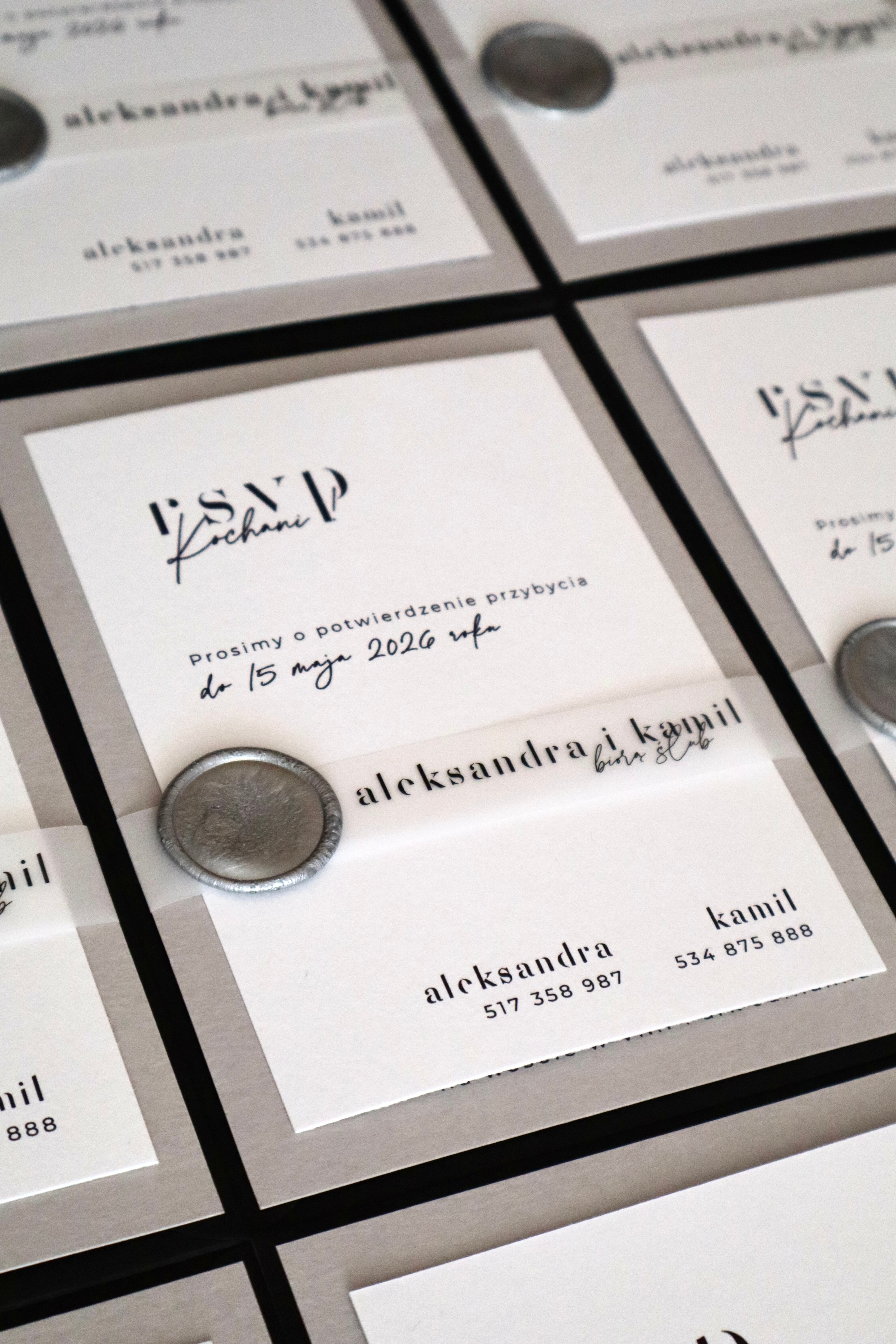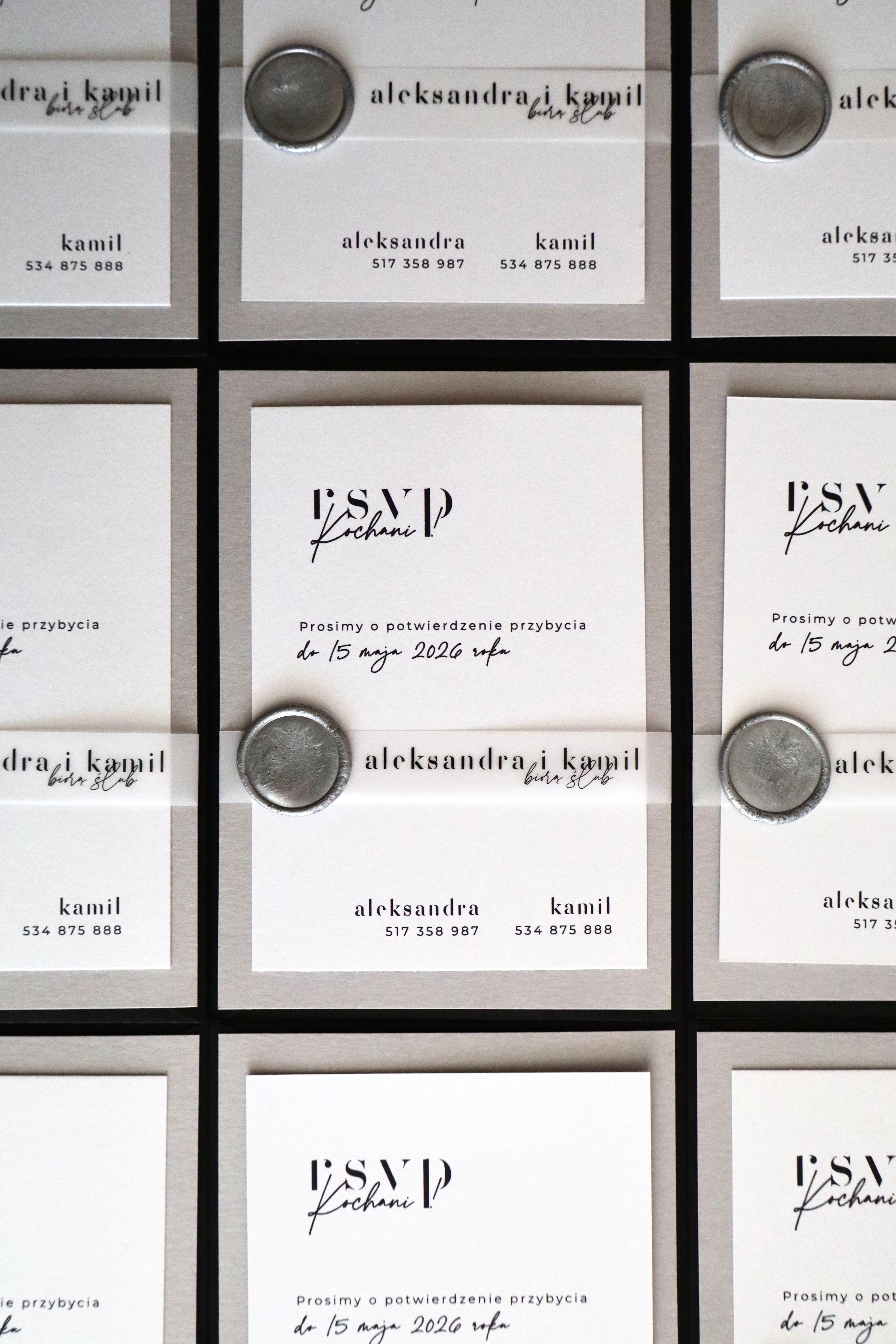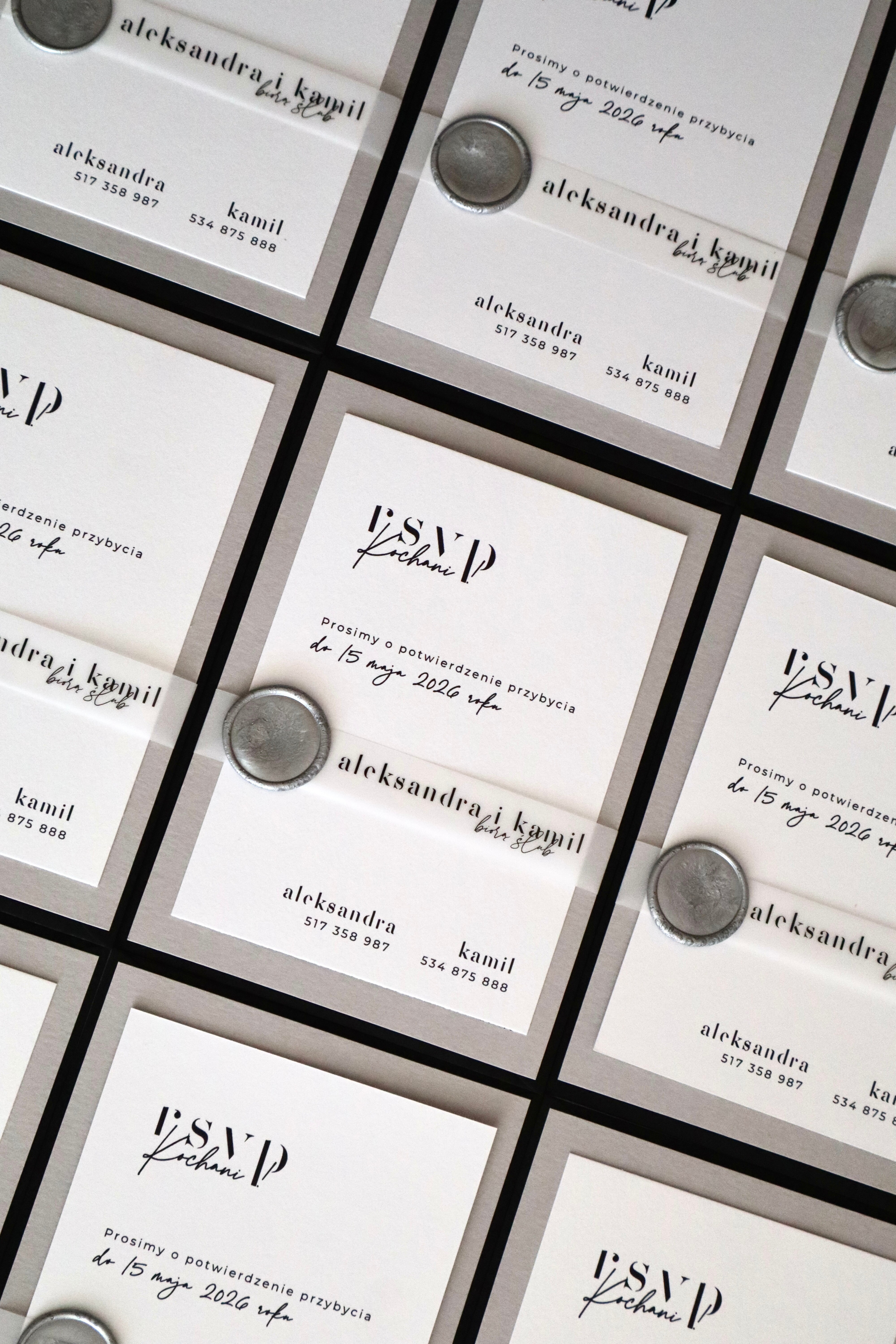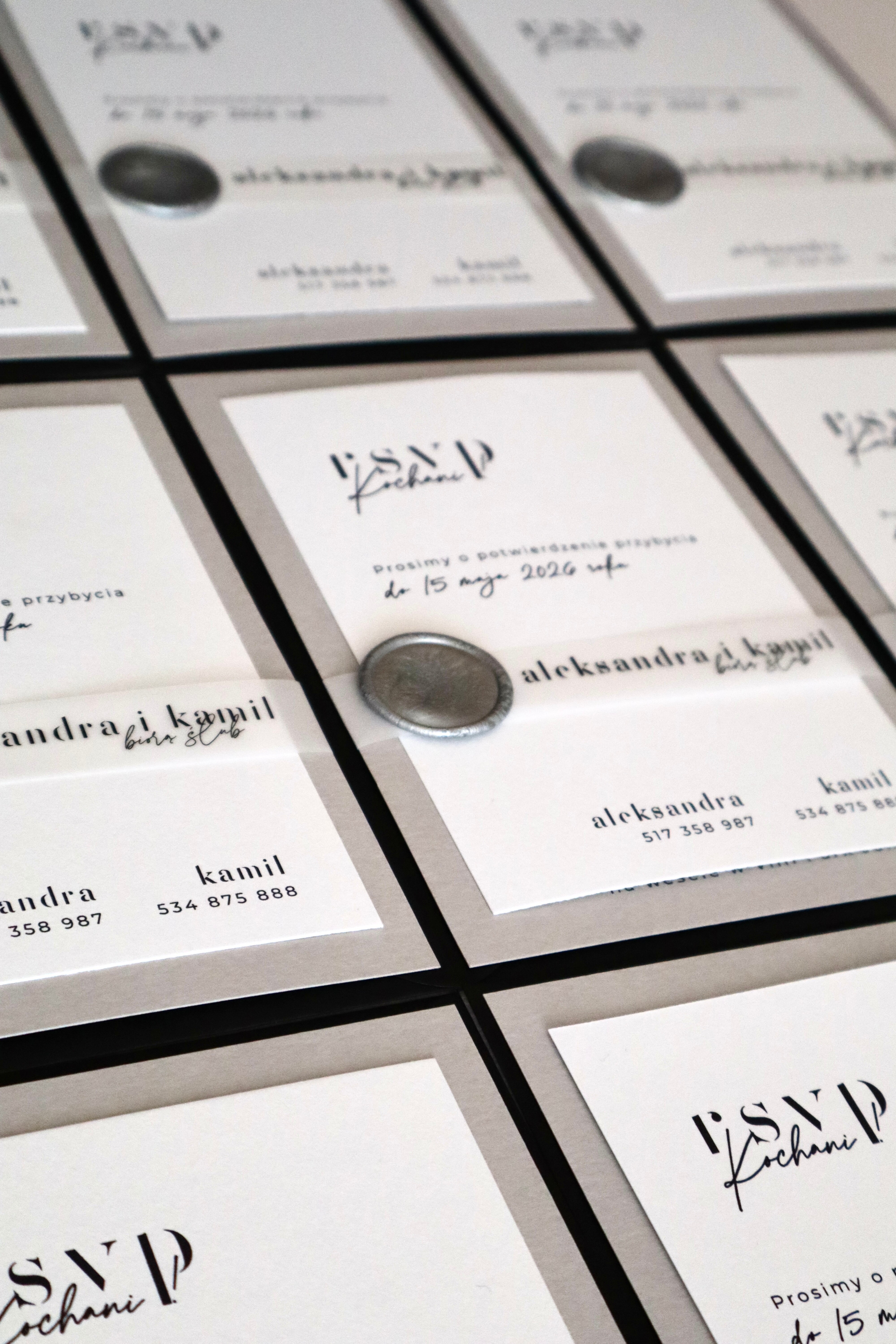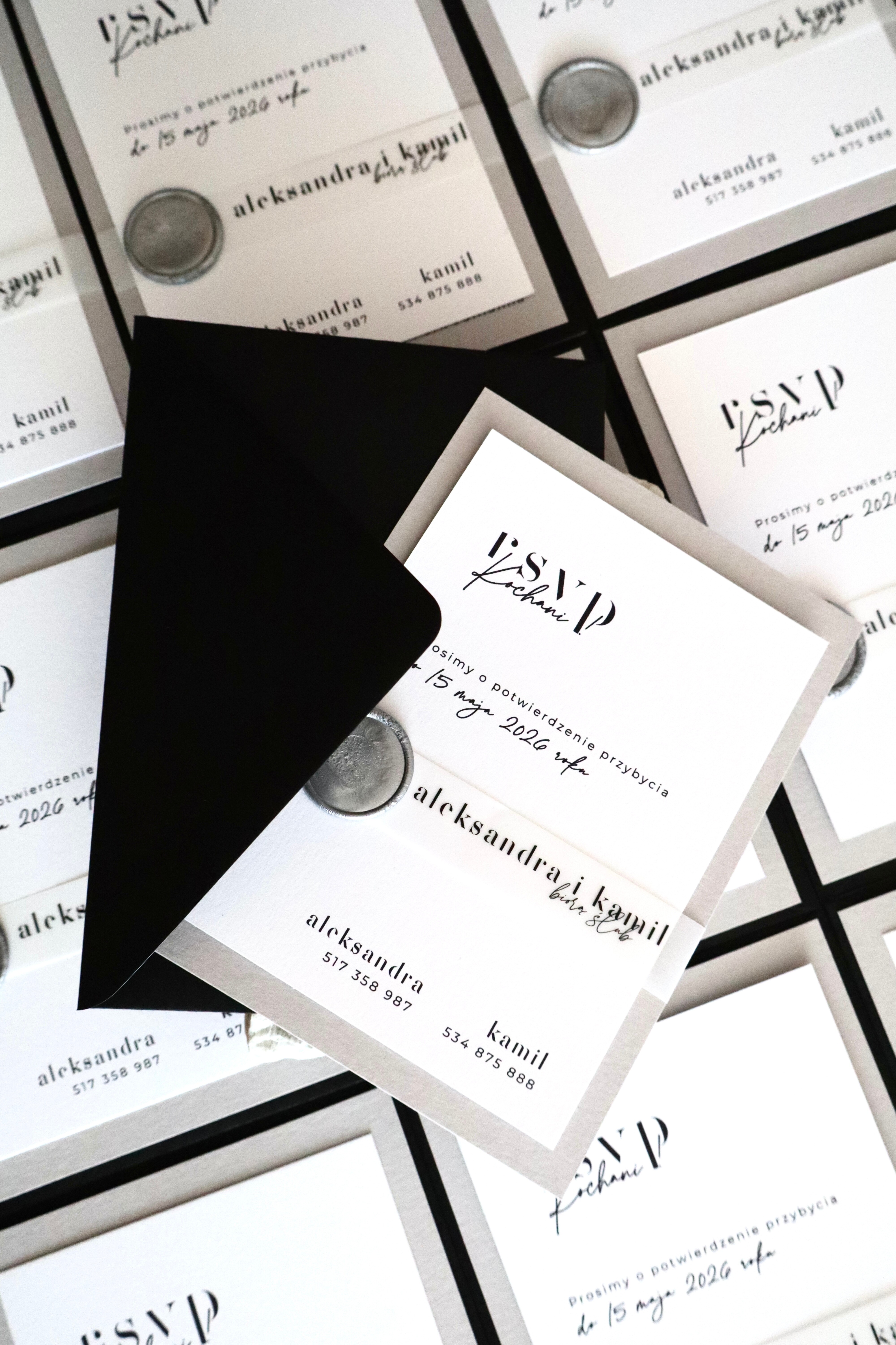 Szarość i biel kart zaproszeń w połączeniu z kontrastową czernią koperty oraz wyraźną typografią tworzą niepowtarzalny efekt.