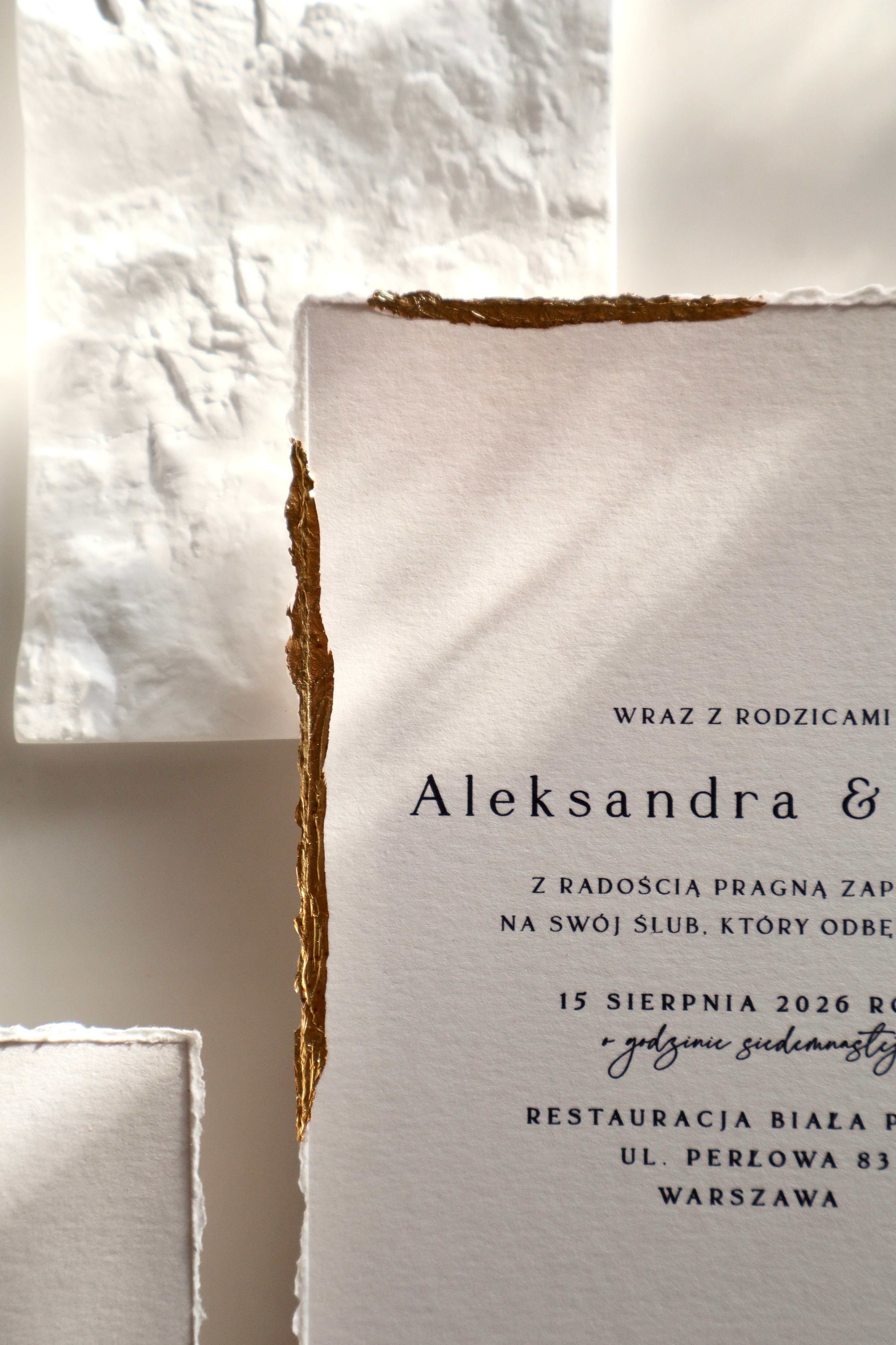 Zaproszenie Luciana to połączenie szlachetnego rzemiosła z nowoczesnym minimalizmem. Składa się z dwóch osobnych kart: głównego zaproszenia oraz bileciku informacyjnego – obie wykonane z najwyższej jakości papierów z ręcznie rwanymi brzegami, które nadają projektowi naturalnej lekkości i elegancji.
