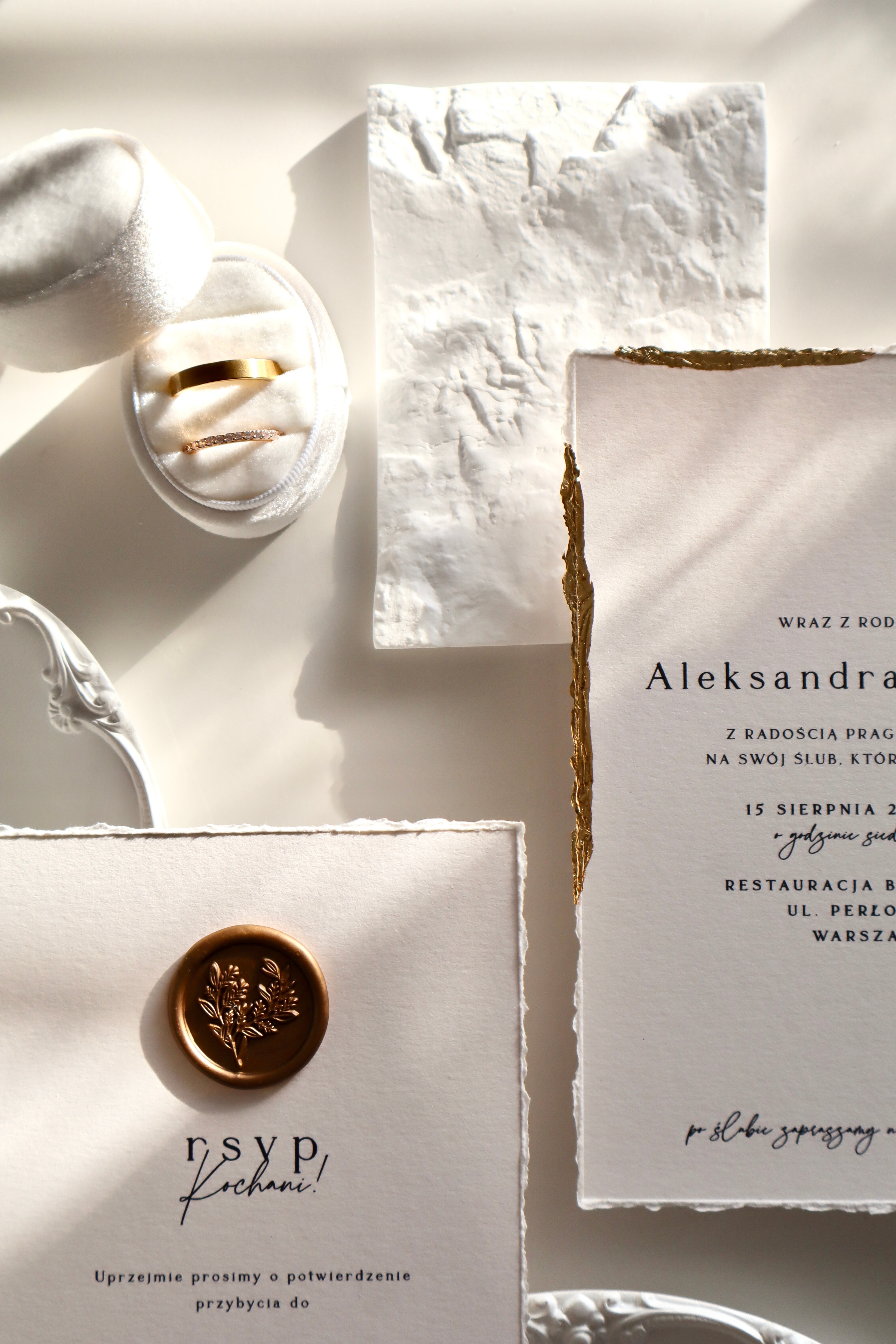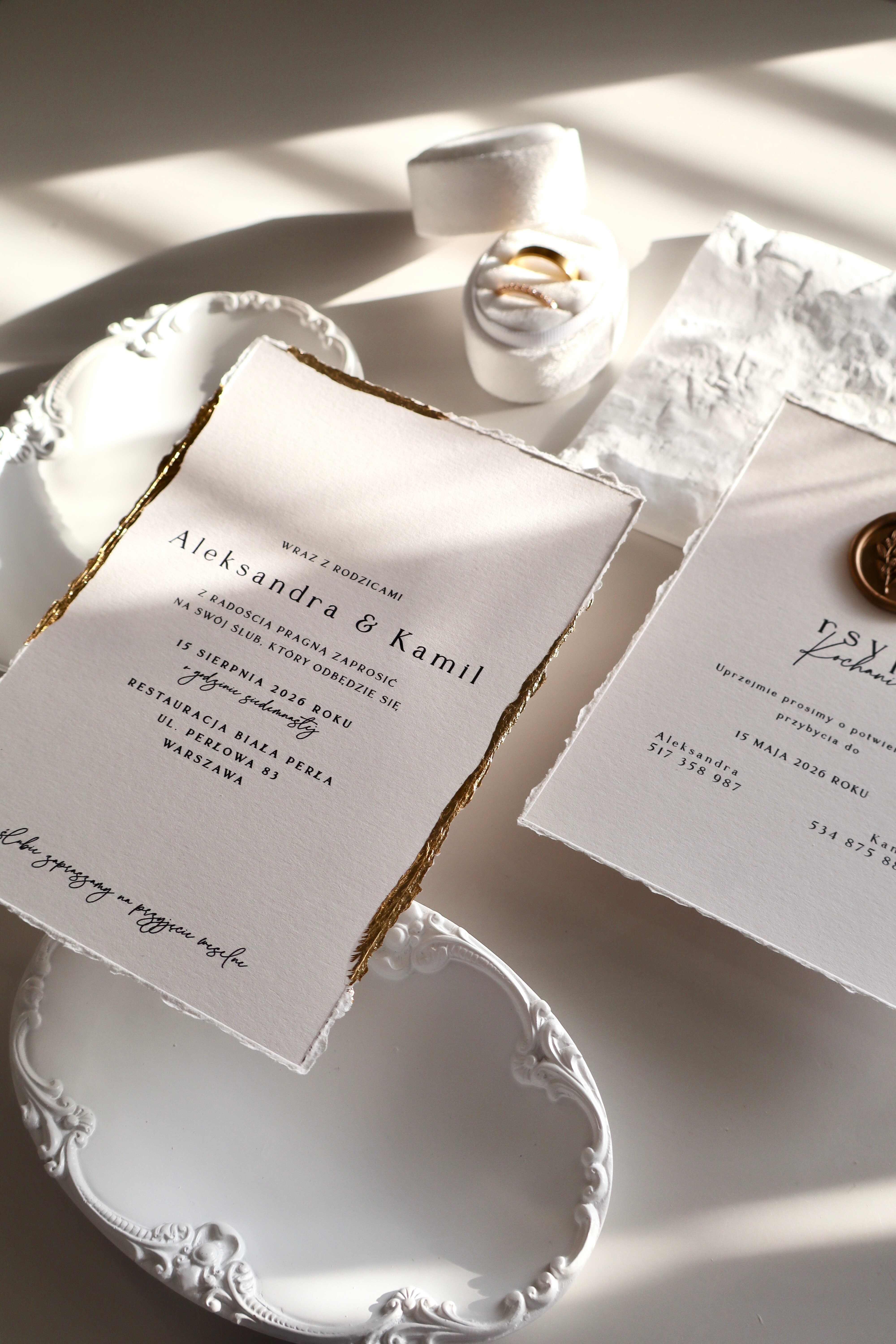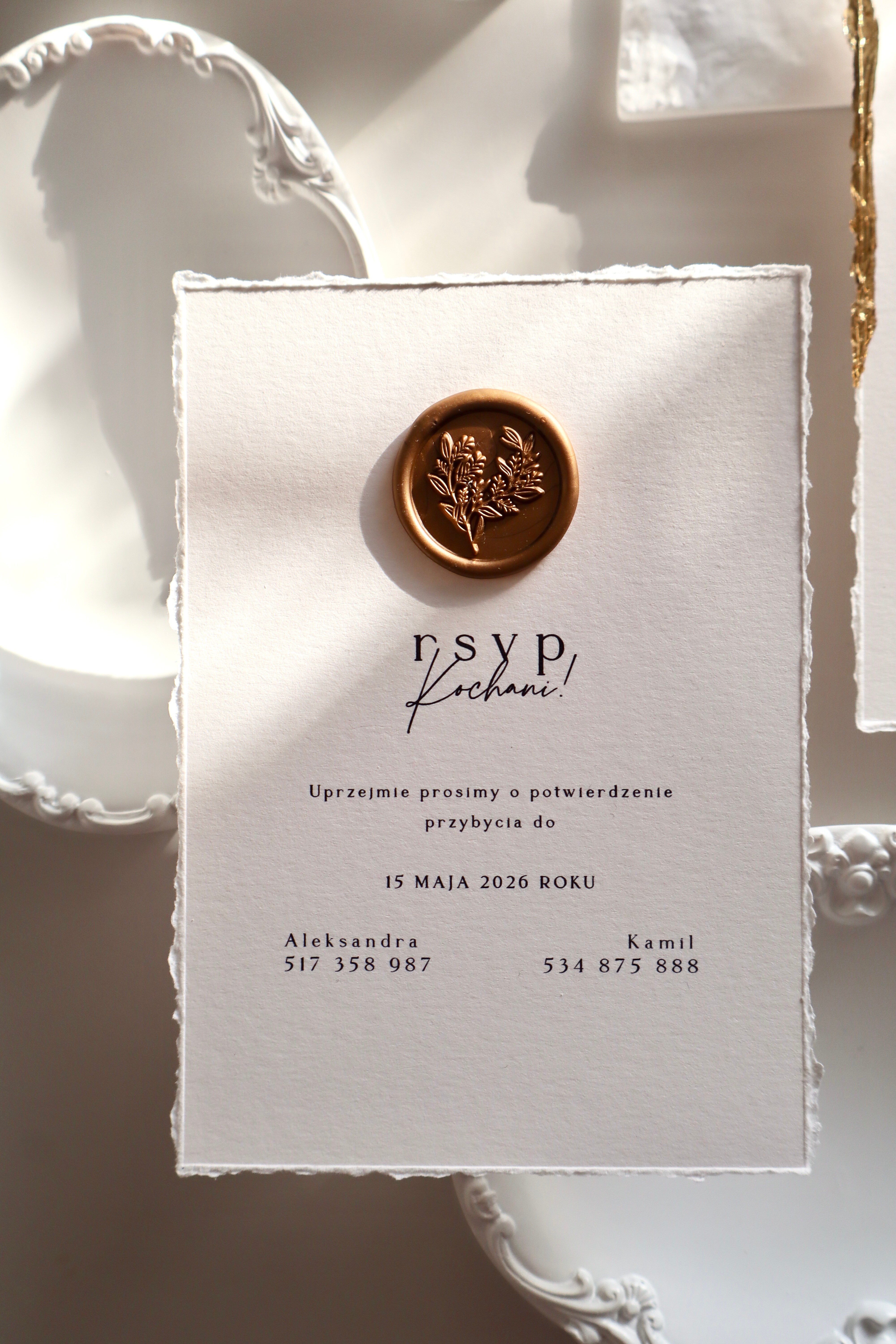 Druga karta – bilecik informacyjny – również posiada ręcznie rwane brzegi i wzbogacona jest stemplowaną pieczęcią lakową w kolorze starego złota, co stanowi elegancki akcent i podkreśla wyjątkowość całego zestawu.