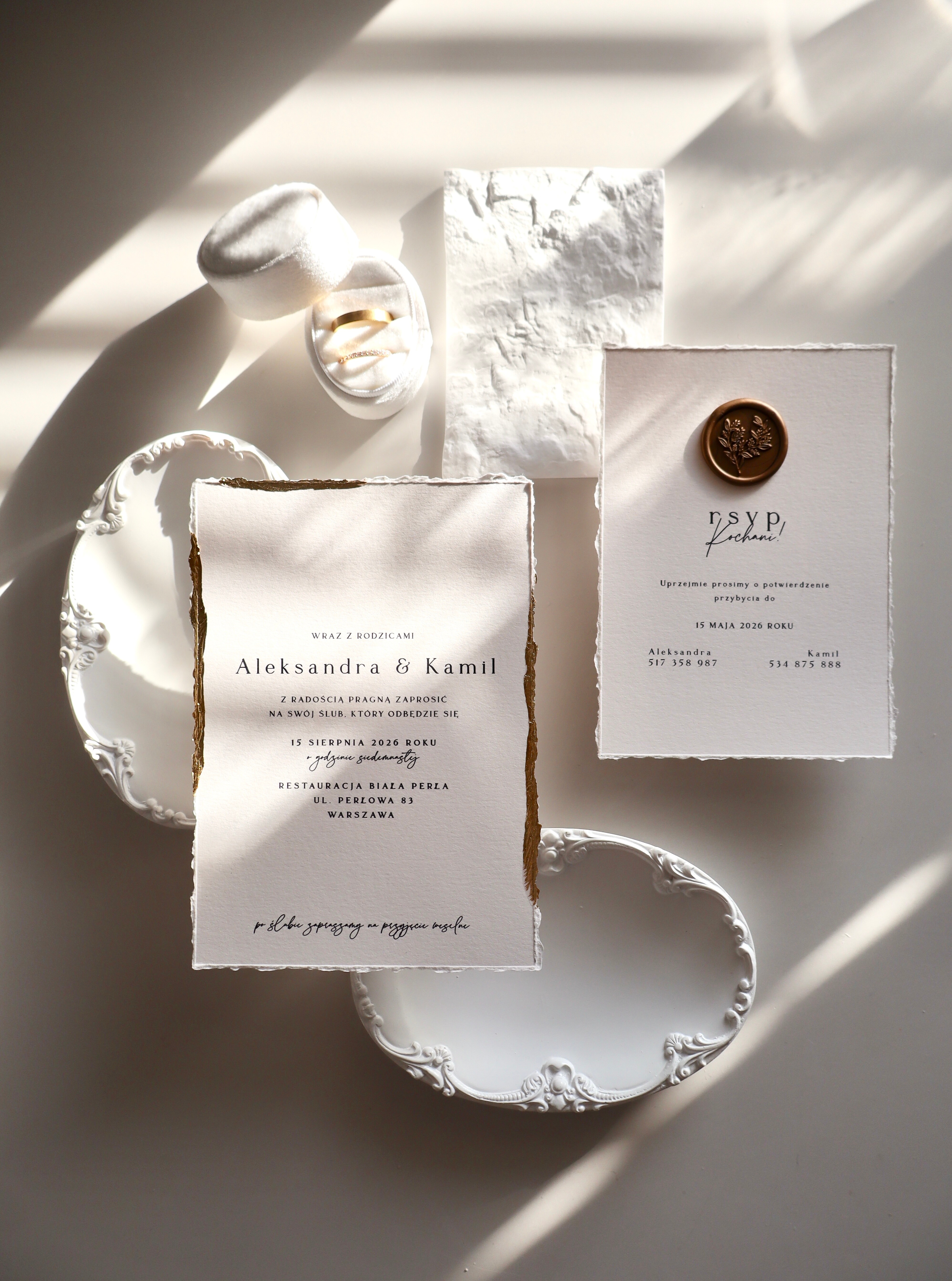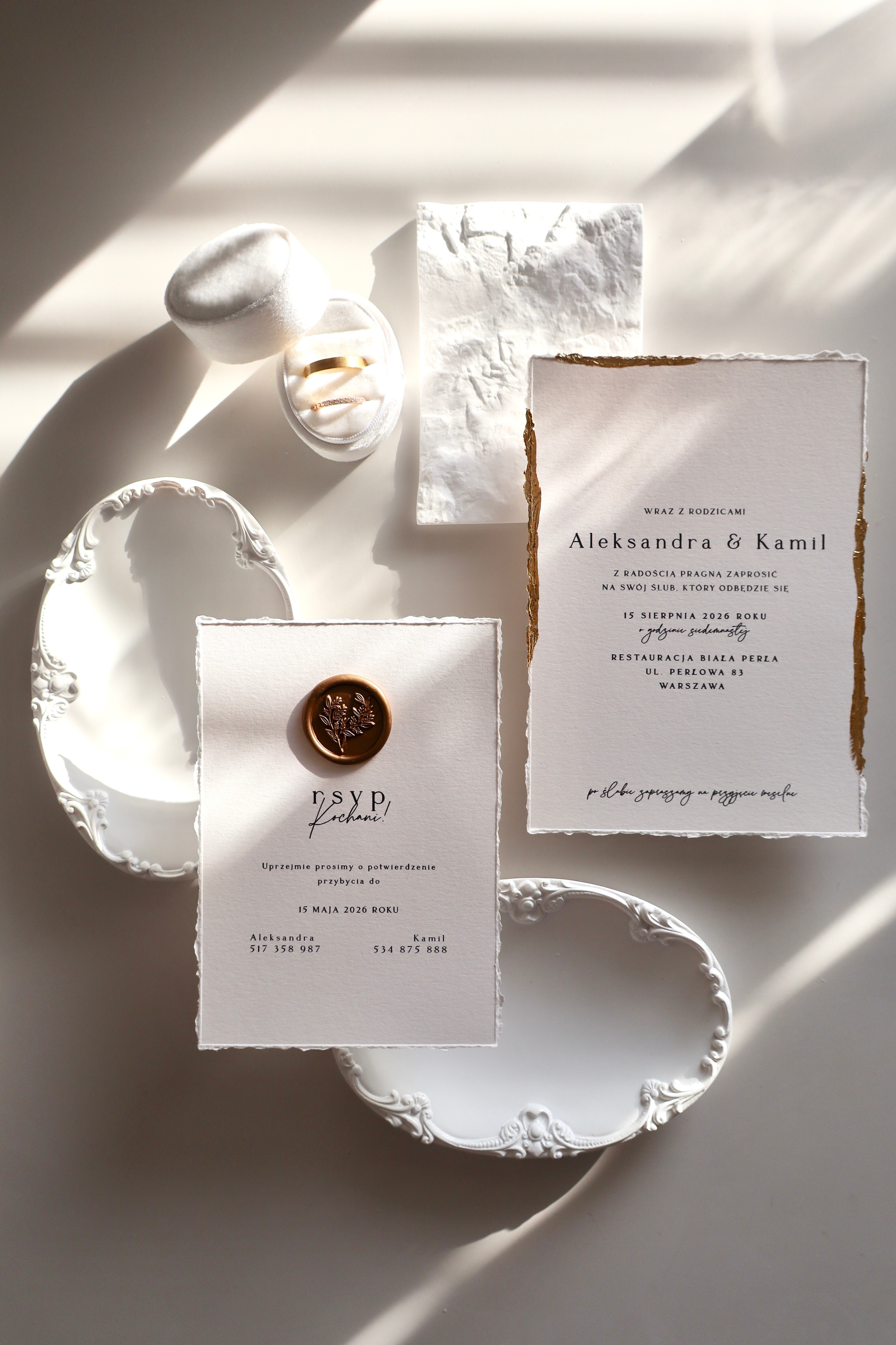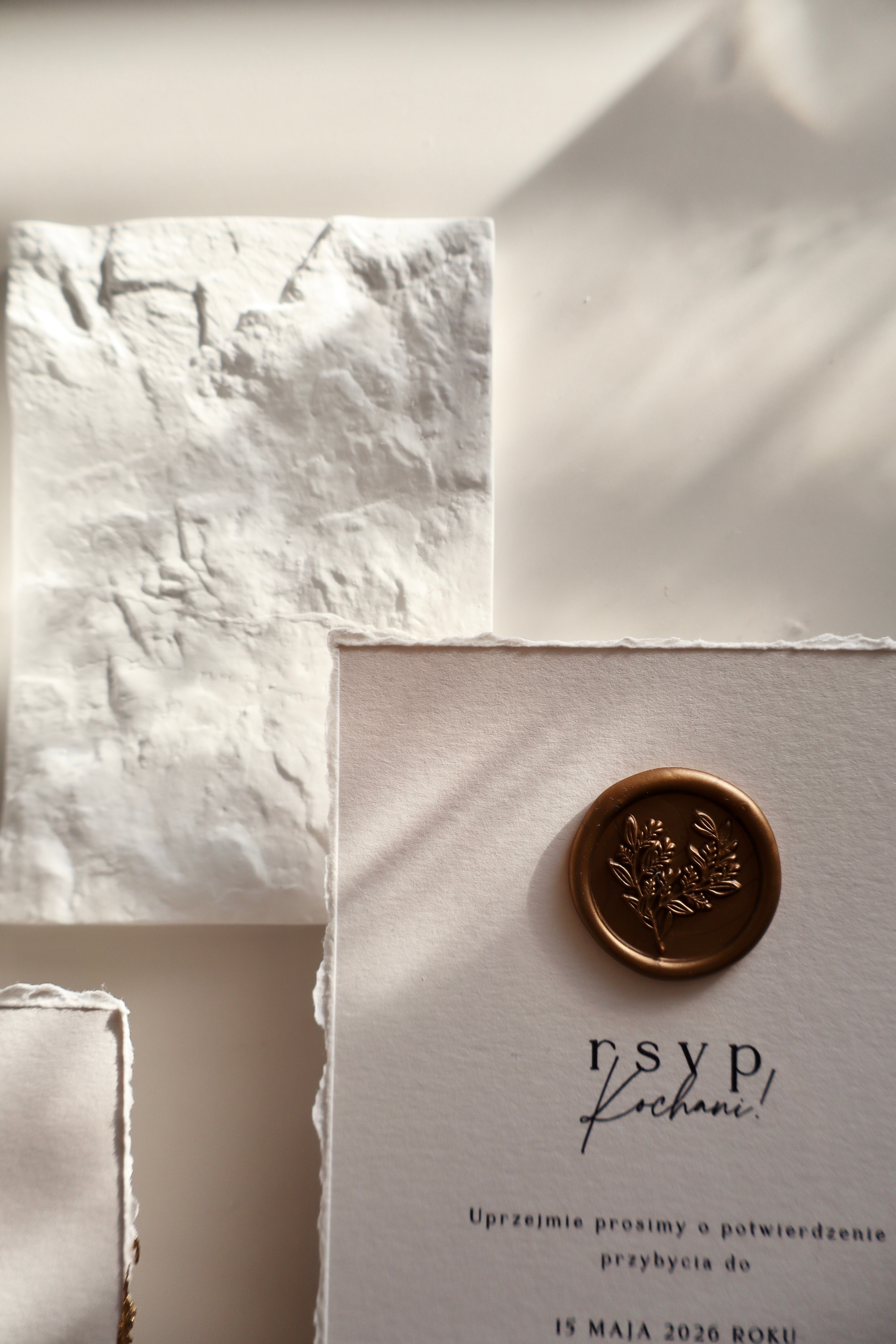 Druga karta – bilecik informacyjny – również posiada ręcznie rwane brzegi i wzbogacona jest stemplowaną pieczęcią lakową w kolorze starego złota, co stanowi elegancki akcent i podkreśla wyjątkowość całego zestawu.