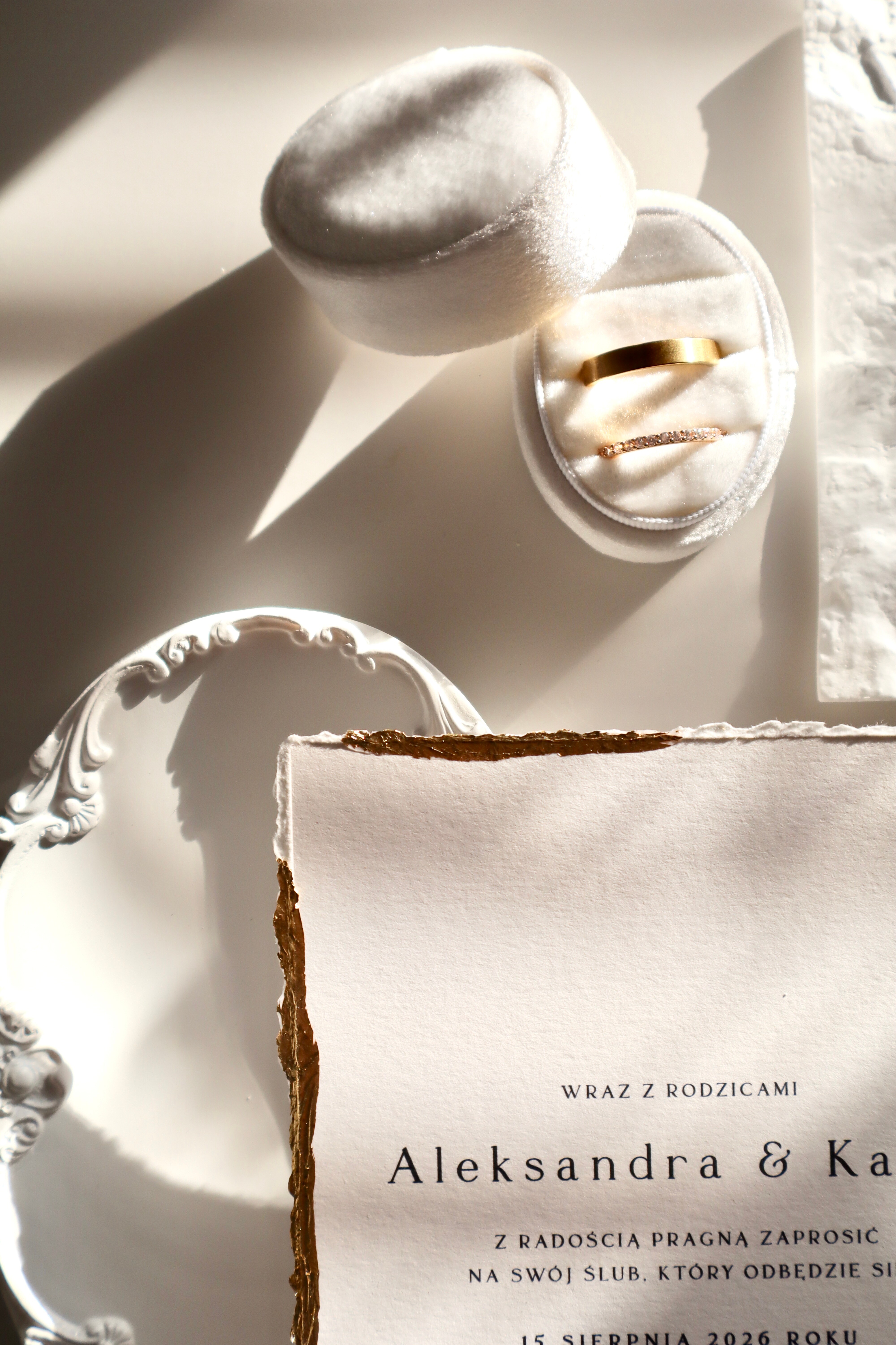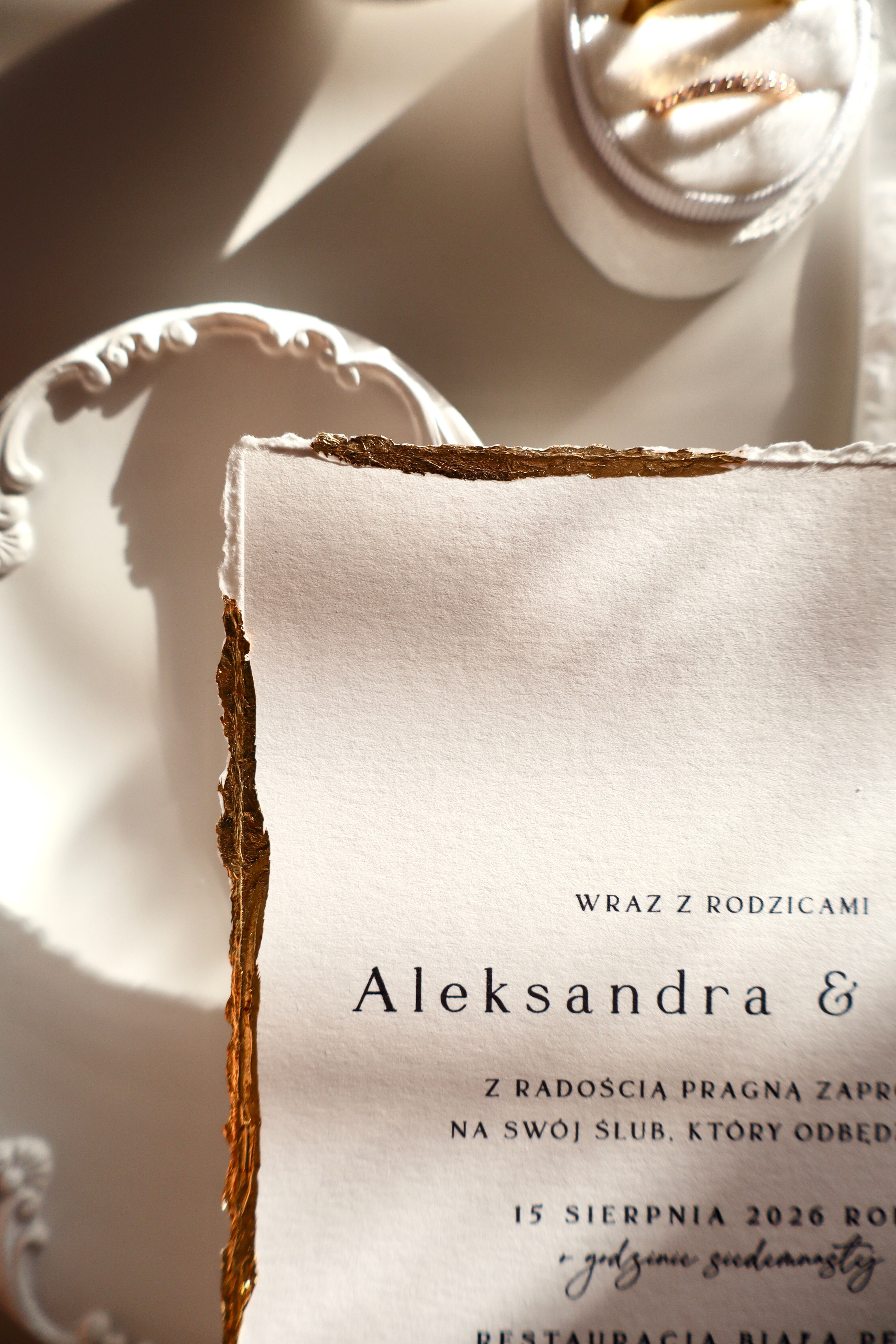 Główna karta zachwyca ręcznie złoconymi krawędziami, które połyskują w świetle, dodając zaproszeniu blasku i ekskluzywnego charakteru.