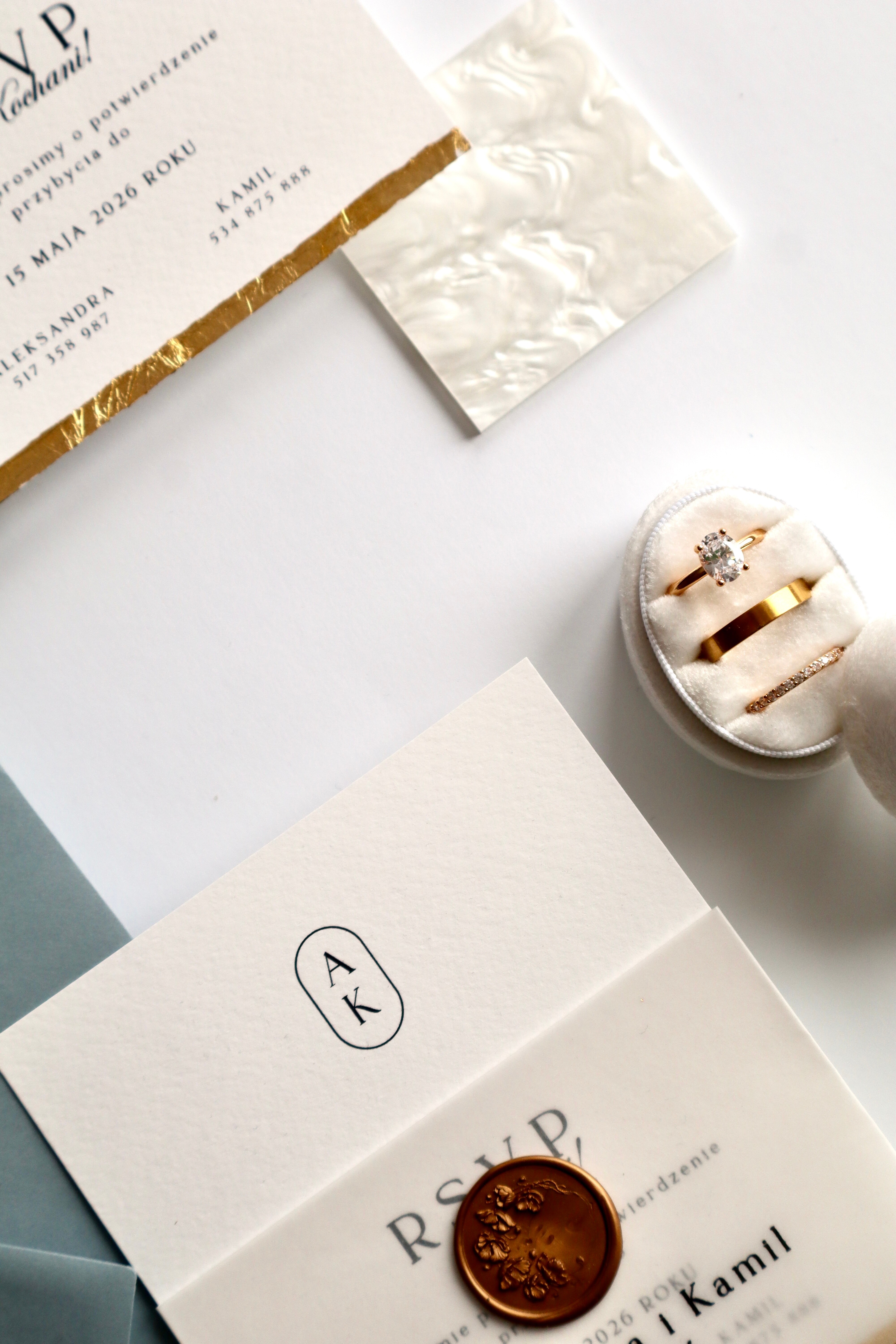 Zestaw dopełnia przezroczysta opaska z nadrukiem oraz lakową pieczęcią – to detale, które nie tylko dopełniają całości, ale sprawiają, że każde zaproszenie staje się małym dziełem sztuki. Opaska subtelnie spaja wszystkie elementy, a jednocześnie pięknie eksponuje złocenia i fakturę papieru.