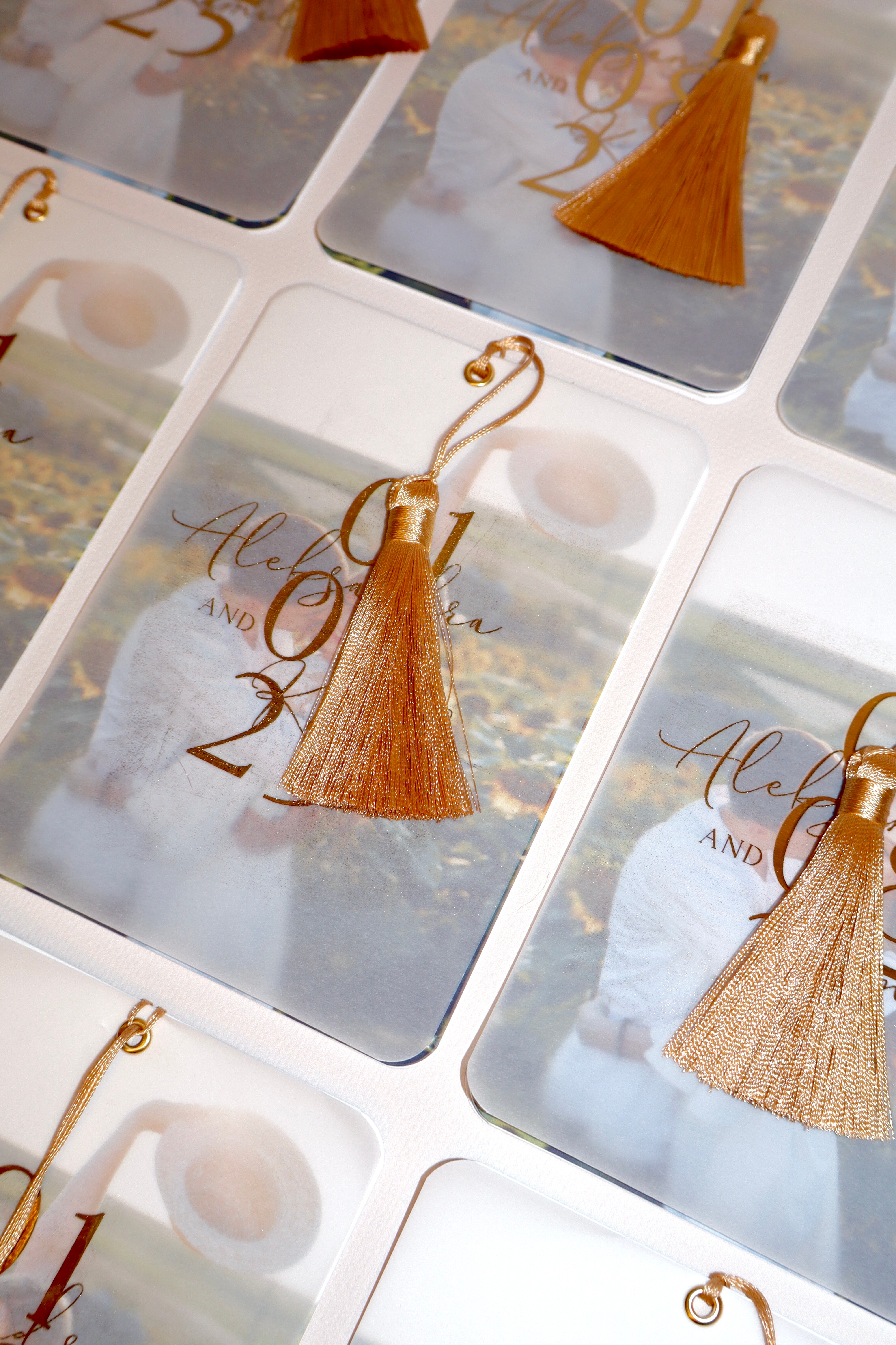 Wszystkie elementy zostały spięte złotym oczkiem, przez które przechodzi chwost w odcieniu rose gold – detal, który przyciąga wzrok i czyni zaproszenie wyjątkowym nie tylko wizualnie, ale również w dotyku.