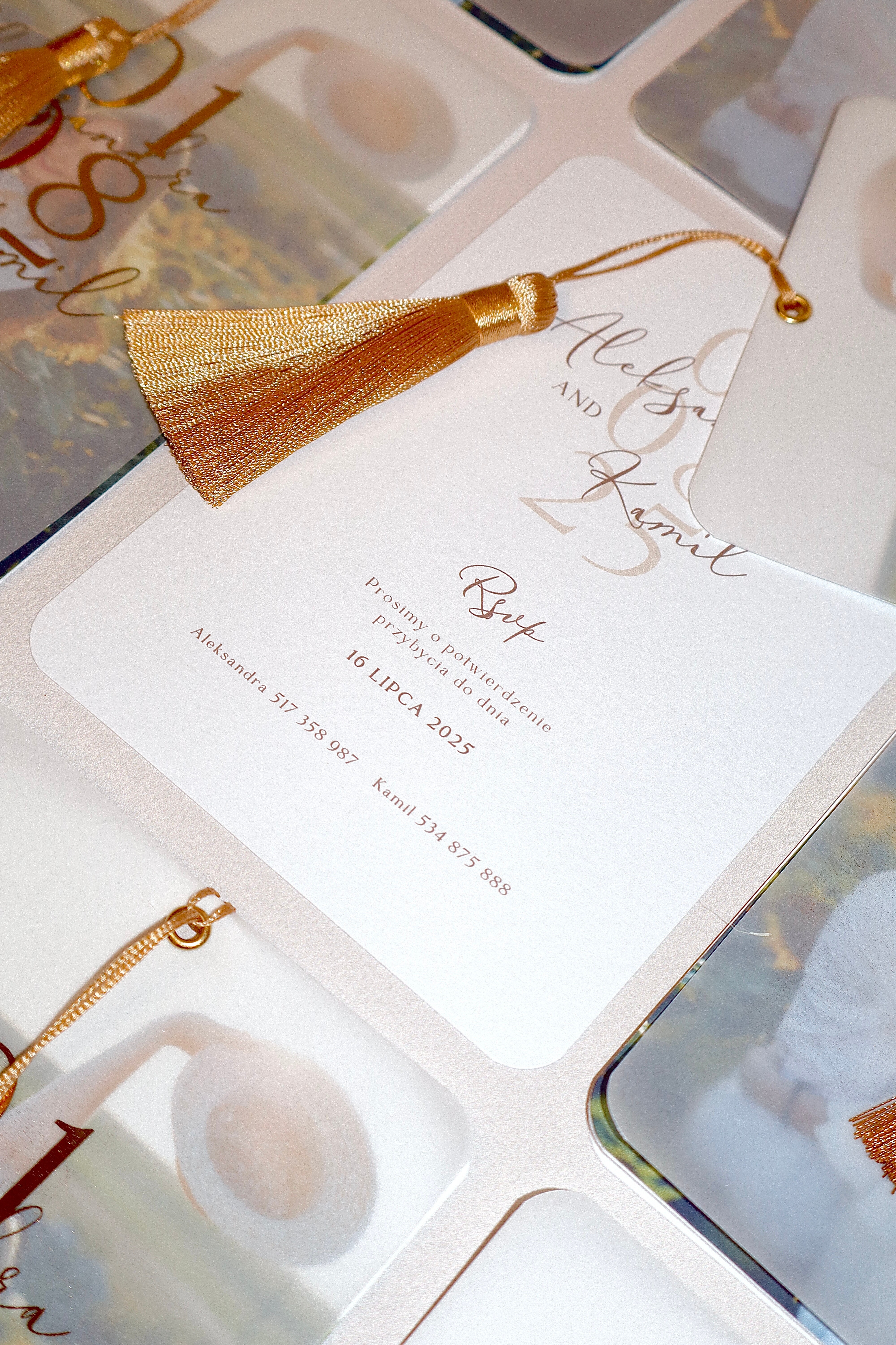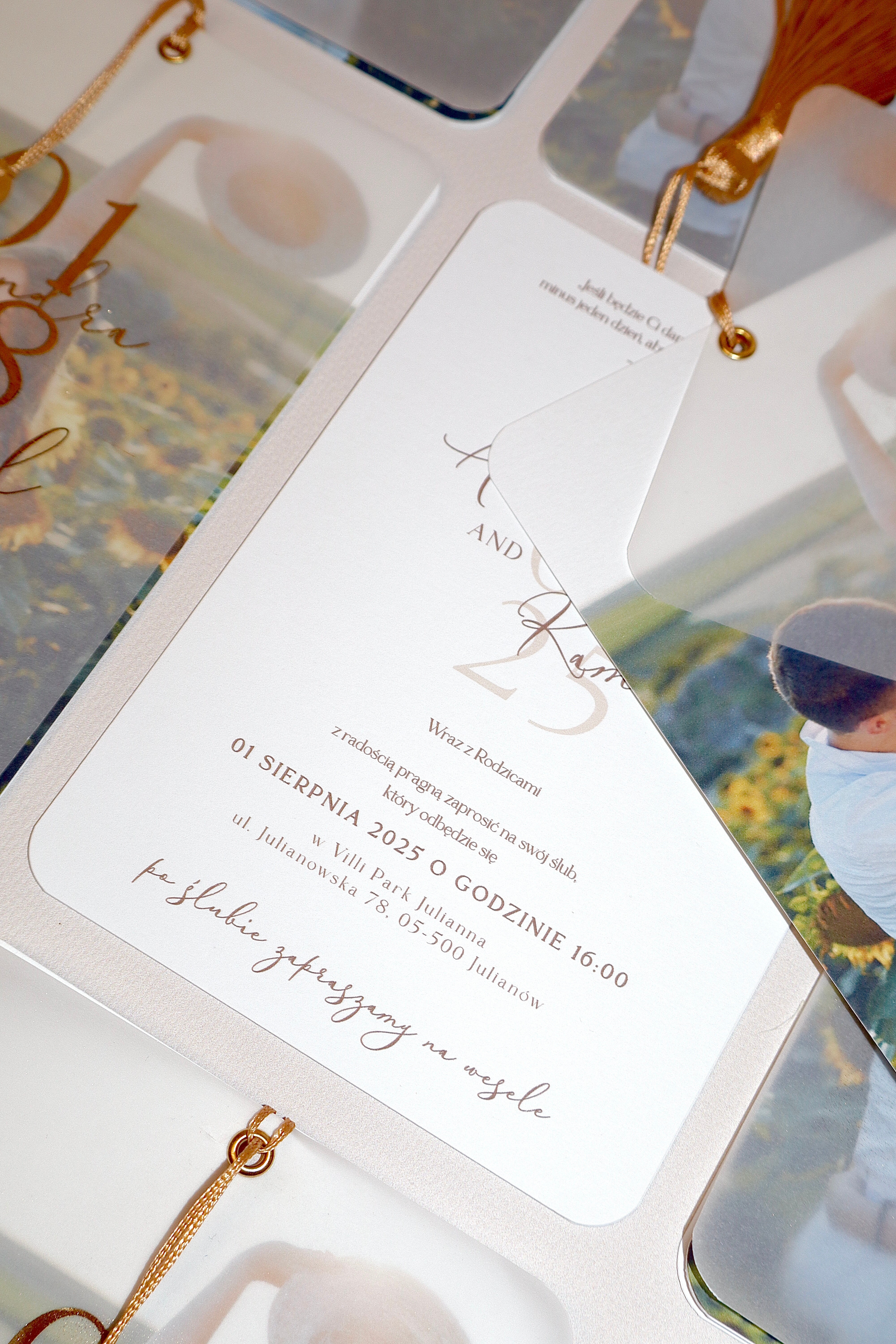 W centrum kompozycji znajduje się Wasze zdjęcie, które stanowi pierwszy, osobisty akcent zaproszenia. Delikatna kalka z nadrukiem w złotym kolorze subtelnie je przykrywa, dodając tajemniczości i luksusowego charakteru. Całość uzupełnia główna karta zaproszenia oraz bilecik informacyjny, oba drukowane na eleganckim, śmietankowym papierze o wysokiej gramaturze.