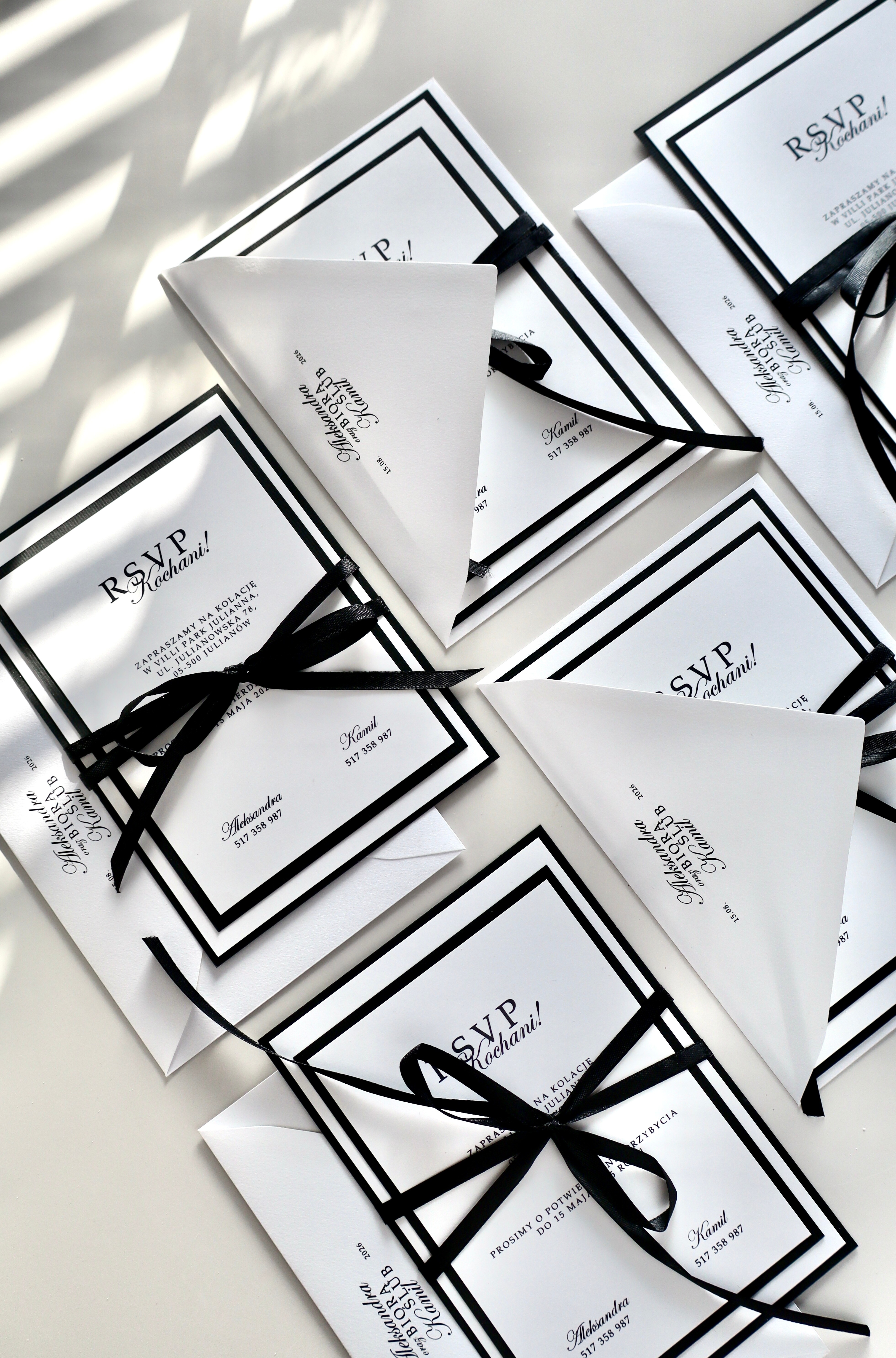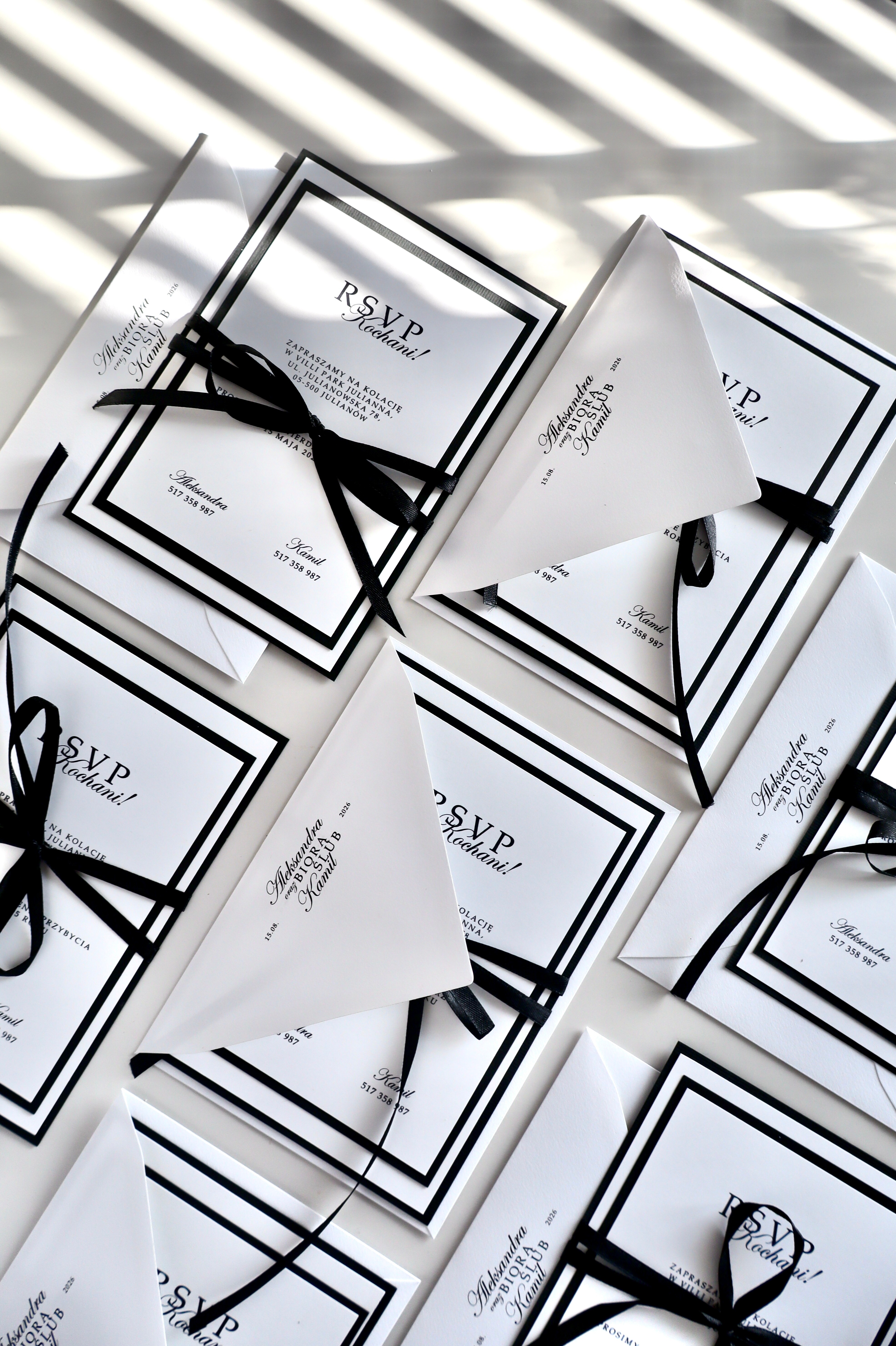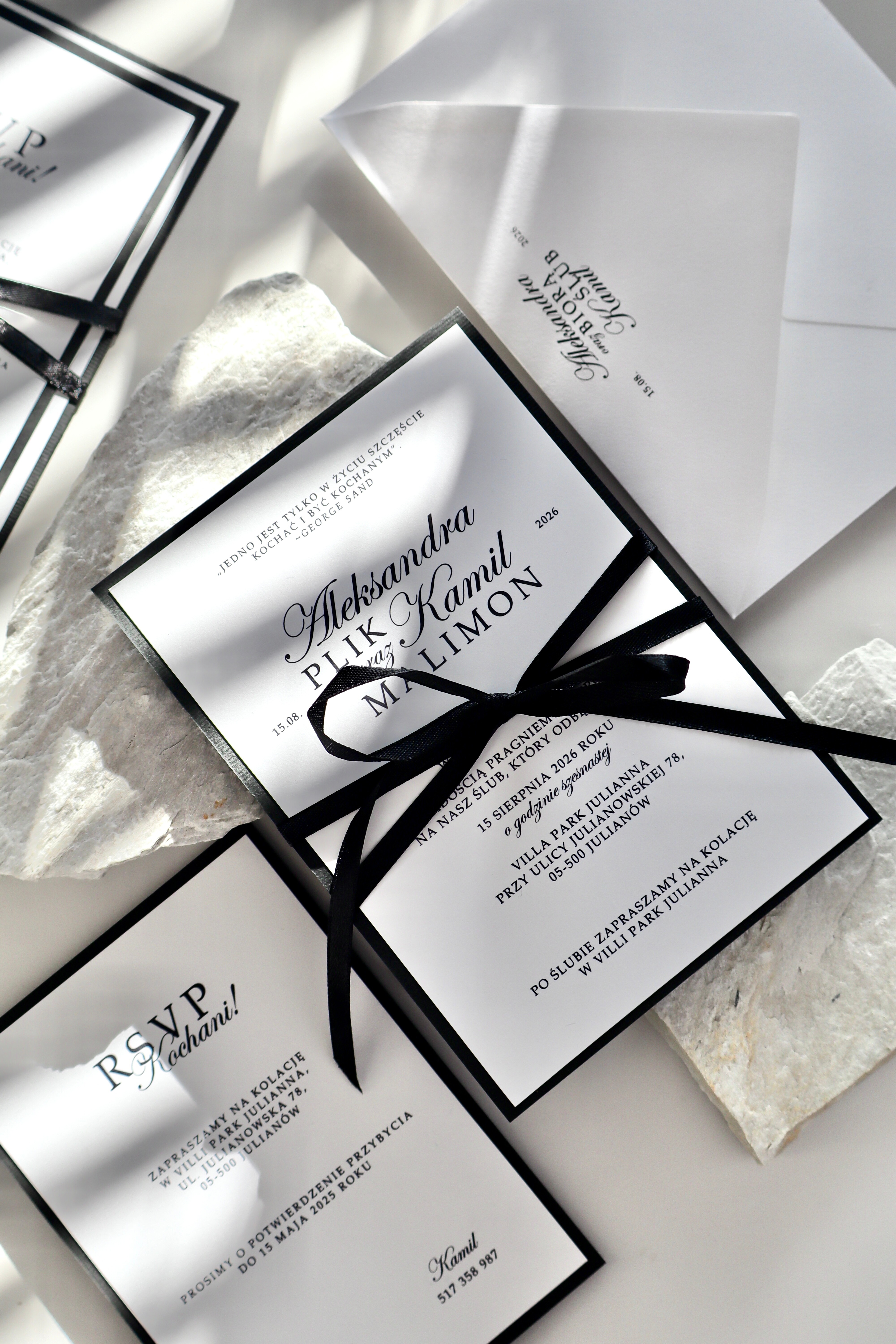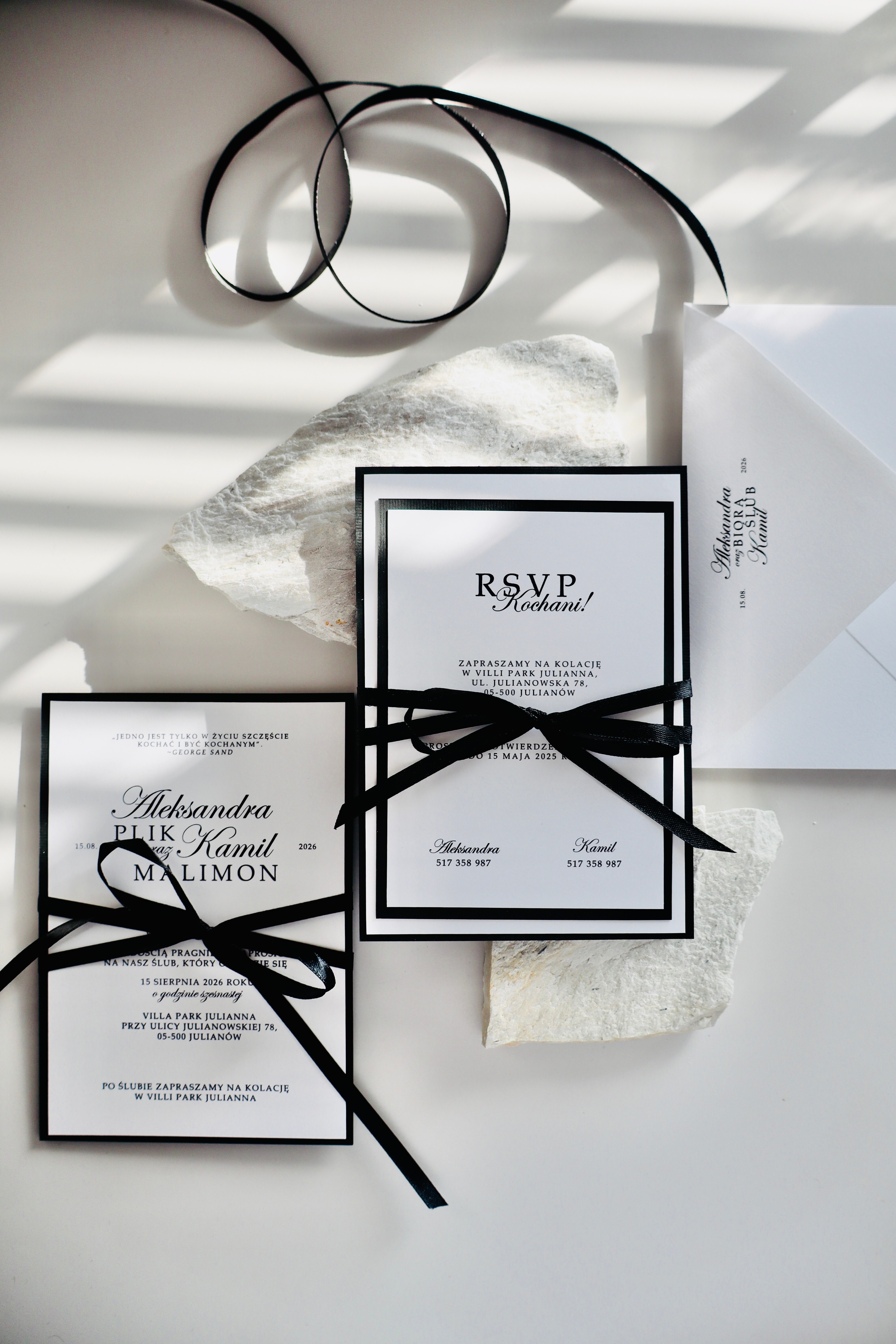 Ta kolekcja zachwyca kontrastowym połączeniem bieli i czerni, elegancką typografią oraz satynową wstążką, która dodaje wyjątkowego szyku. Prosty, ale bardzo efektowny projekt od razu wprowadza gości w wymarzony nastrój uroczystości.