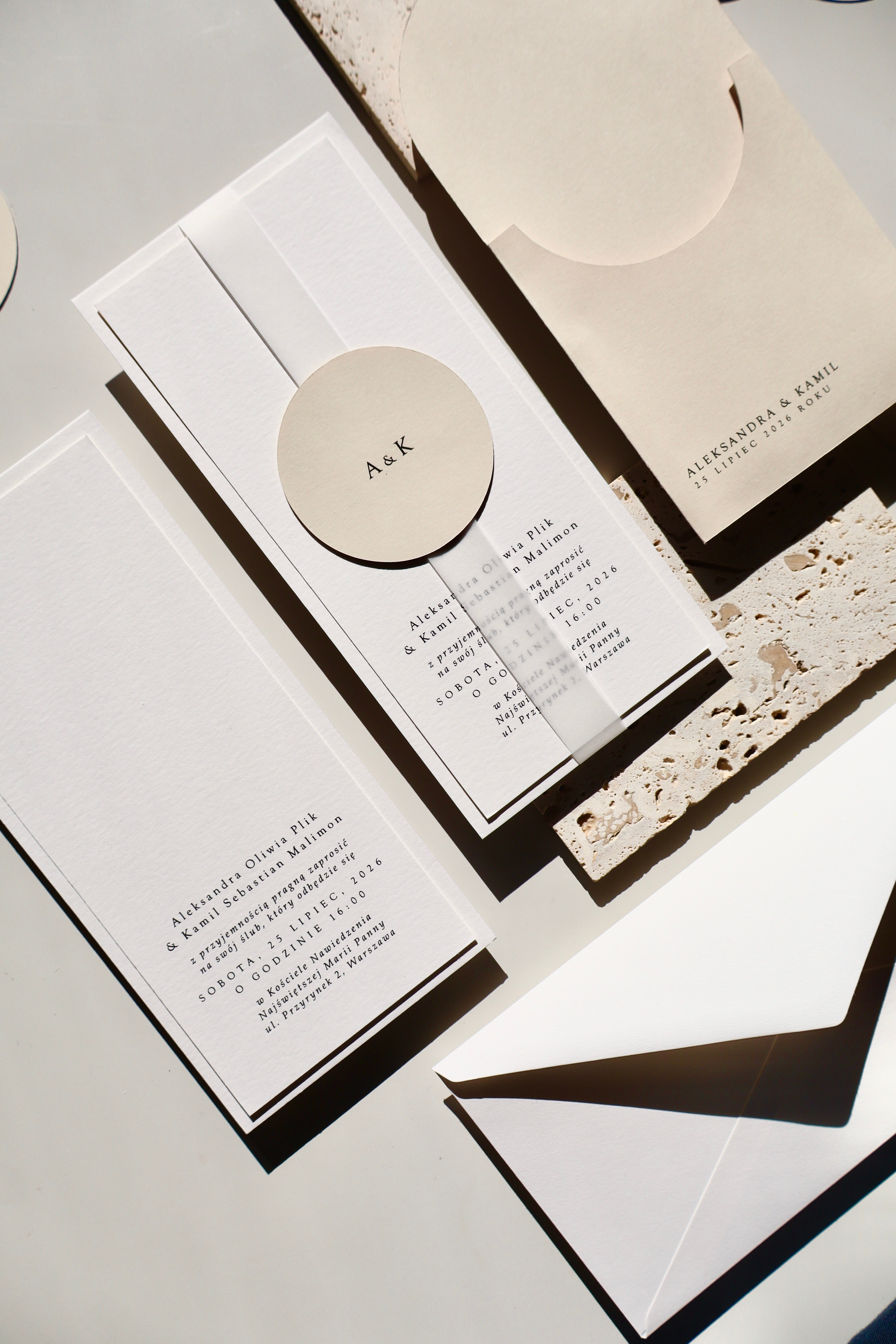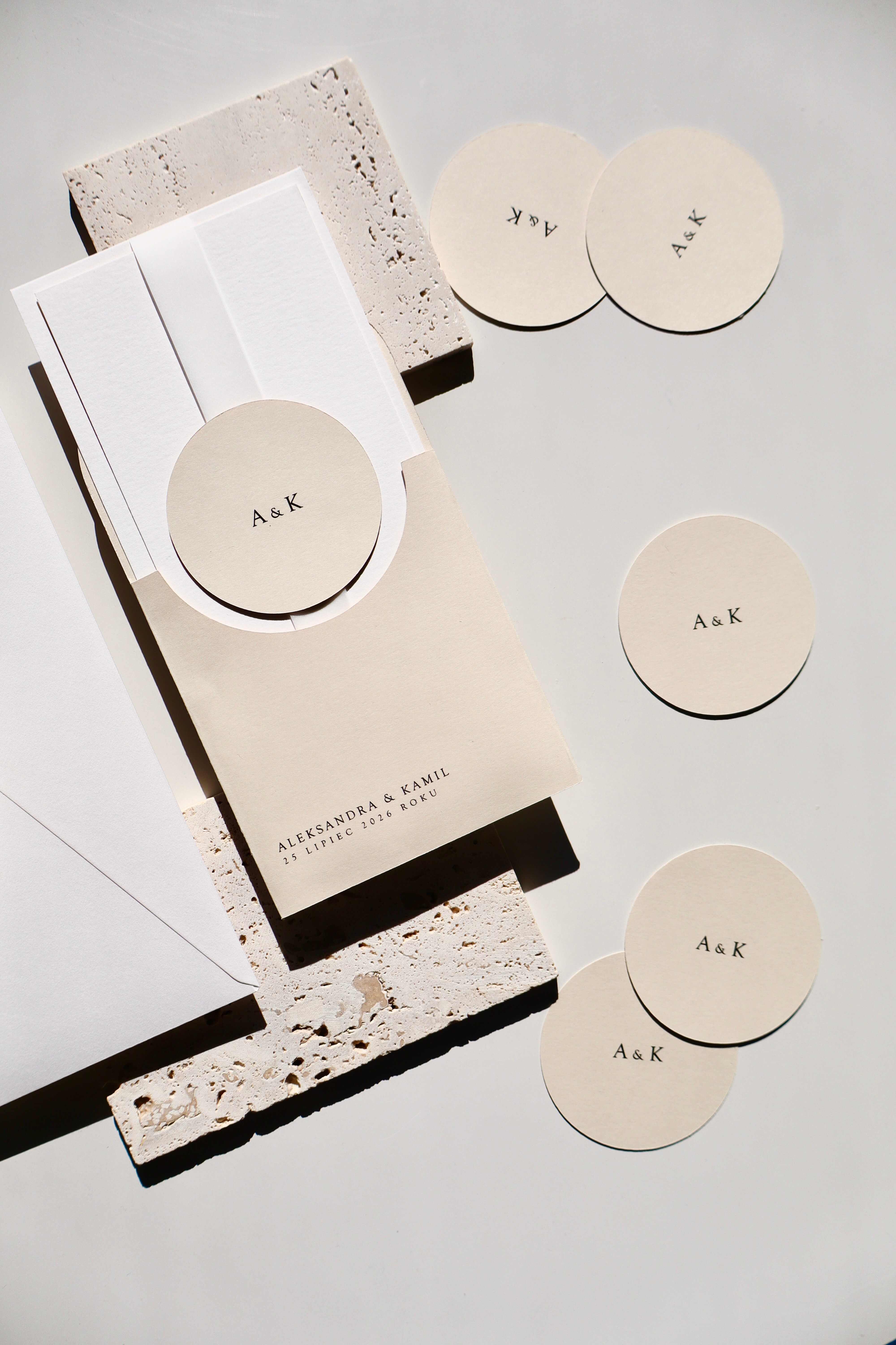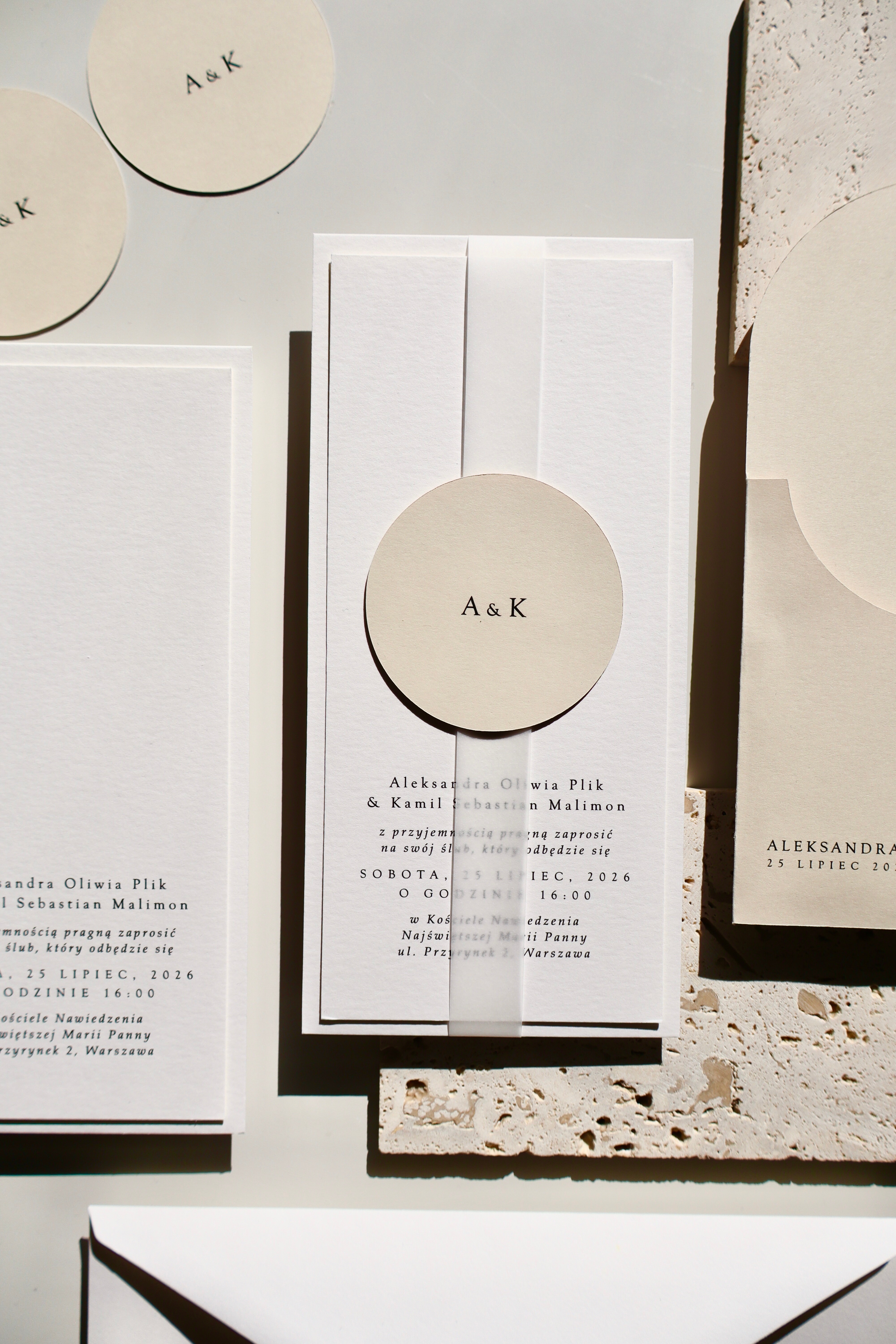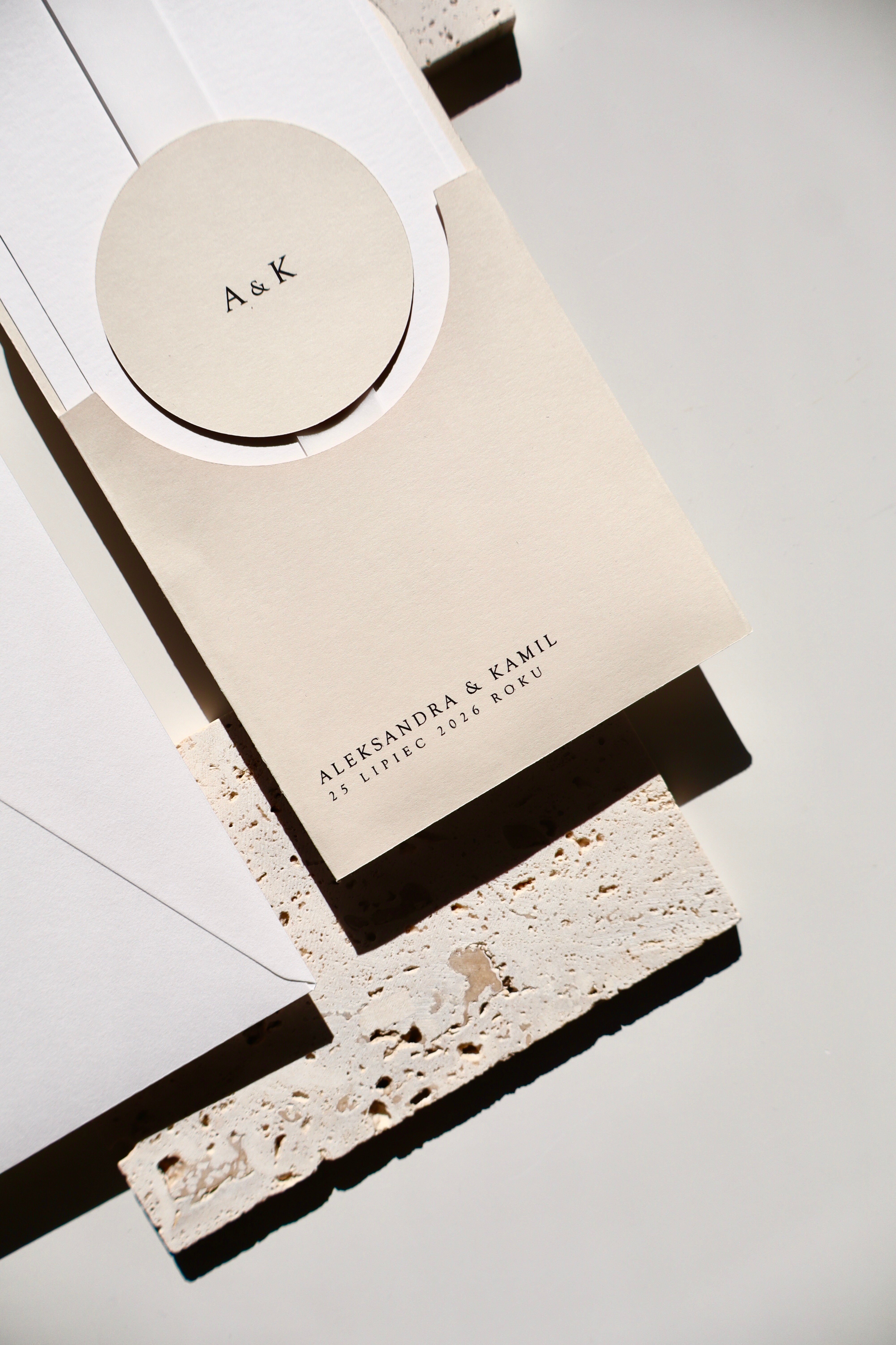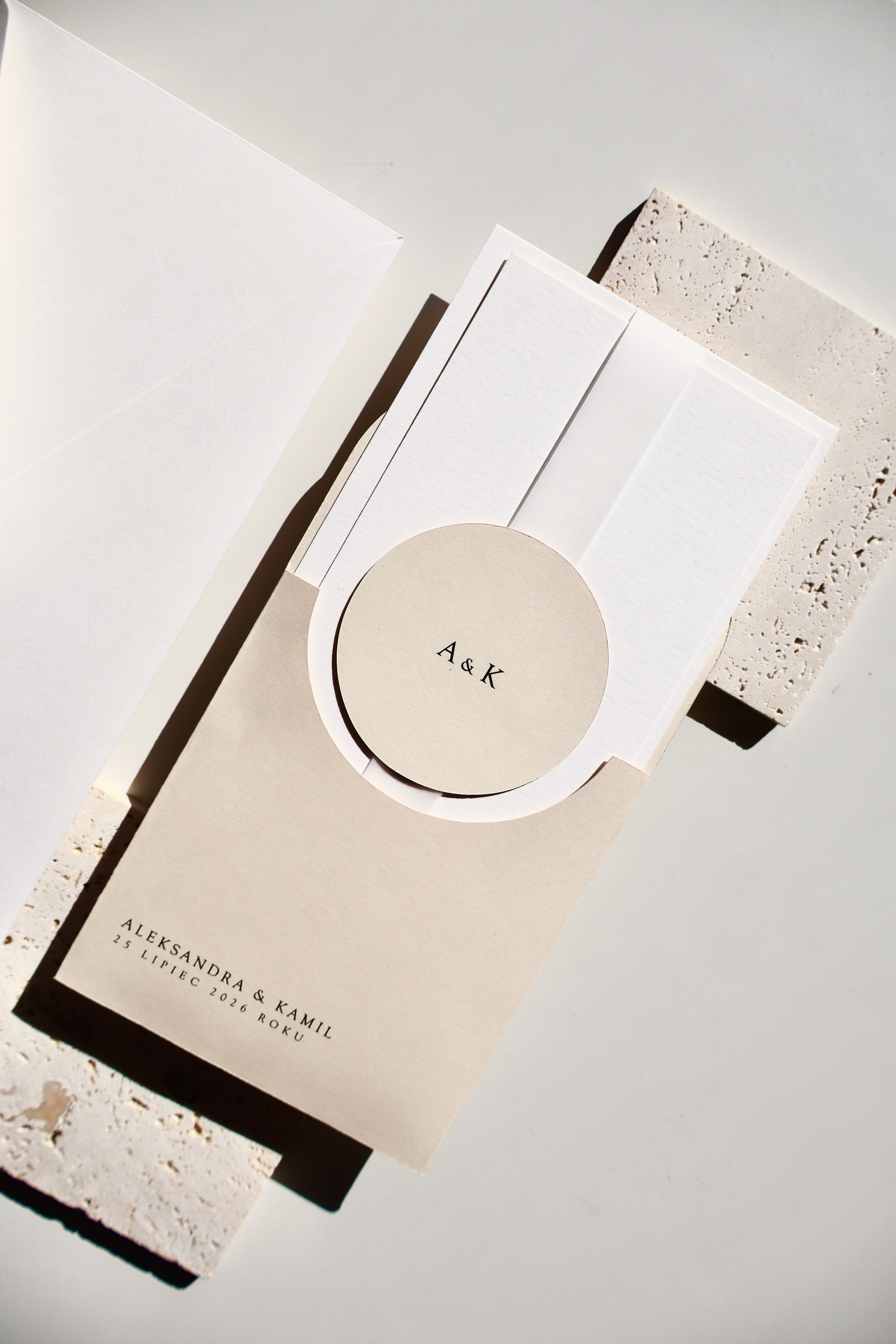 Bazą projektu jest jasny beżowy papier, wykorzystany jako elegancki folder oraz charakterystyczne okrągłe kółeczko. Ten odcień nadaje całości naturalności i subtelnego ciepła, jednocześnie wyróżniając zaproszenie na tle klasycznej bieli.