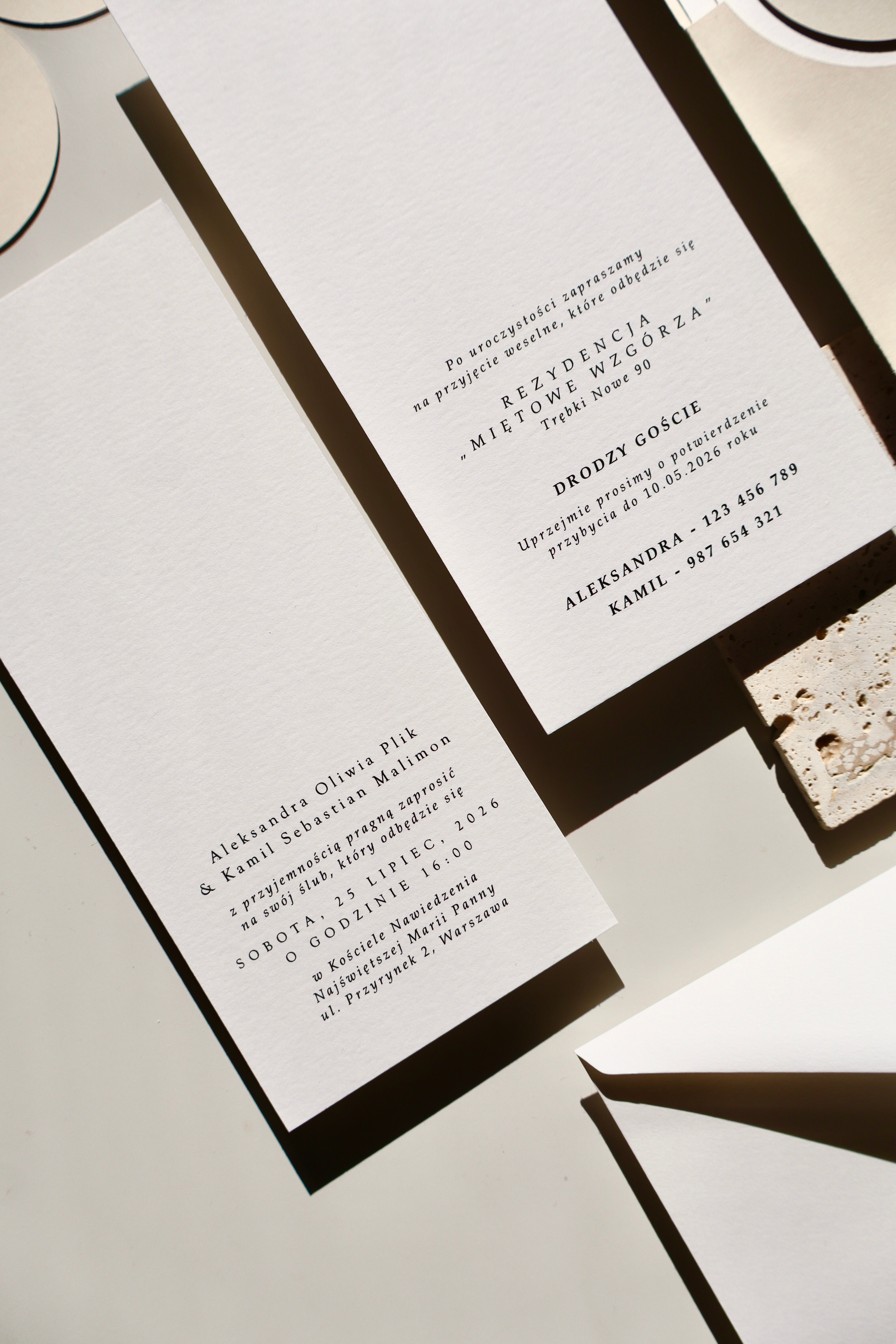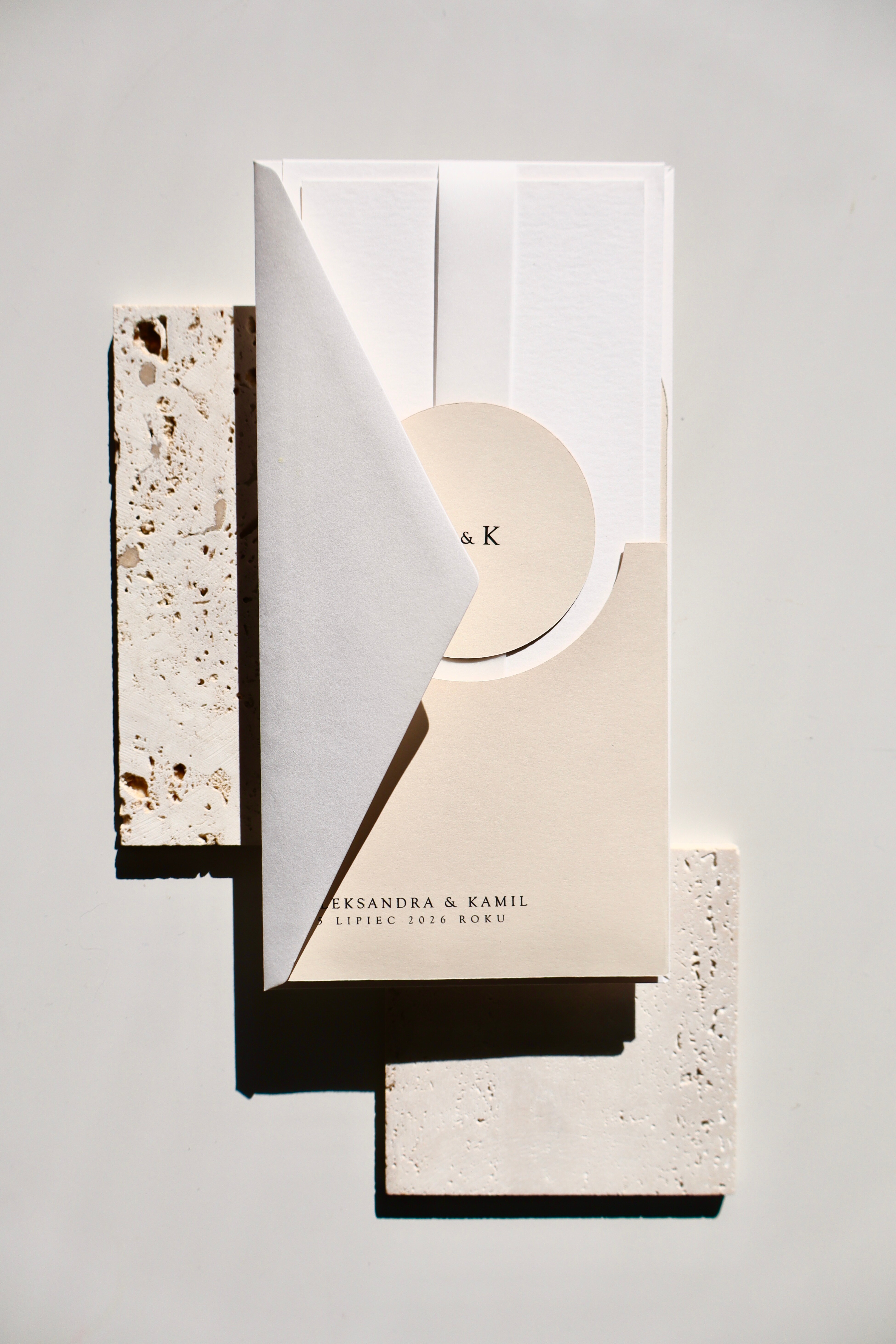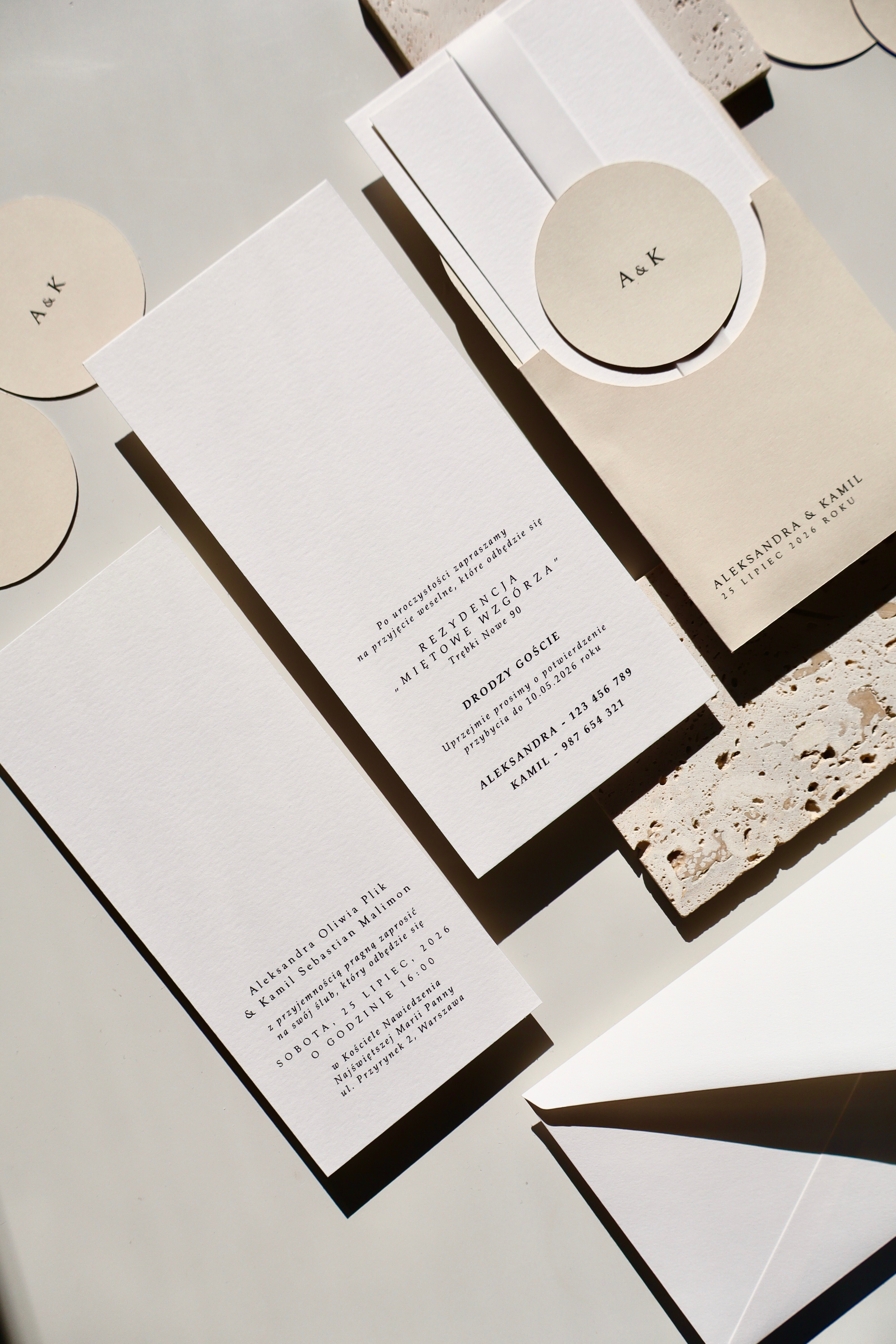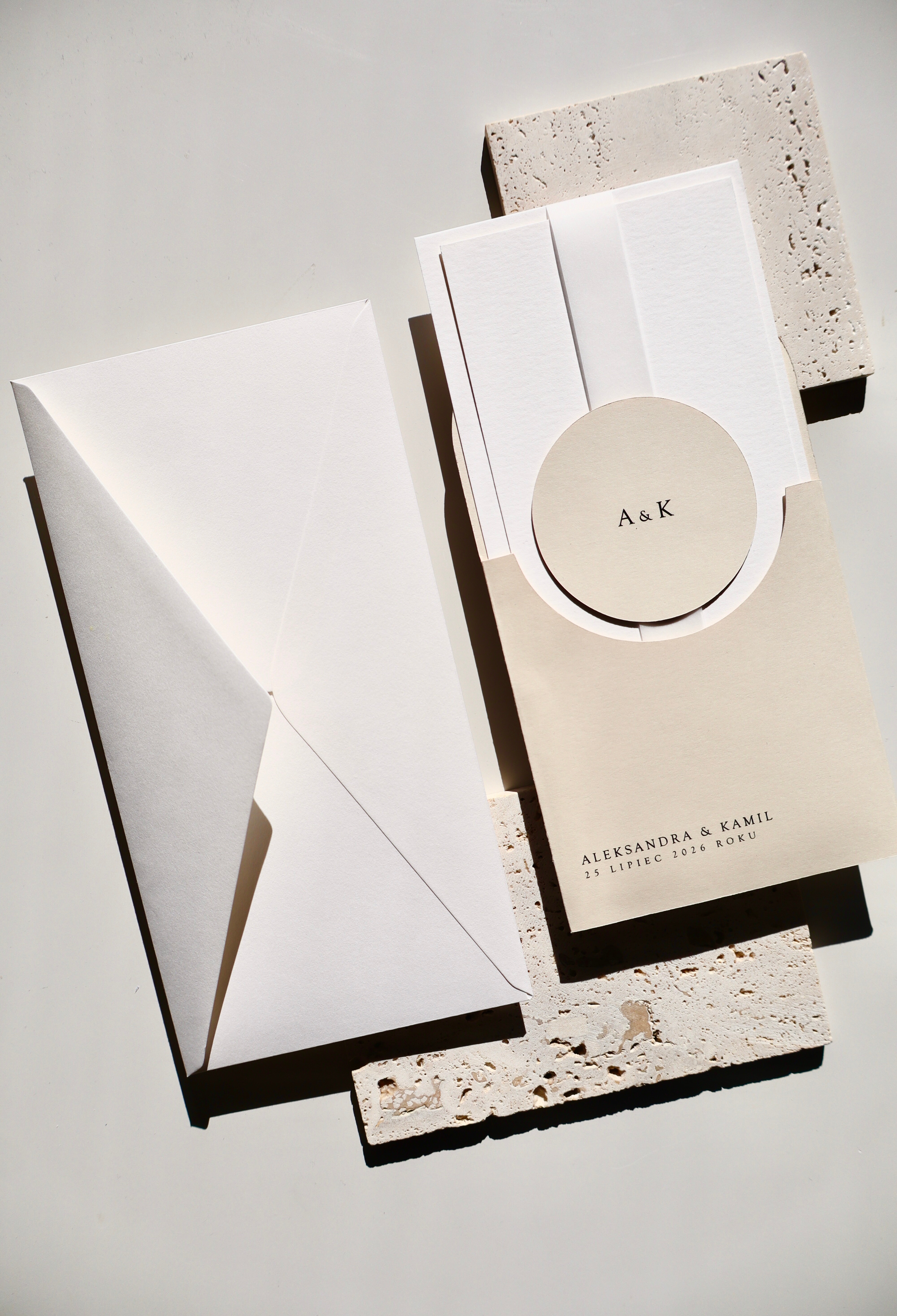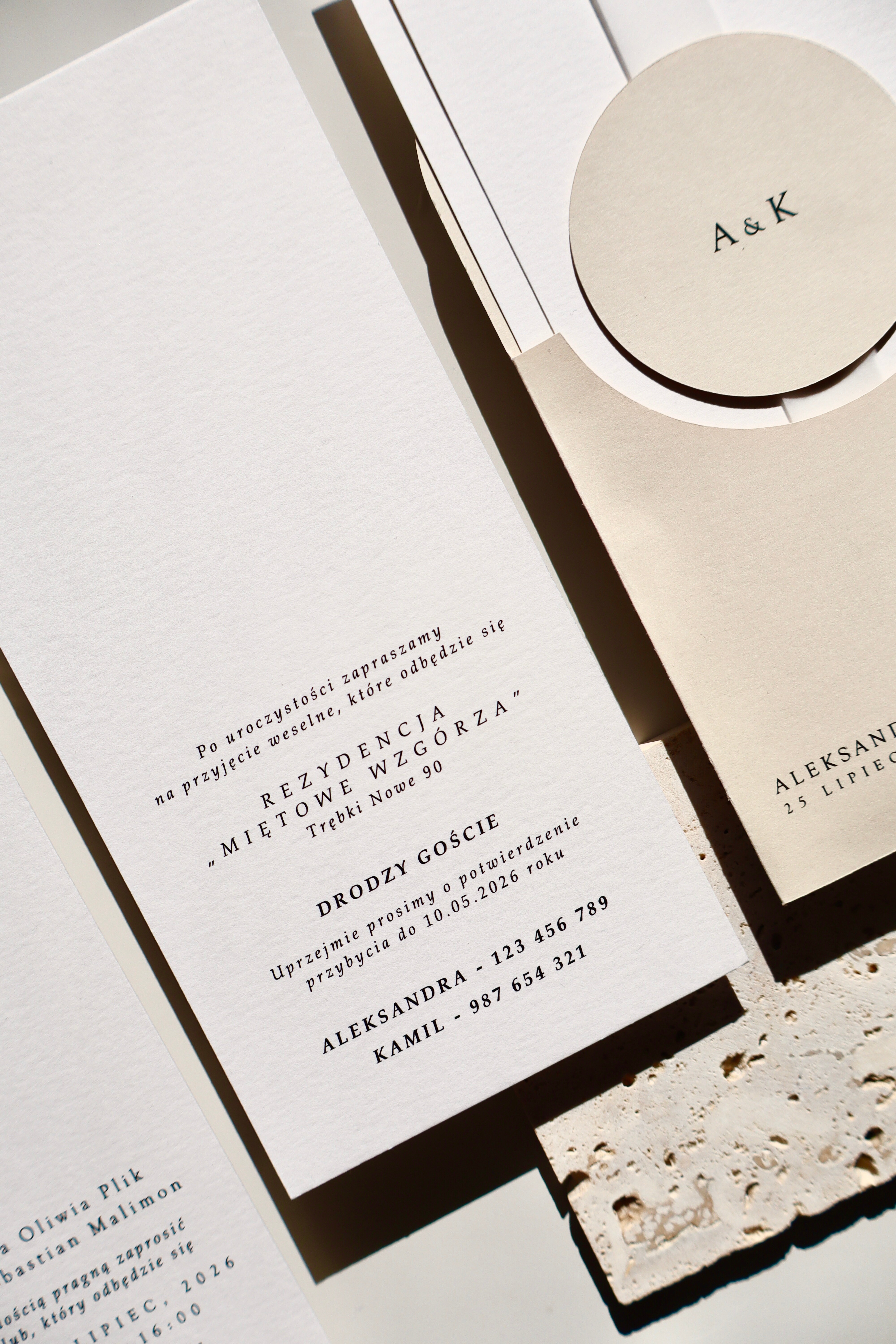 Bazą projektu jest jasny beżowy papier, wykorzystany jako elegancki folder oraz charakterystyczne okrągłe kółeczko. Ten odcień nadaje całości naturalności i subtelnego ciepła, jednocześnie wyróżniając zaproszenie na tle klasycznej bieli.