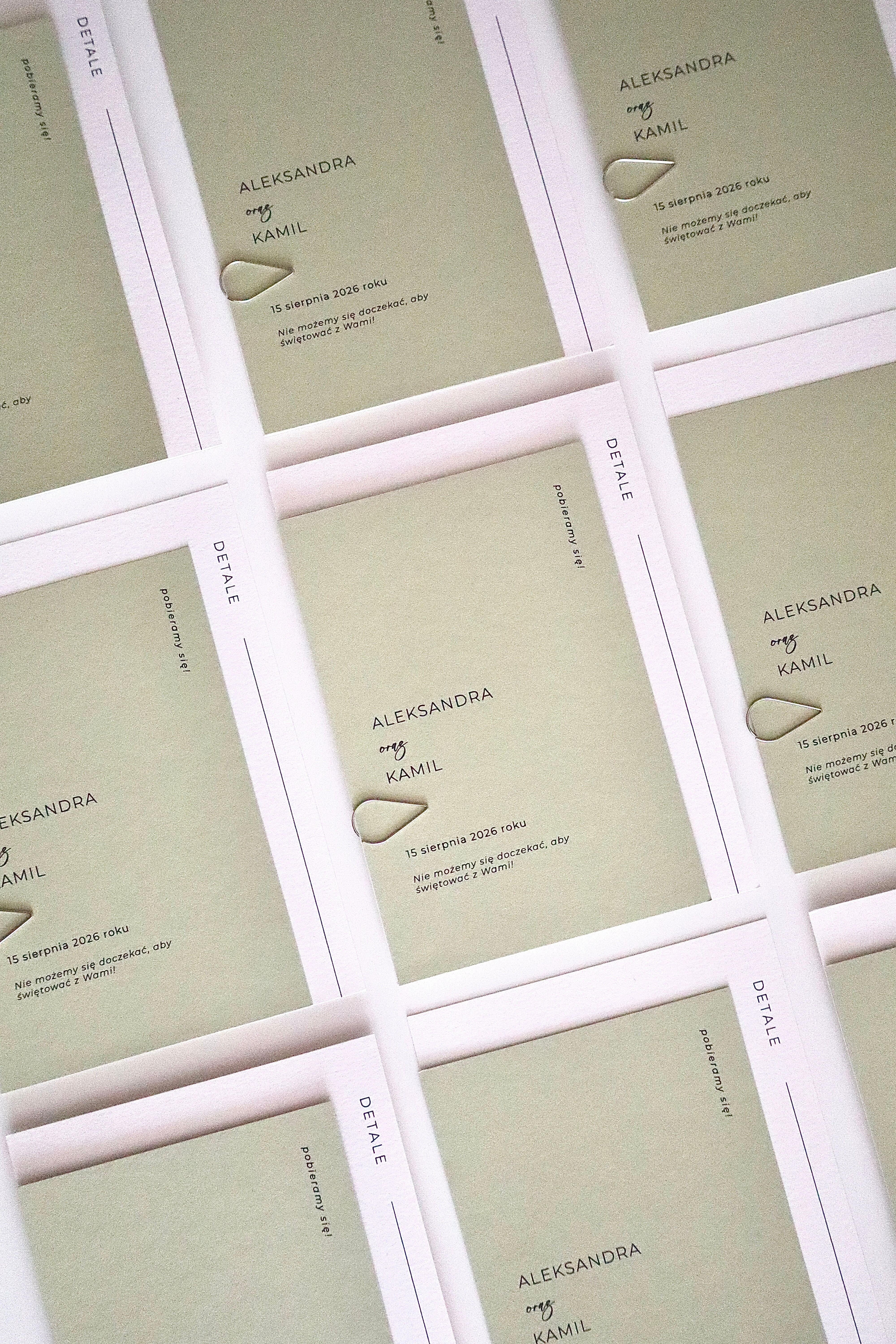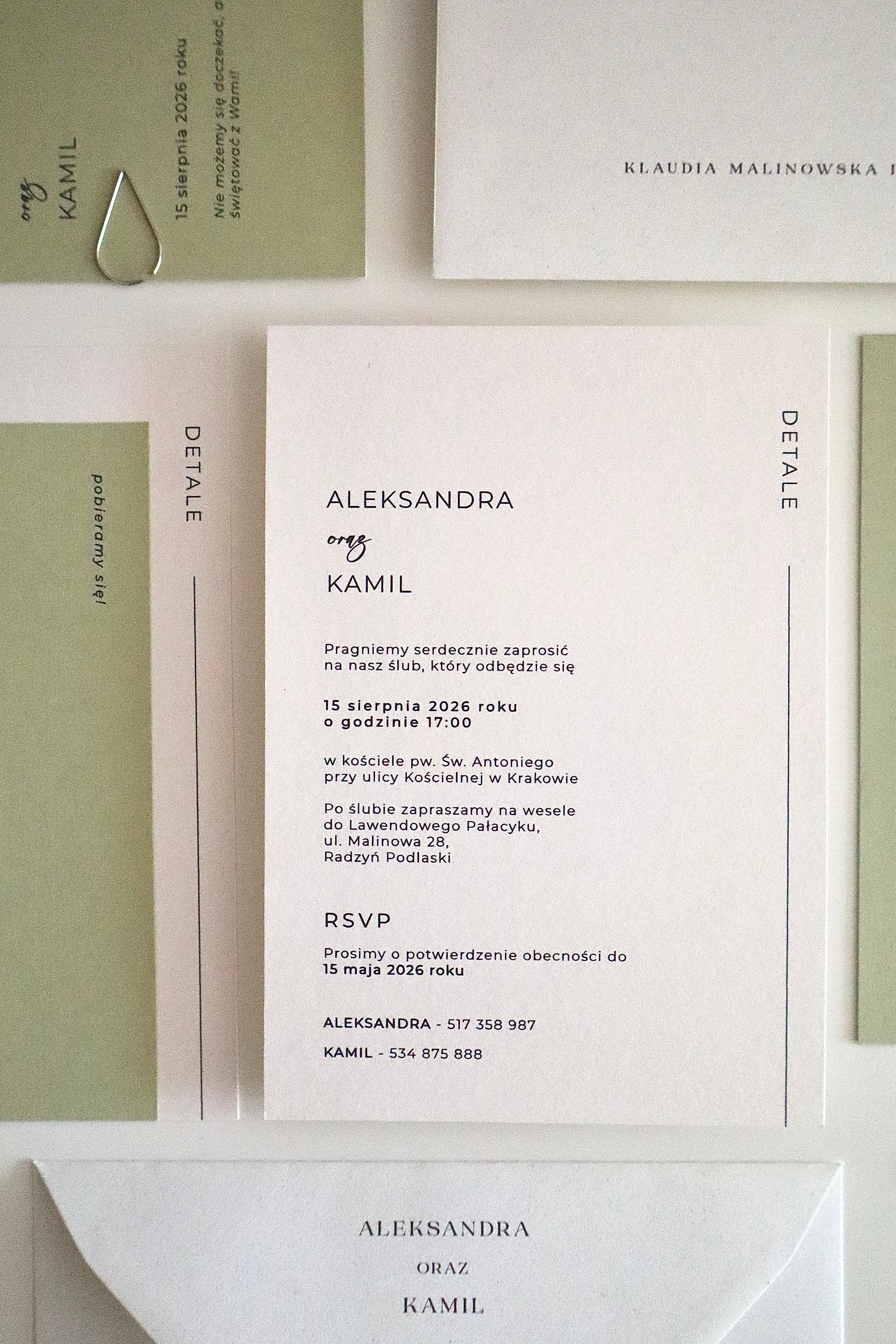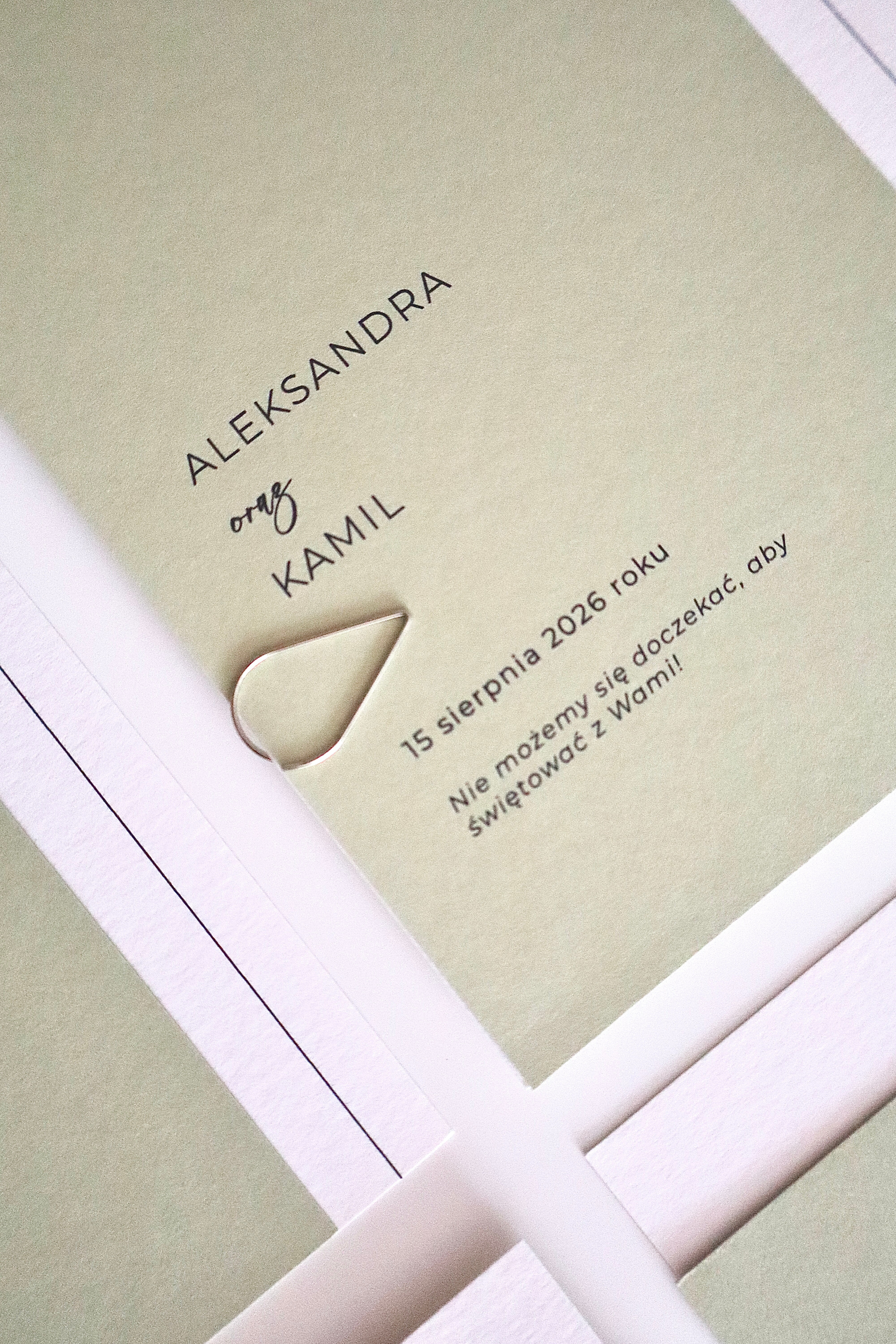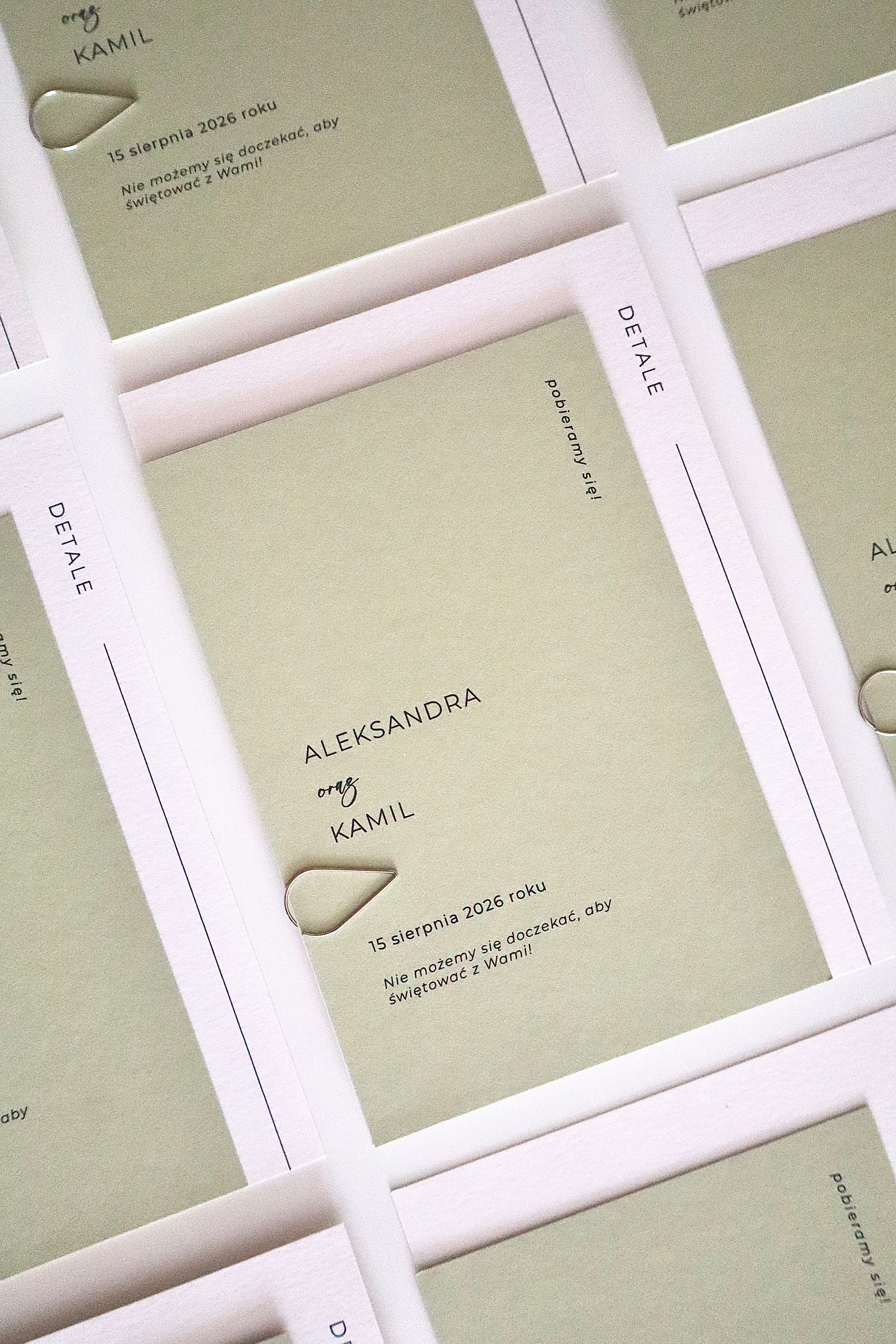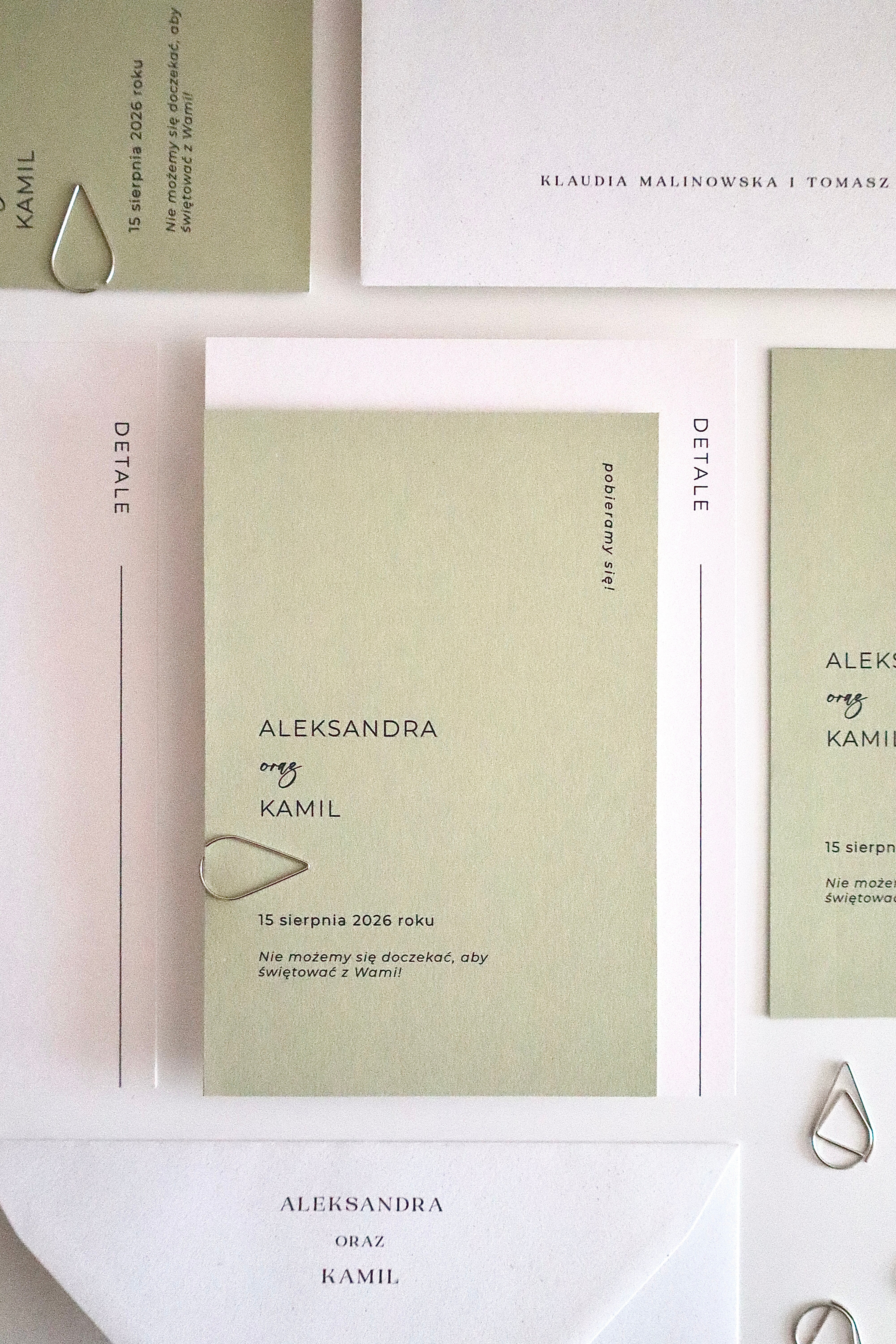 Zaproszenie składa się z dwóch warstw: okładki w odcieniu jasnej, świeżej zieleni oraz śmietankowej karty z eleganckiego, fakturowanego papieru, na której nadrukowana jest treść. Całość spięta jest srebrnym spinaczem, który nadaje projektowi nowoczesny charakter. Towarzyszy jej śmietankowa koperta o tej samej fakturze, tworząc spójną, estetyczną całość.