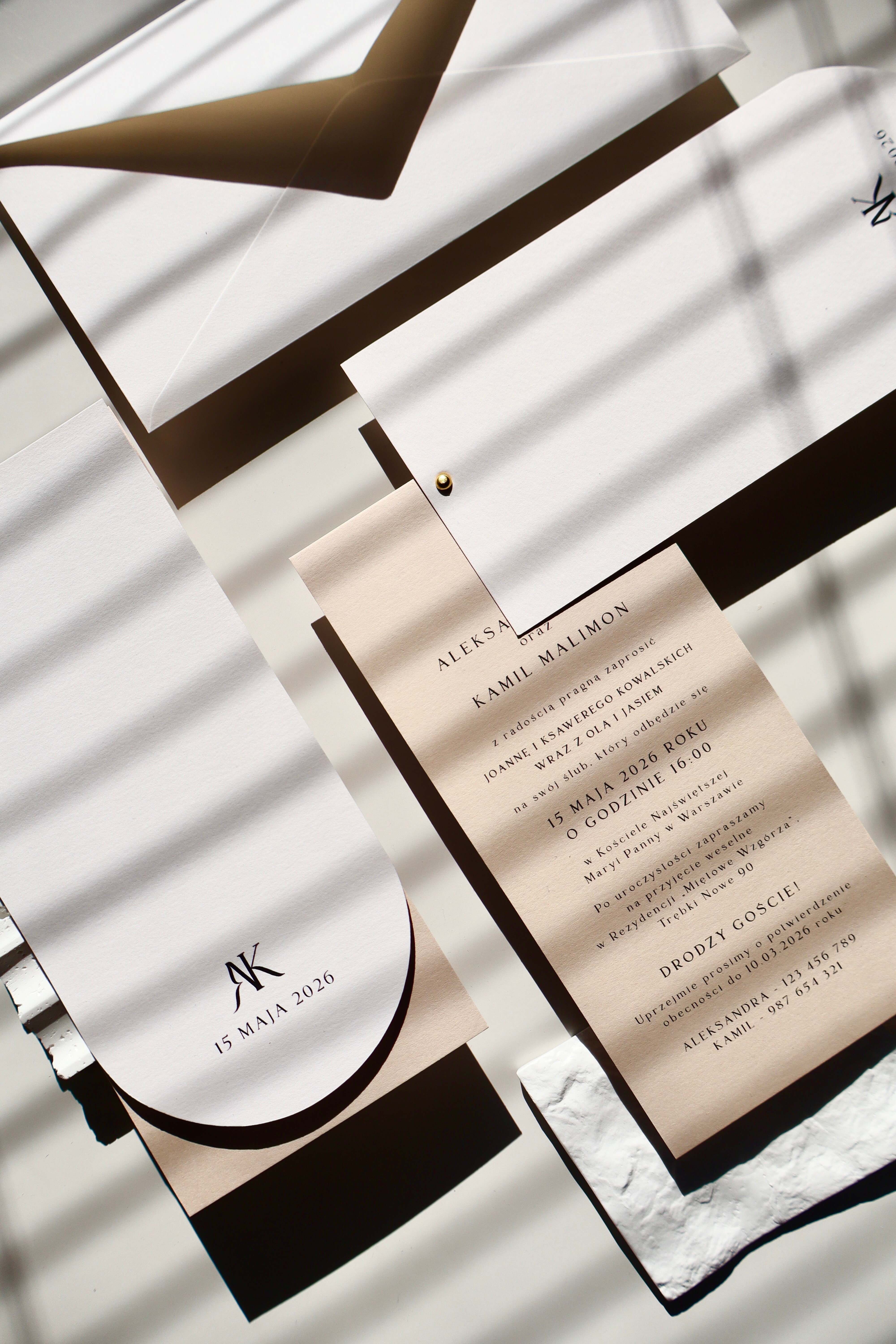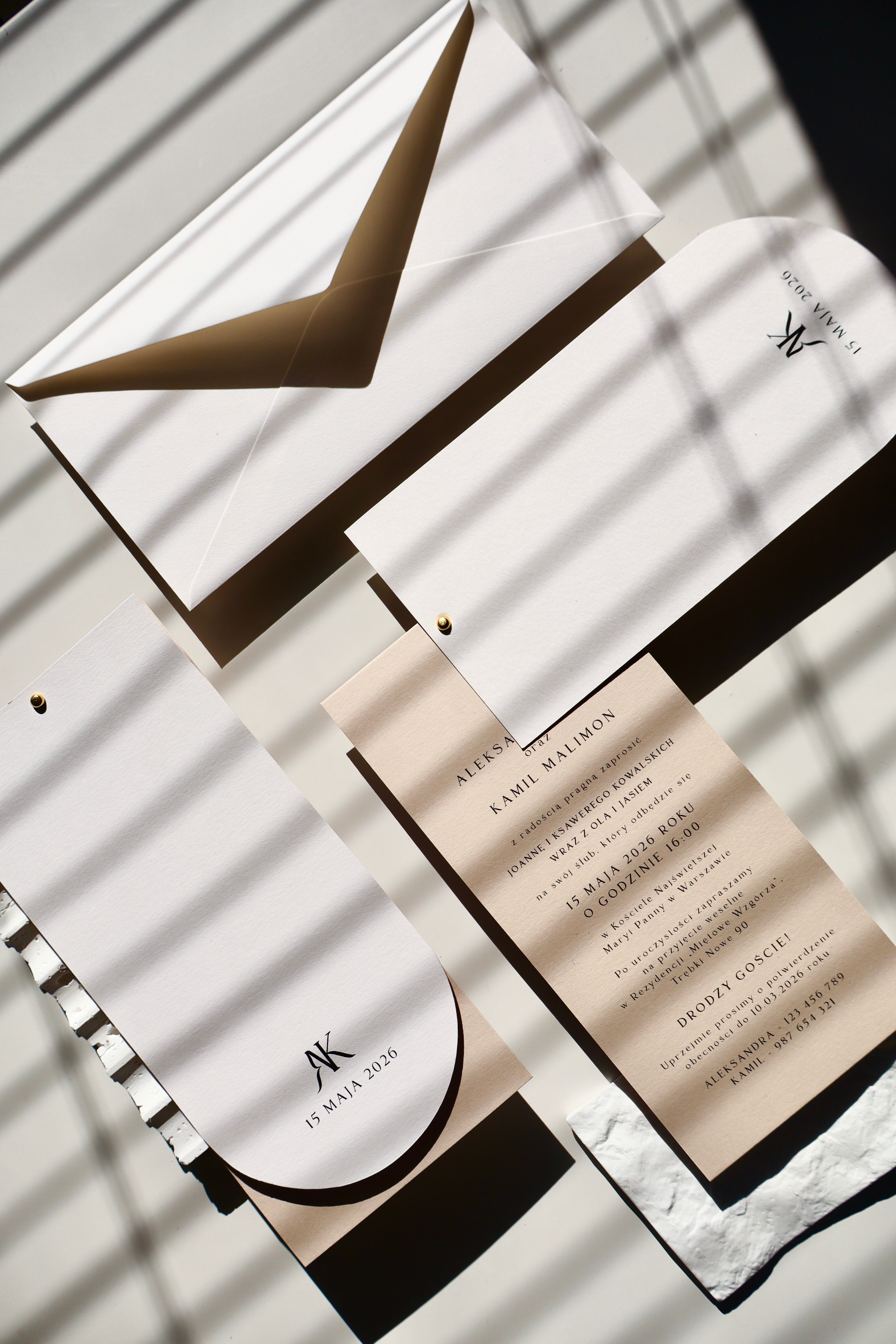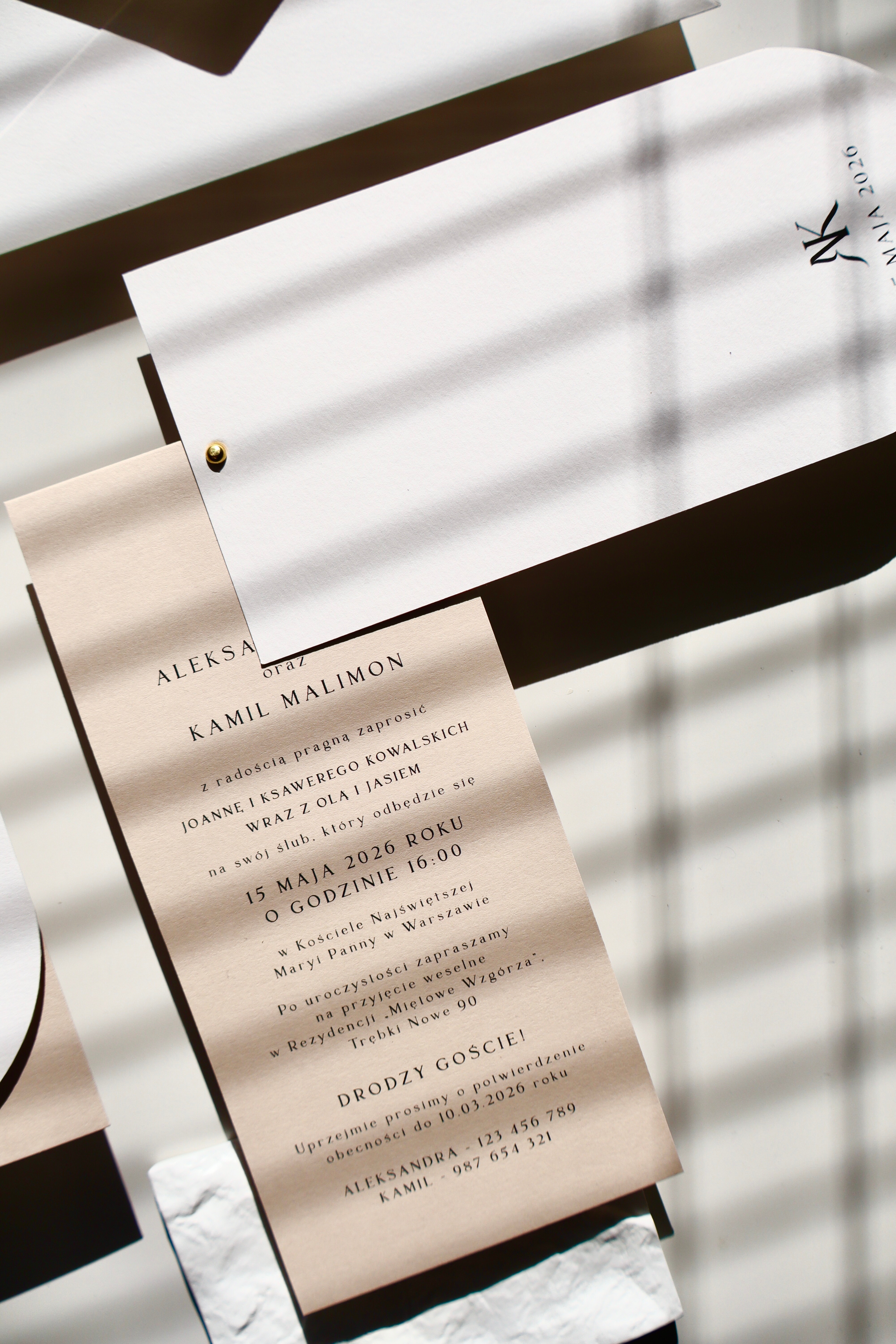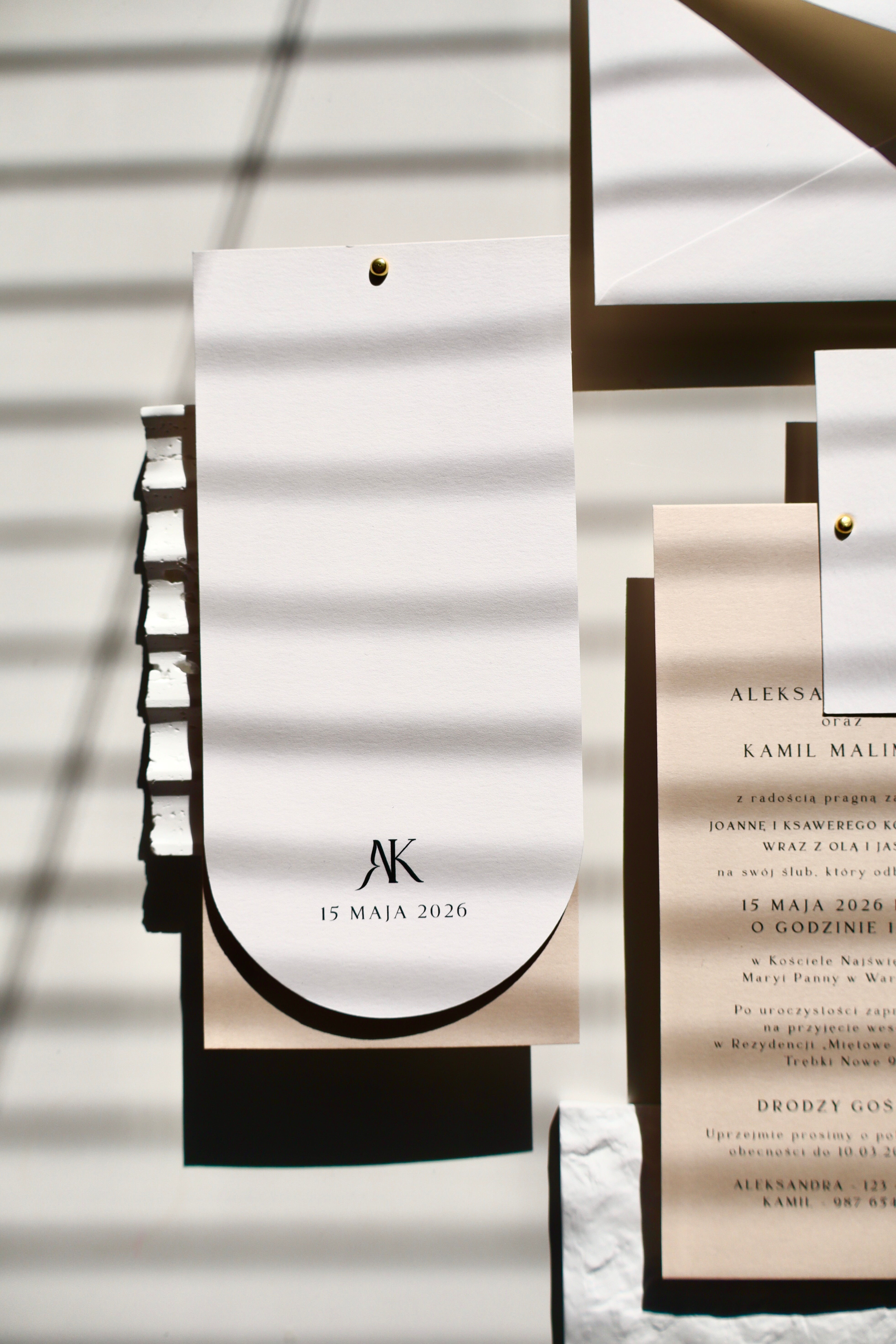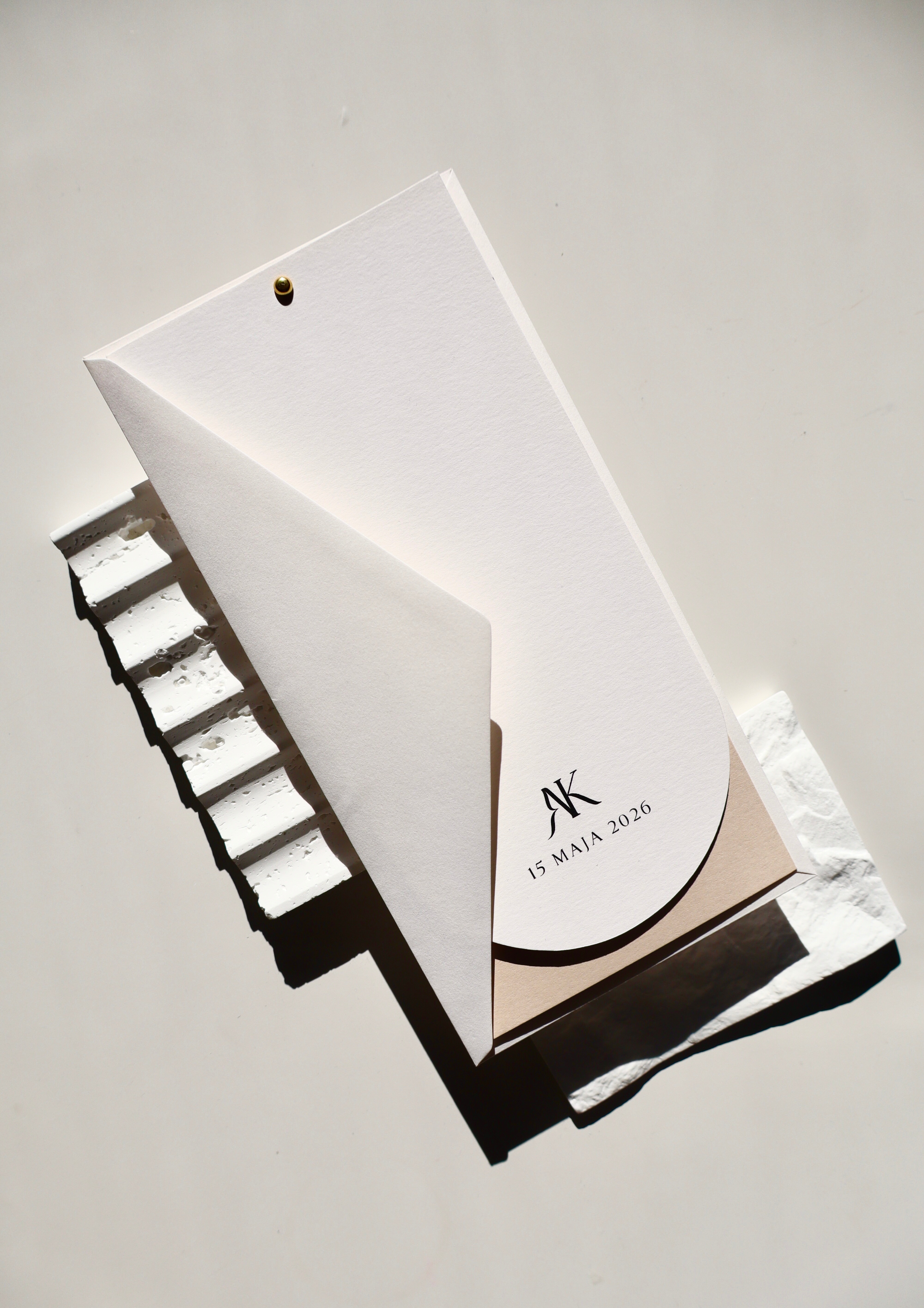 Podstawą projektu jest śmietankowy papier o delikatnej fakturze – elegancki, ciepły w odbiorze i bardziej miękki niż klasyczna biel. Nadaje zaproszeniom subtelności i sprawia, że całość wygląda bardzo szlachetnie już przy pierwszym dotyku.