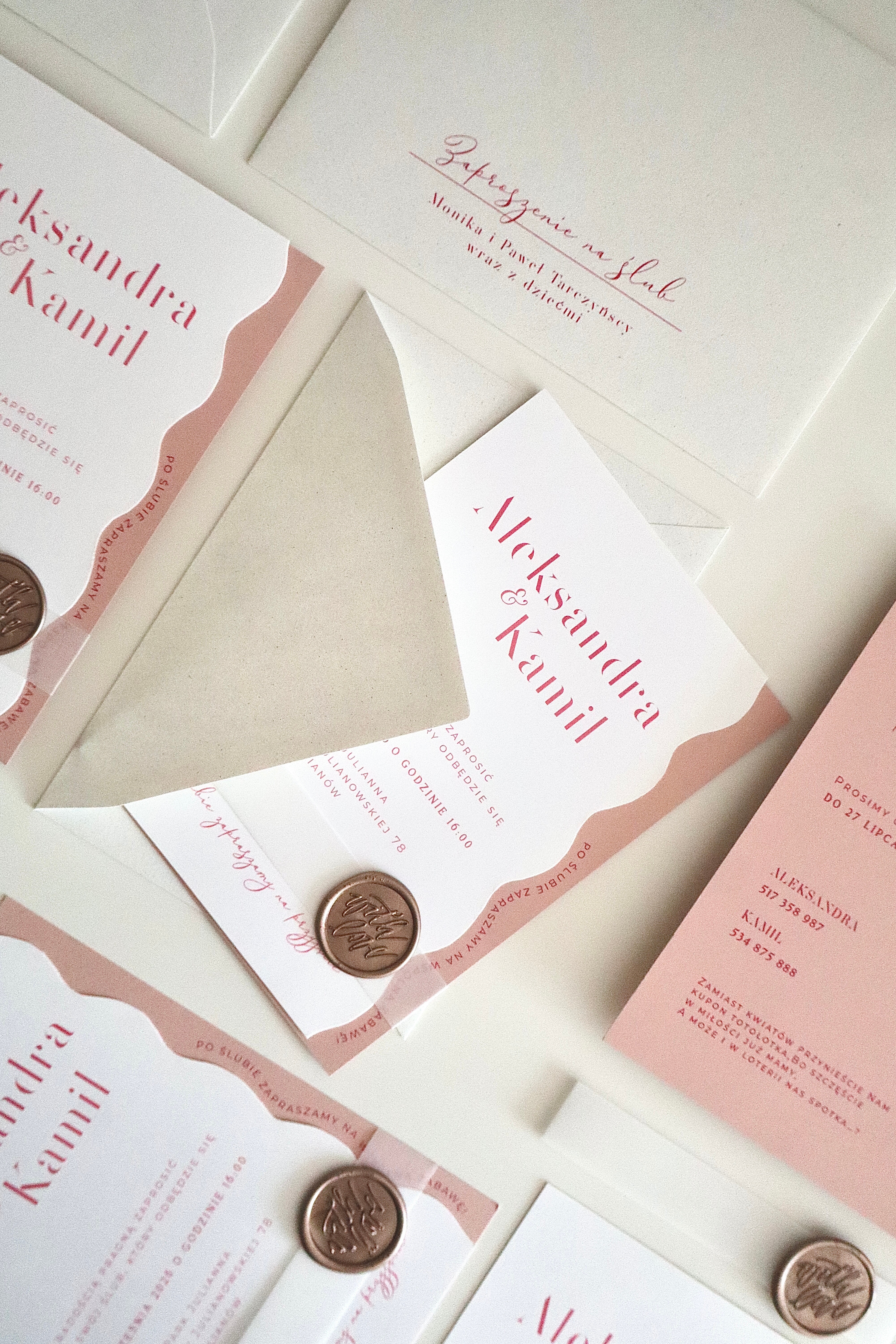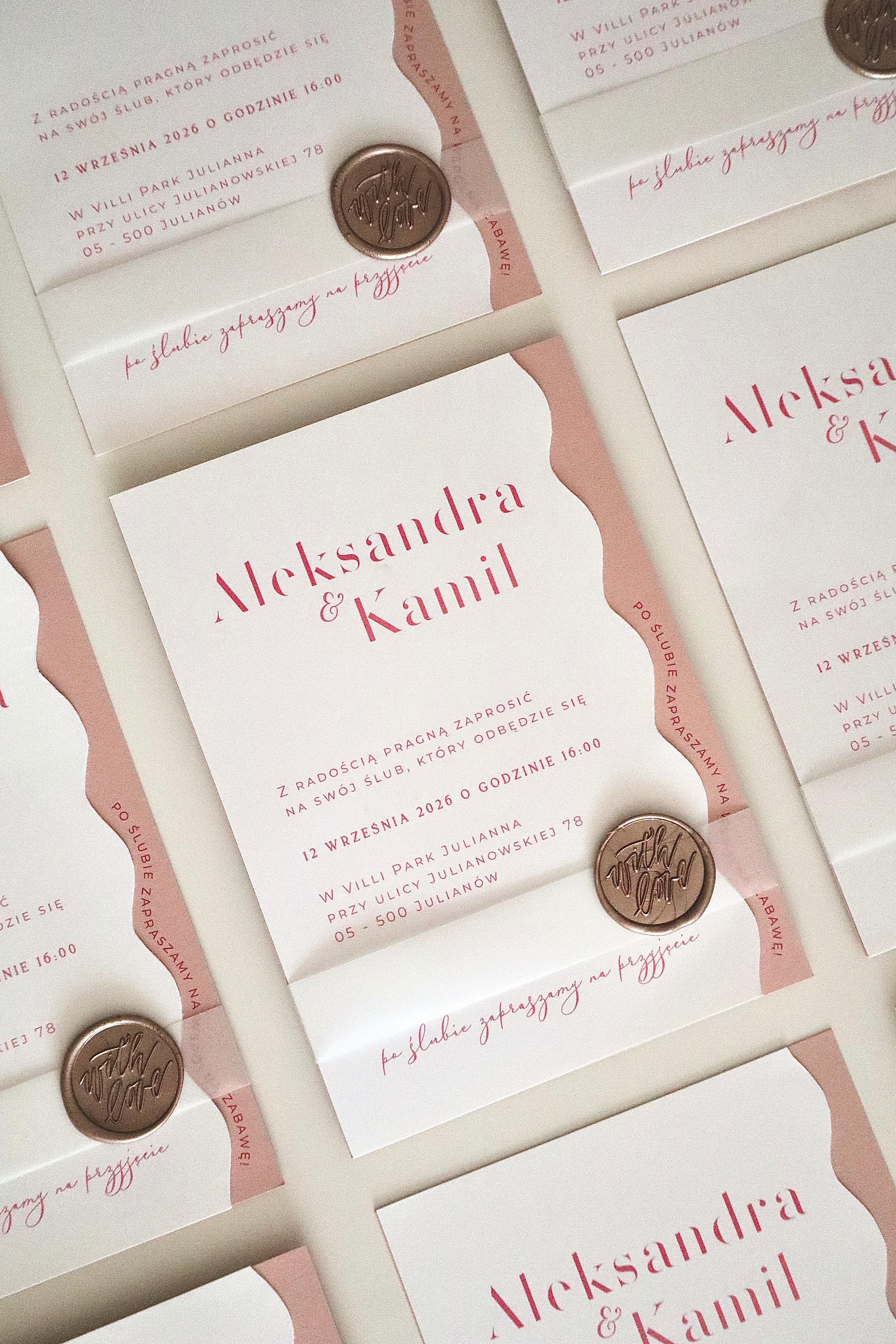 Charakterystyczny falowany brzeg głównej karty, pudrowo-różowa kolorystyka i elegancka, nowoczesna typografia tworzą harmonijną, lekką całość. Zestaw spięty jest przezroczystą opaską i ozdobiony lakową pieczęcią w odcieniu cappuccino — to detal, który przyciąga uwagę i nadaje zaproszeniom ekskluzywnego charakteru.