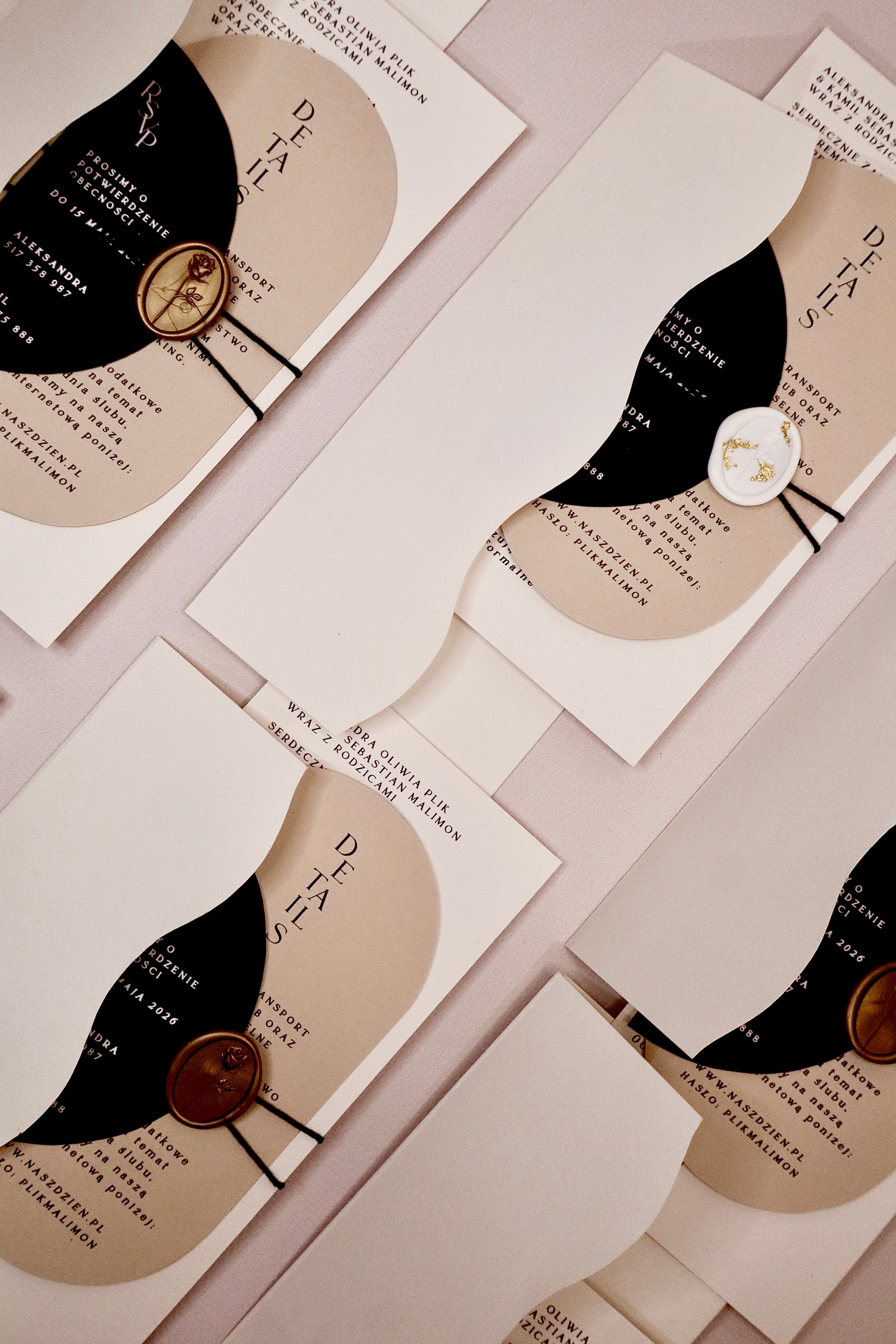 Geometryczne kształty, lakowe pieczęcie i inne detale nadają zaproszeniom wyjątkowej głębi i charakteru. Każdy element został zaprojektowany z myślą o nowoczesnych parach, które chcą podkreślić swój styl i dbałość o detale już od pierwszego wrażenia.