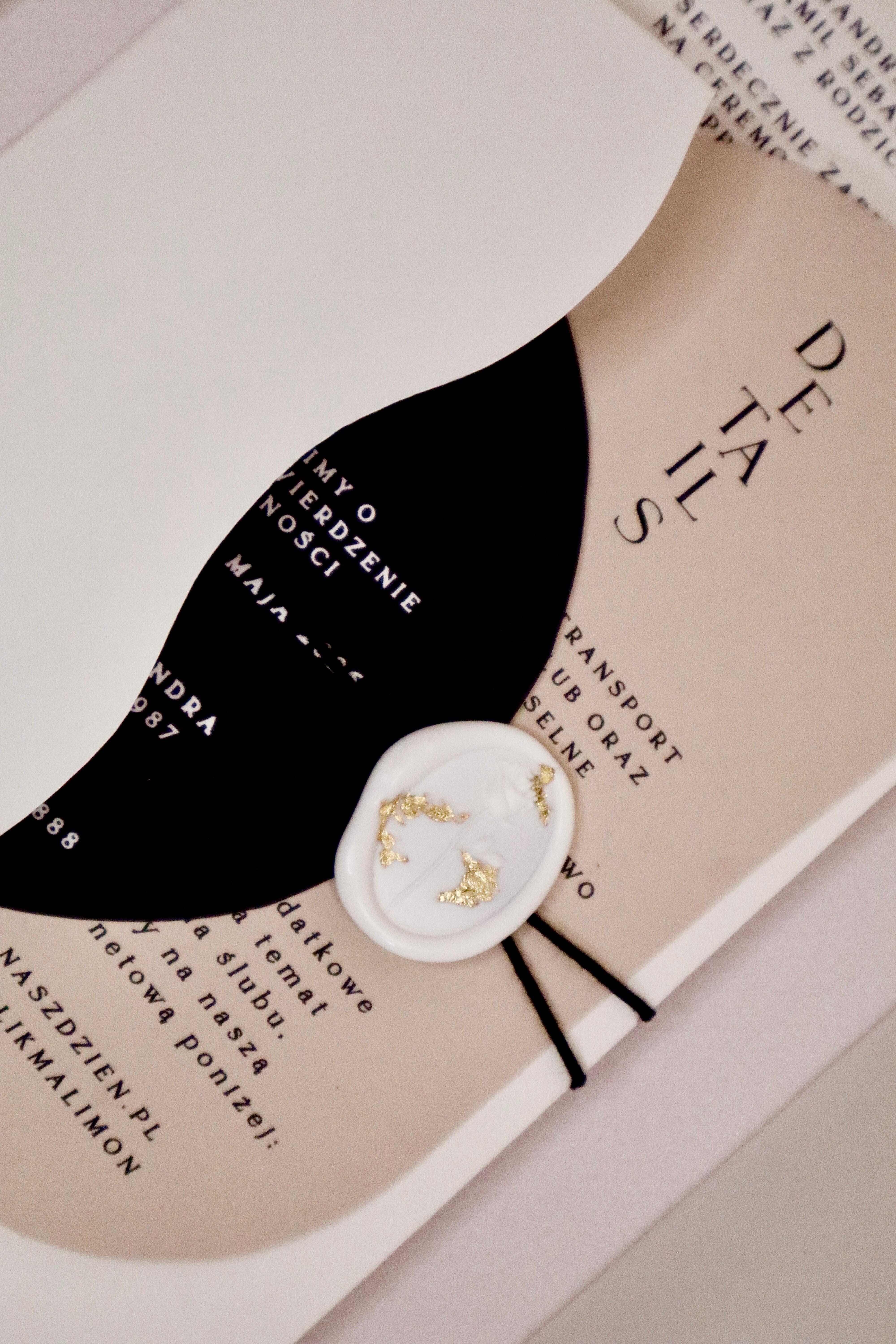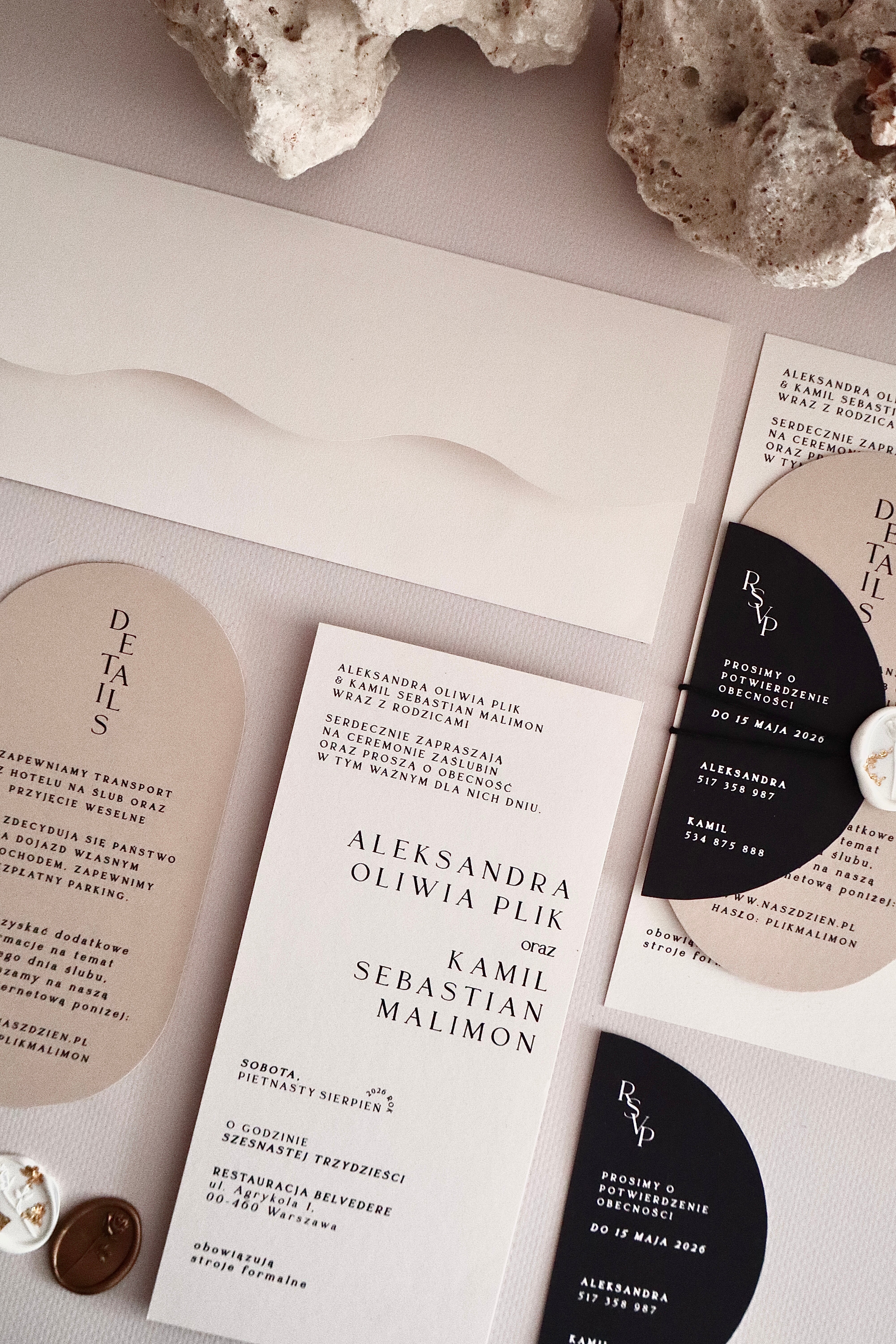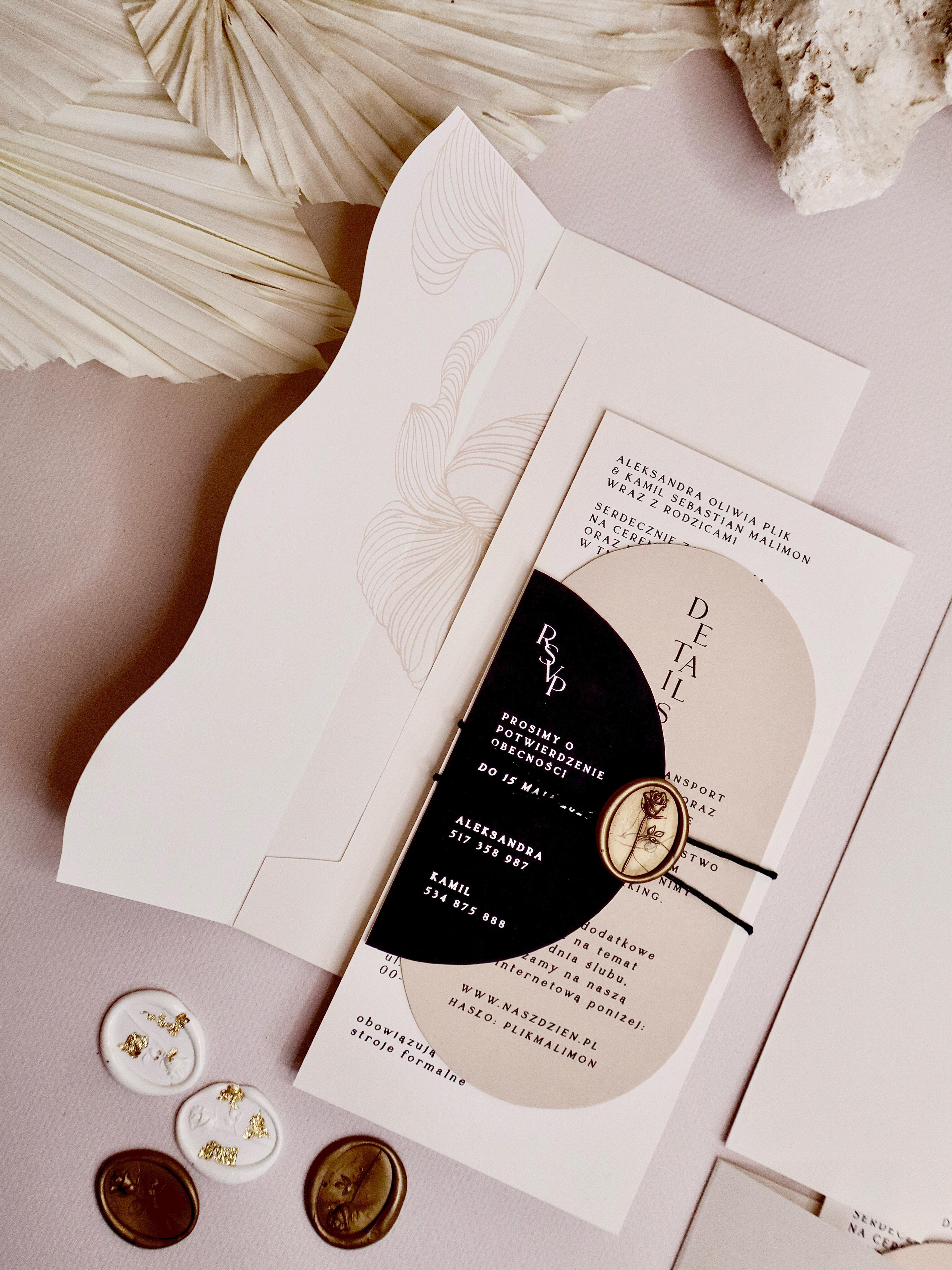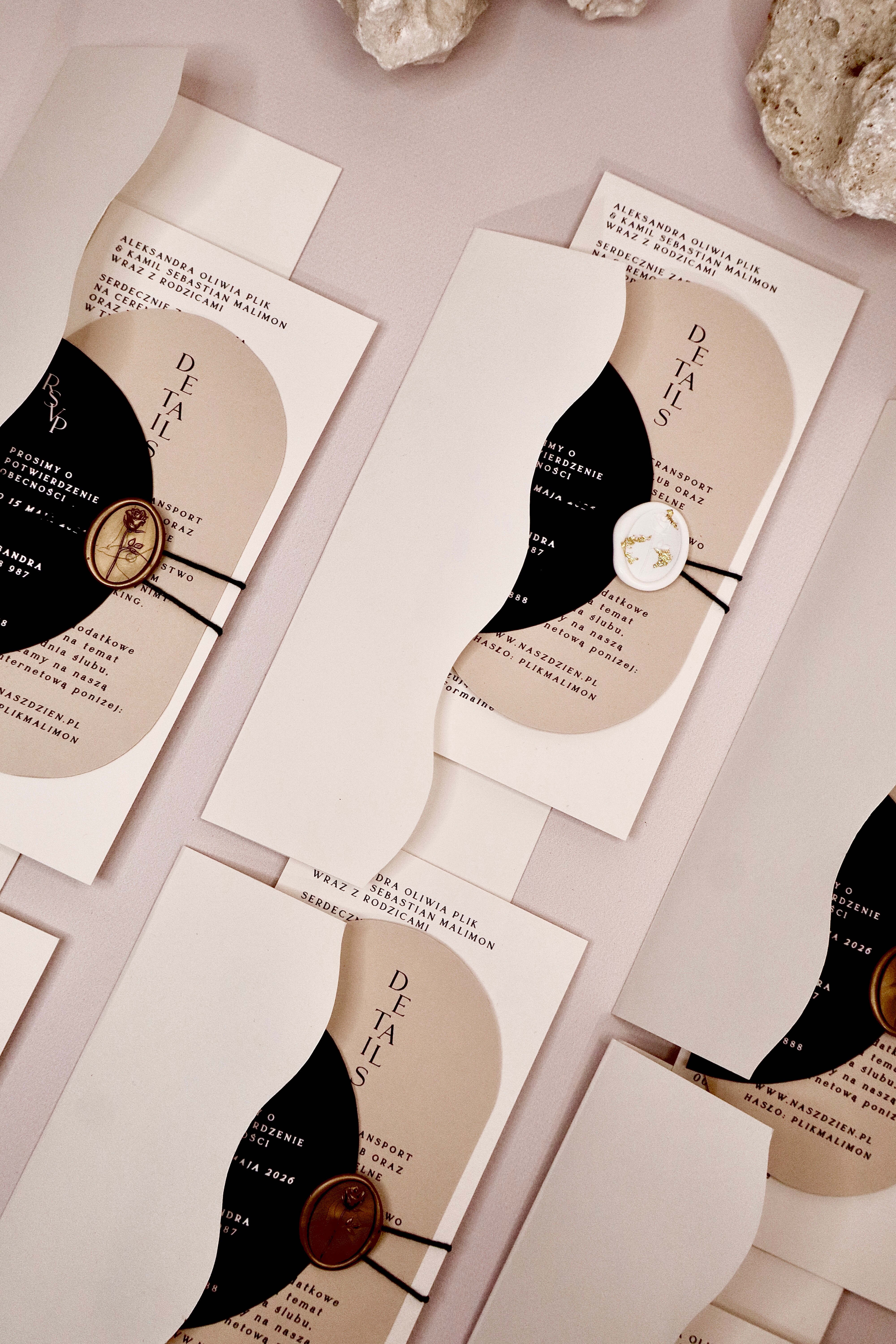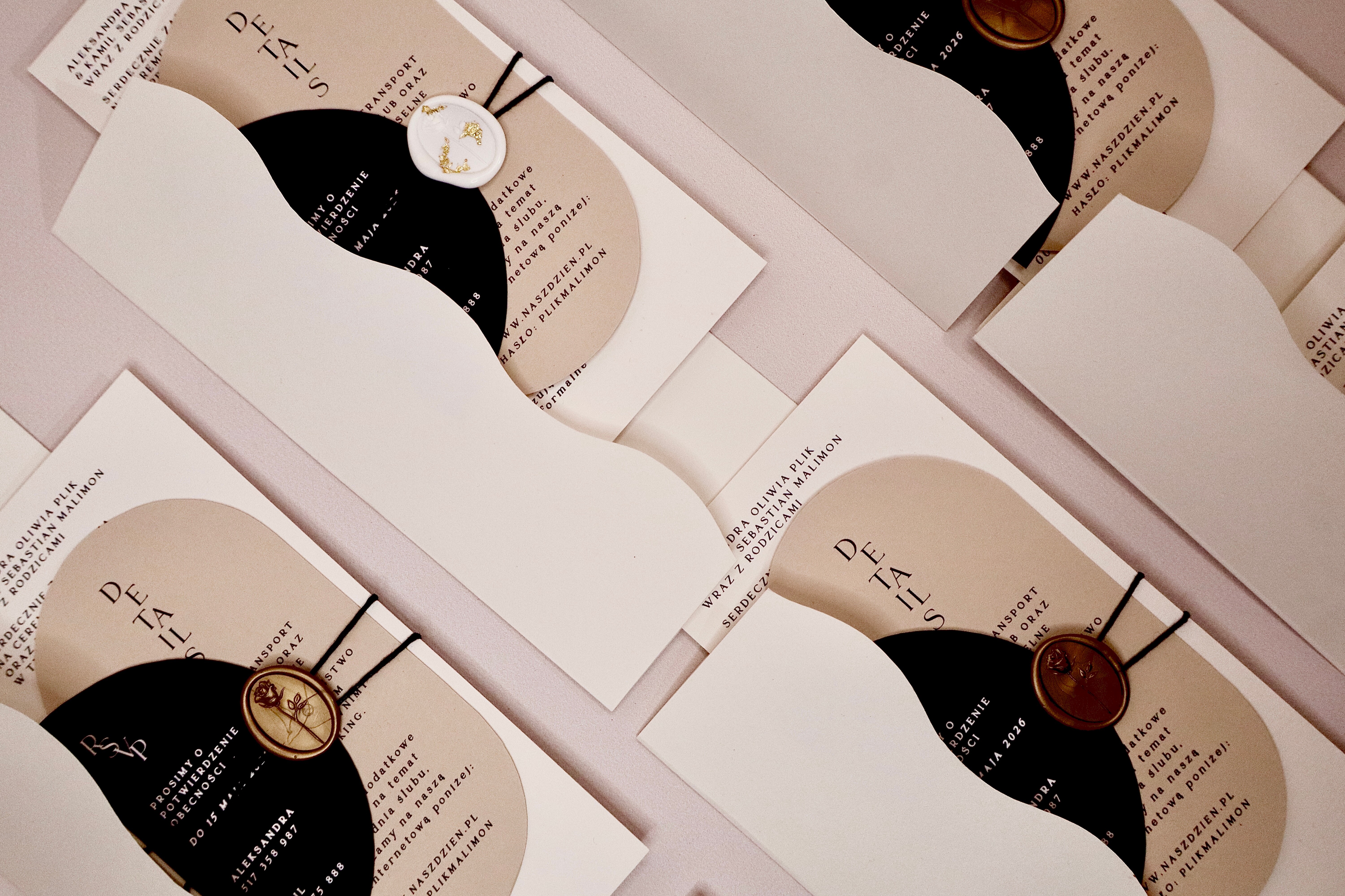 Geometryczne kształty, lakowe pieczęcie i inne detale nadają zaproszeniom wyjątkowej głębi i charakteru. Każdy element został zaprojektowany z myślą o nowoczesnych parach, które chcą podkreślić swój styl i dbałość o detale już od pierwszego wrażenia.