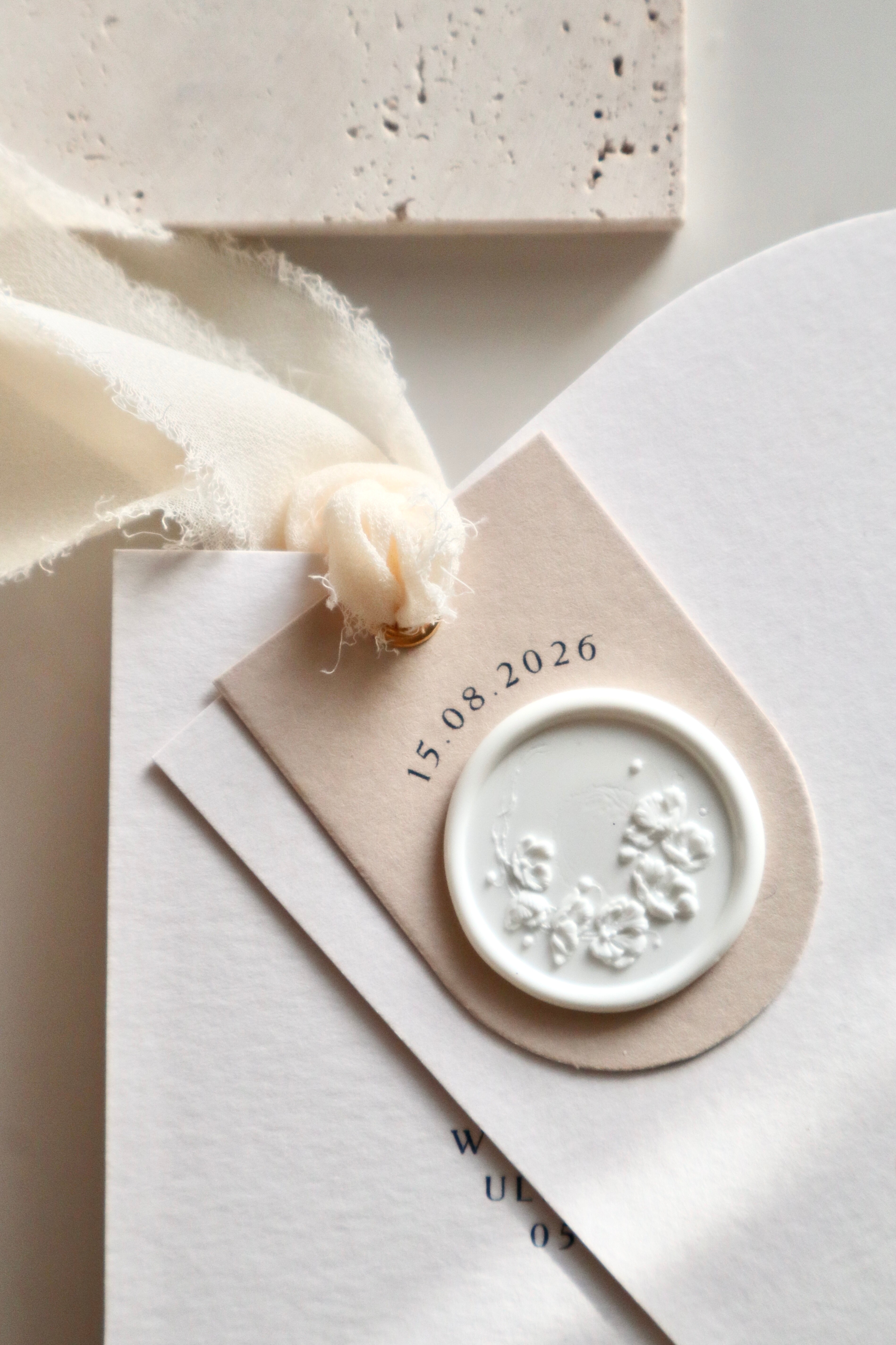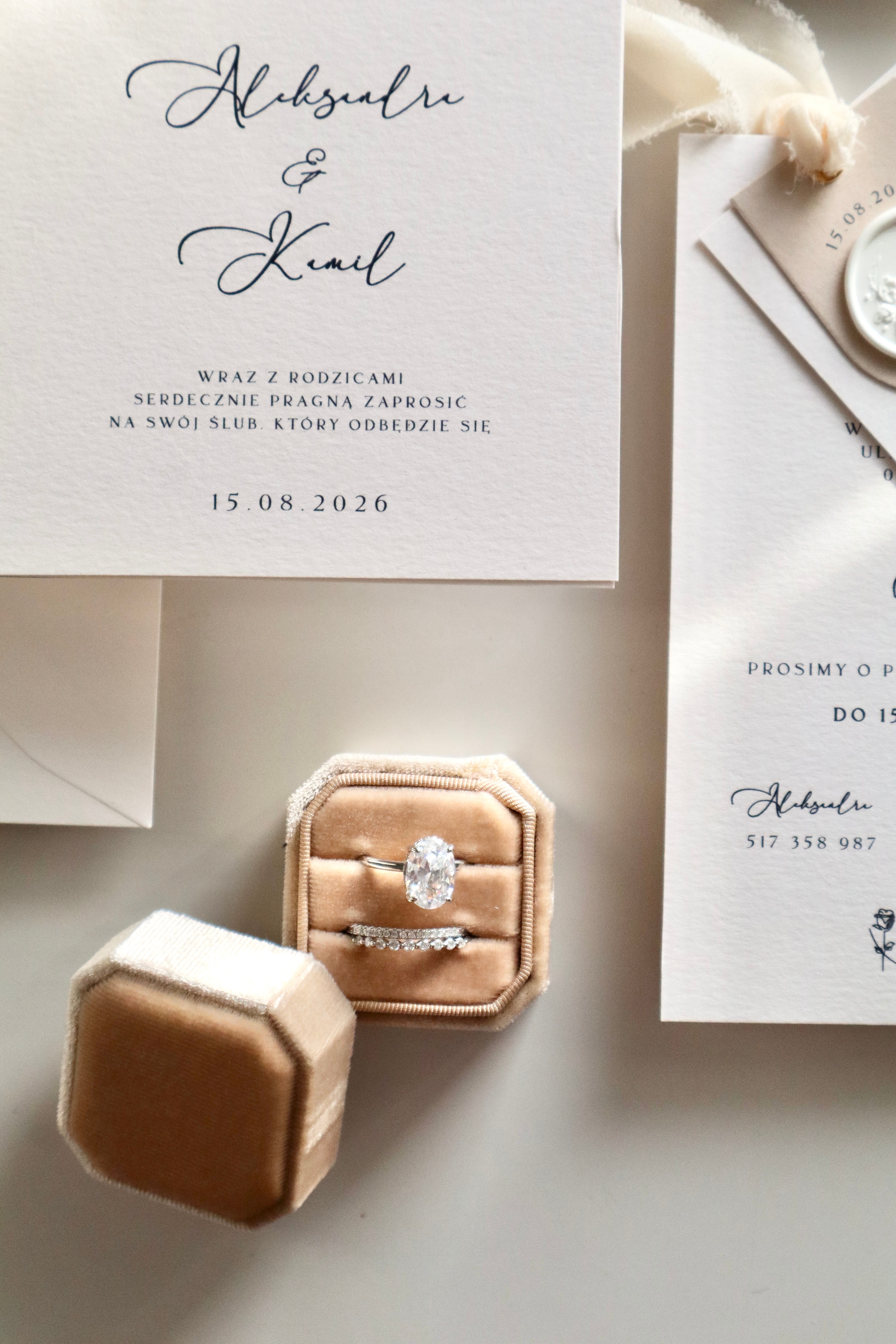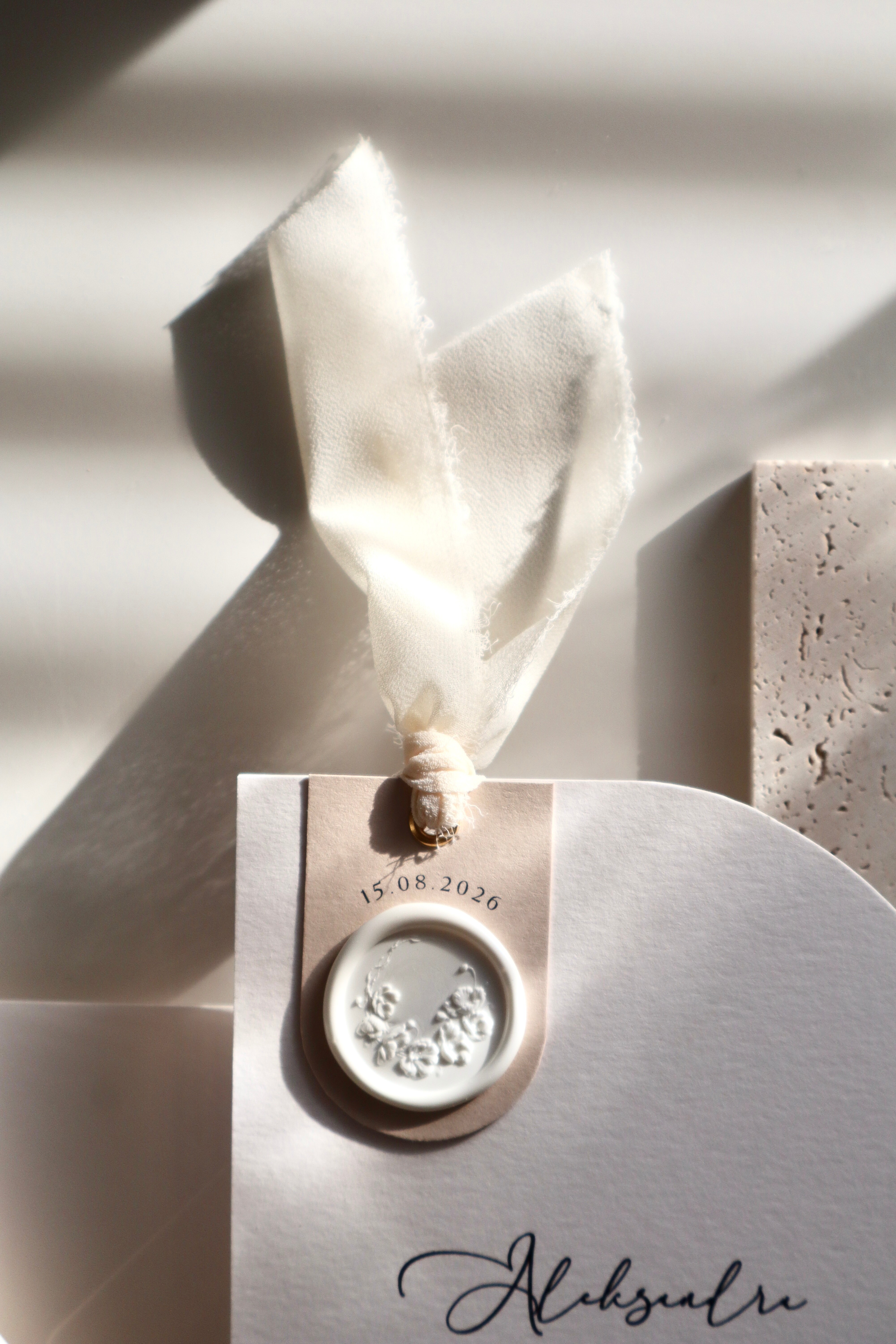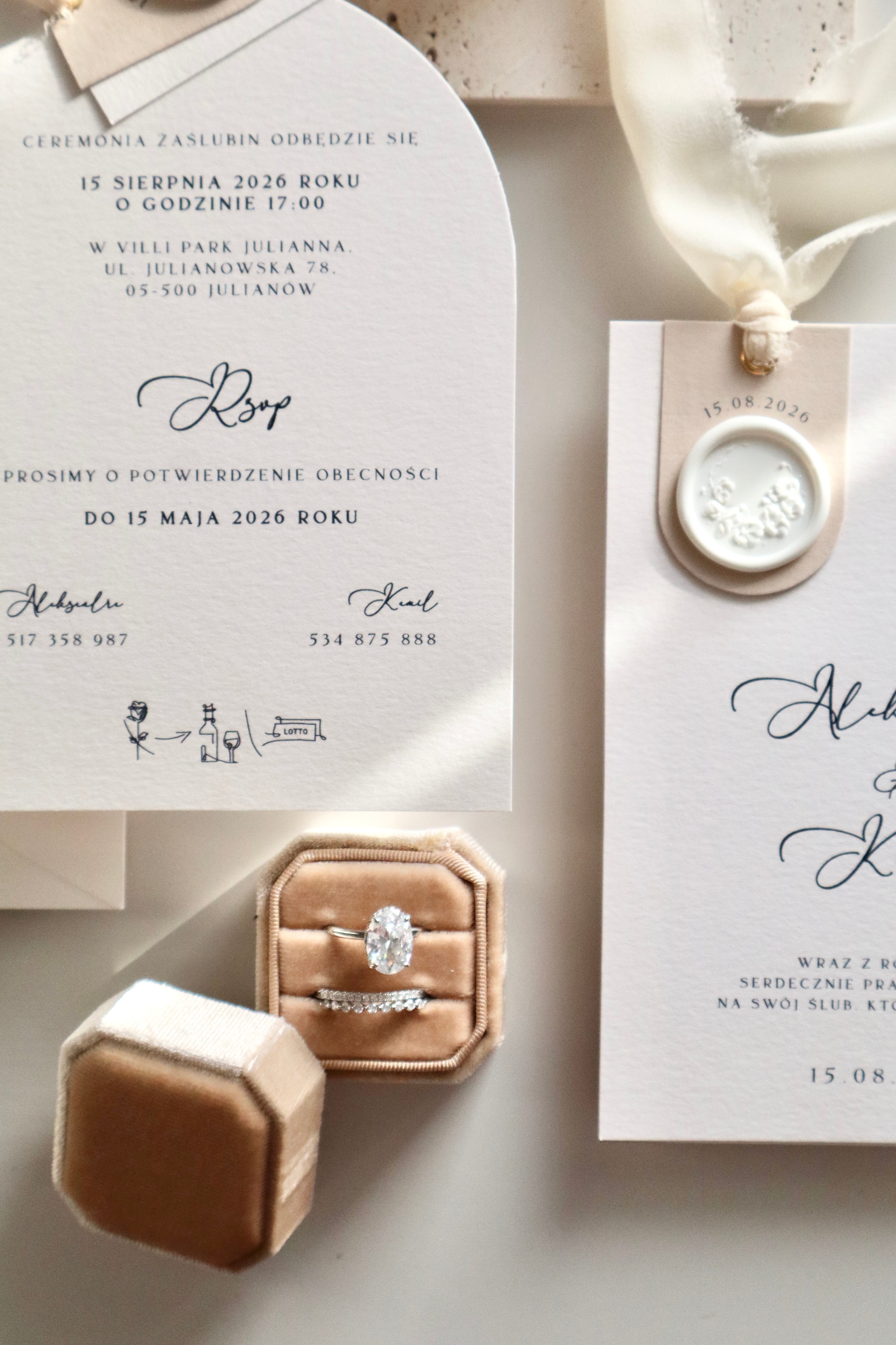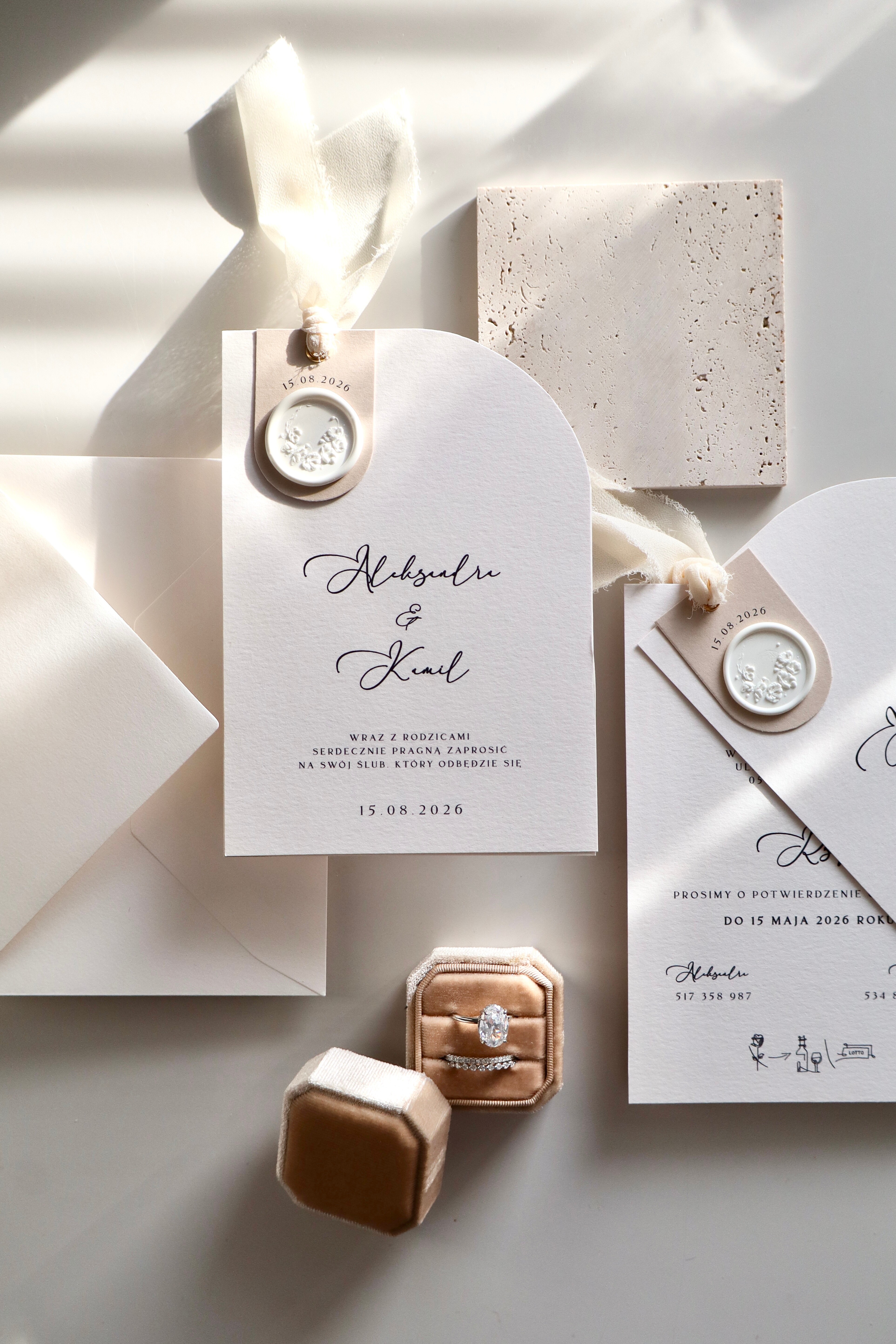 Charakterystyczny kształt kart, minimalistyczna kompozycja tekstu oraz naturalna, postrzępiona wstążka z pieczęcią lakową tworzą spójną i ponadczasową całość. To zaproszenie, które nie tylko zachwyca estetyką, ale też pokazuje dbałość o każdy szczegół.