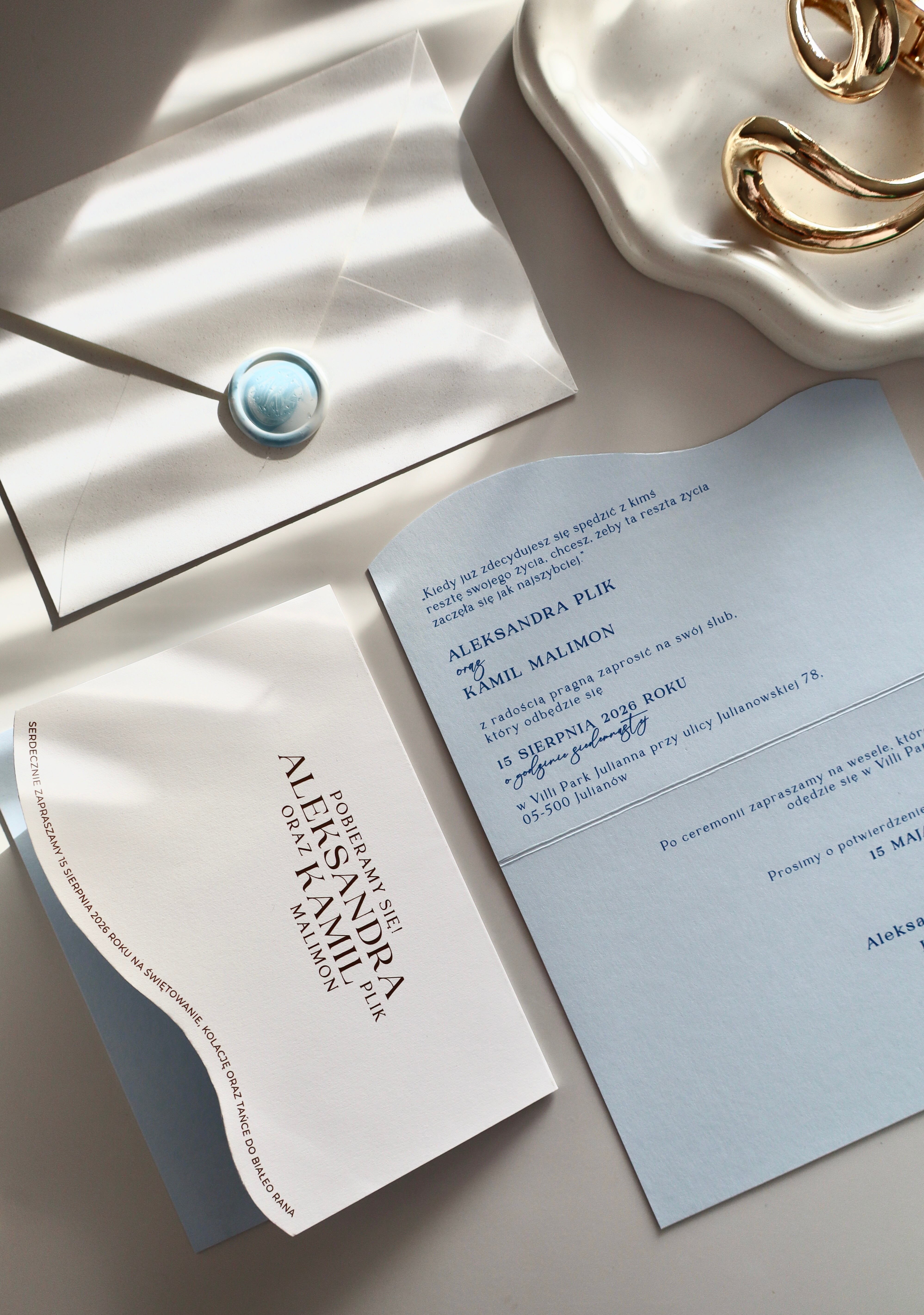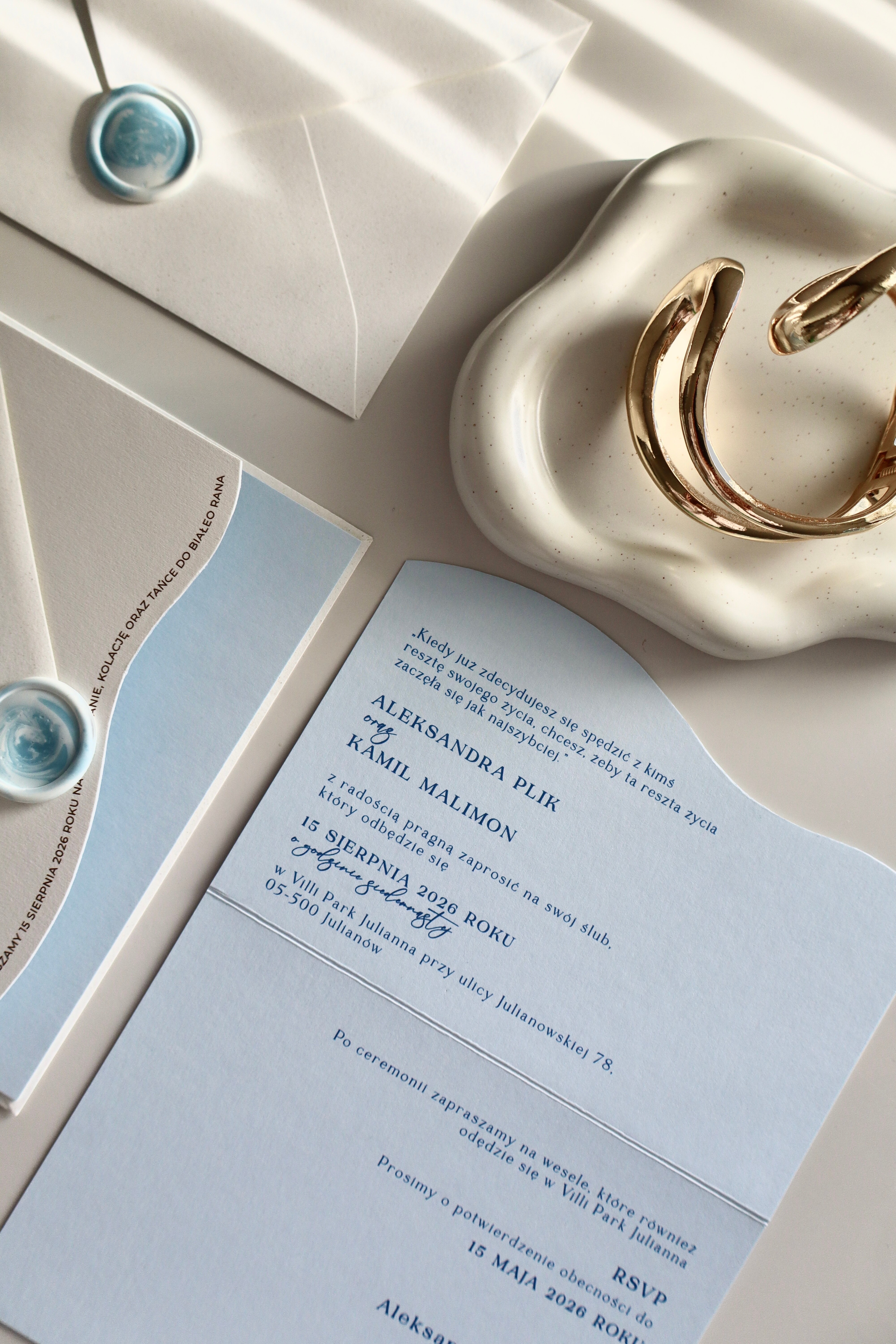 Kolekcja Waves to propozycja dla par, które cenią subtelność i nowoczesną elegancję. Charakterystyczne, falujące krawędzie zaproszeń symbolizują płynność i lekkość, tworząc wyjątkową kompozycję z delikatnymi odcieniami błękitu. Minimalistyczna typografia w połączeniu z dopracowanymi detalami, takimi jak woskowa pieczęć, nadaje całości wysmakowanego charakteru. To zaproszenia, które zachwycą harmonią formy i spokojem, wprowadzając gości w romantyczny klimat dnia ślubu.