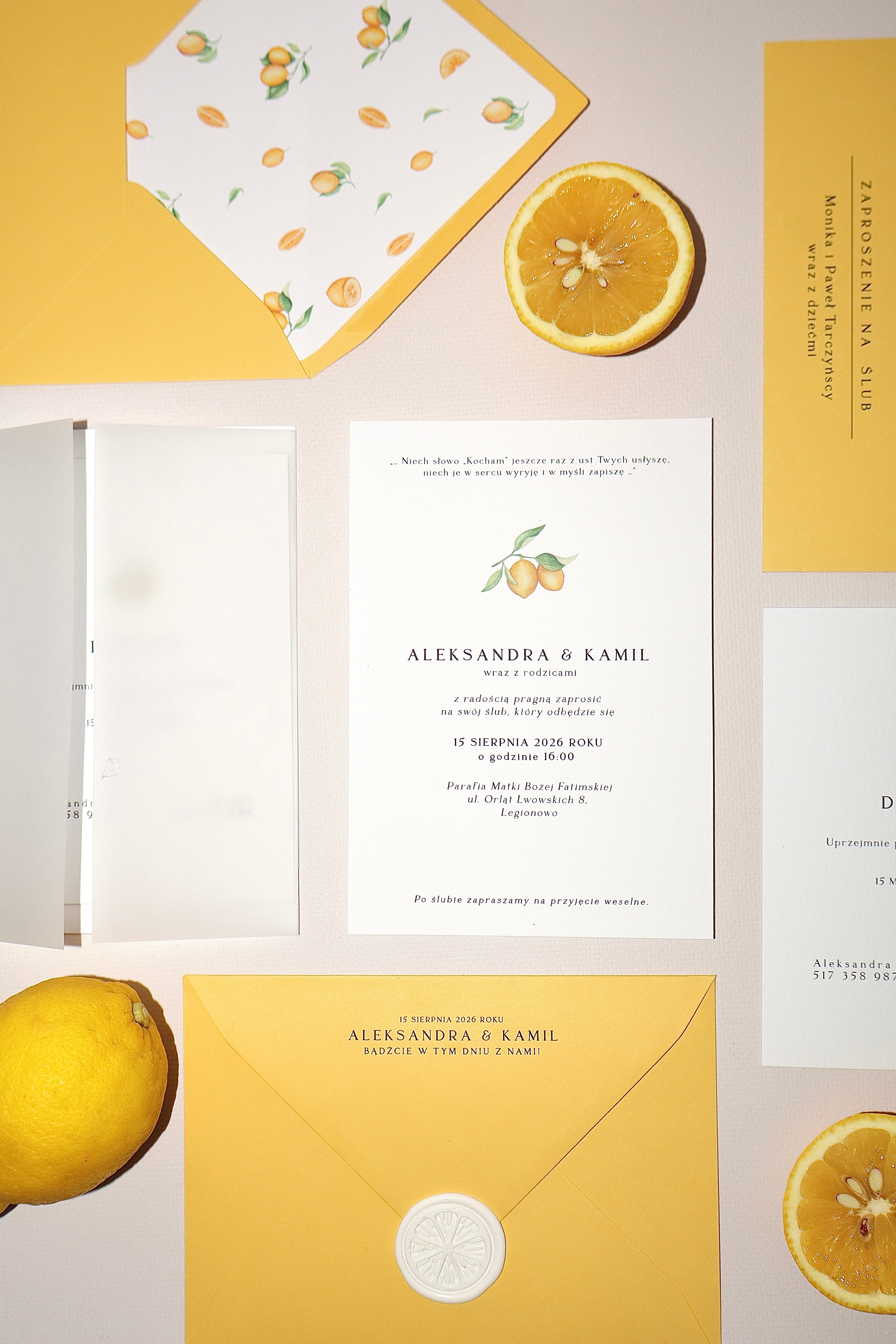 Soczysty motyw cytrusów, pastelowa paleta barw oraz subtelna typografia tworzą razem zaproszenie, które tchnie lekkością i pozytywną energią. To doskonały wybór na ślub w stylu garden party.