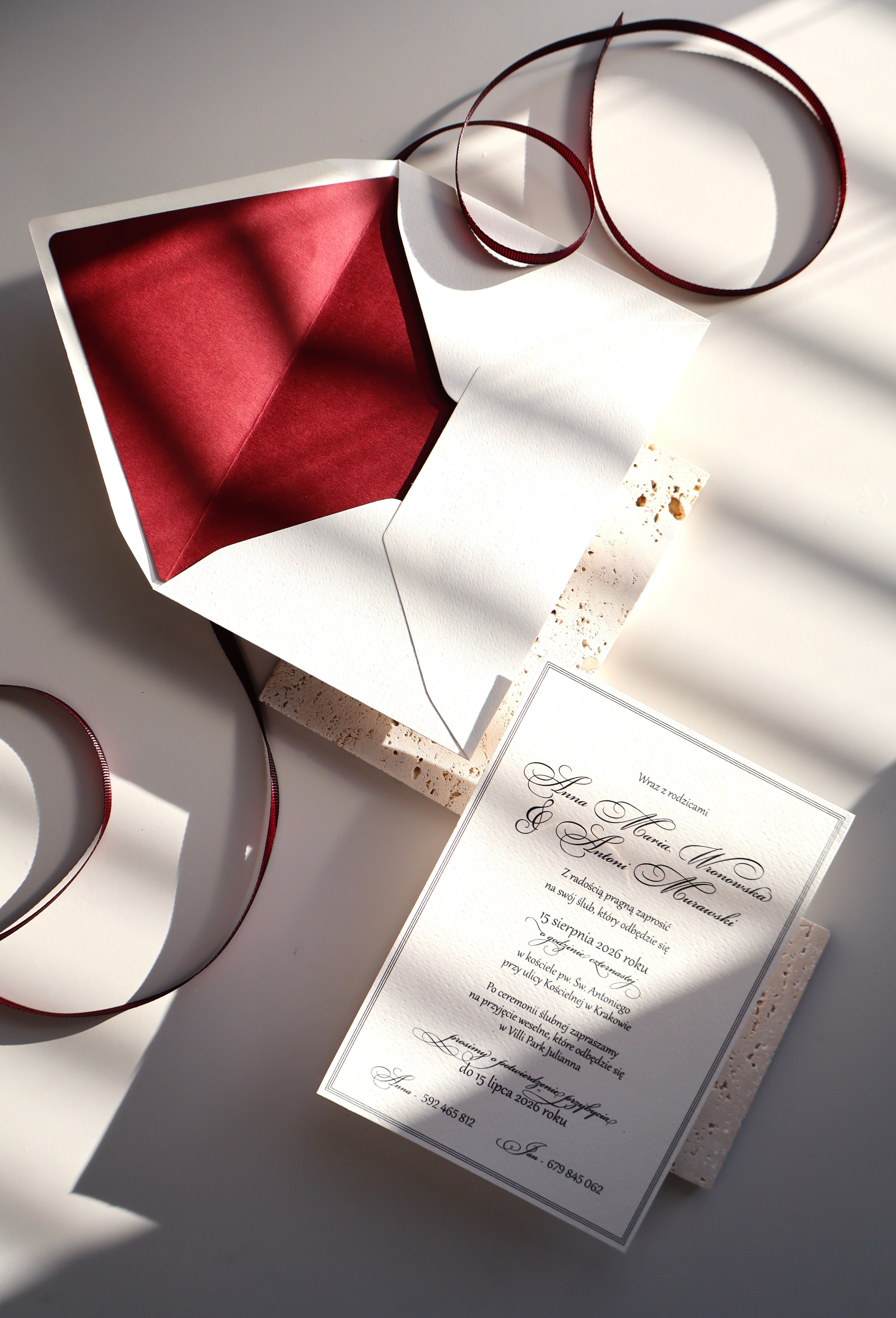 Do zaproszenia dołączona jest koperta z efektowną wklejką, która stanowi wyrazisty akcent i piękne dopełnienie całości. Kontrastujące wnętrze koperty dodaje elegancji oraz podkreśla wyjątkowy charakter zaproszenia już od pierwszego spojrzenia.
