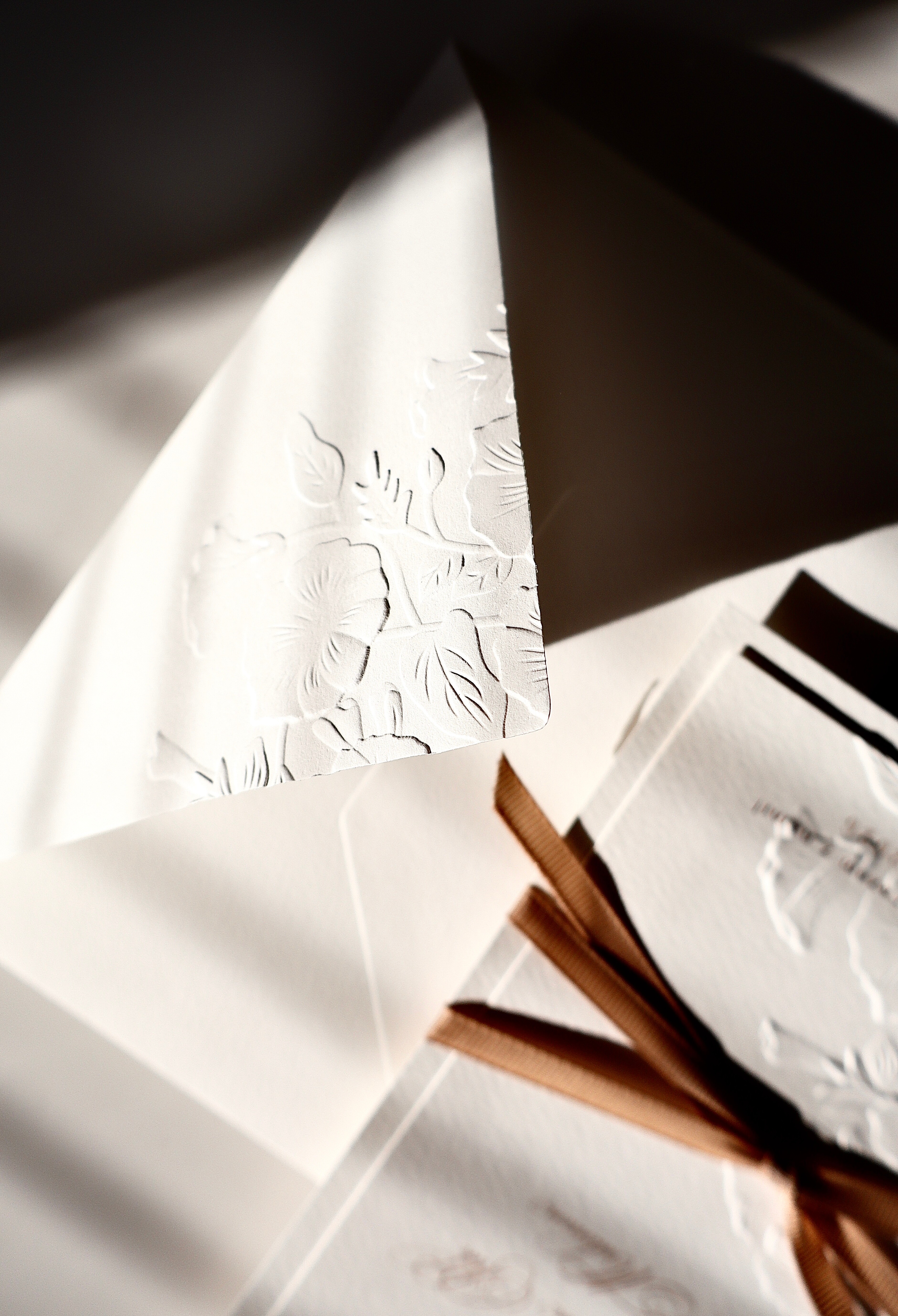 Dopełnieniem zestawu jest koperta z klapą zdobioną tłoczonym motywem kwiatowym, harmonizującym z kartą główną. Subtelne detale oraz spójność wszystkich elementów tworzą wyjątkową, dopracowaną całość, idealną dla Par ceniących klasykę i ponadczasowe piękno.