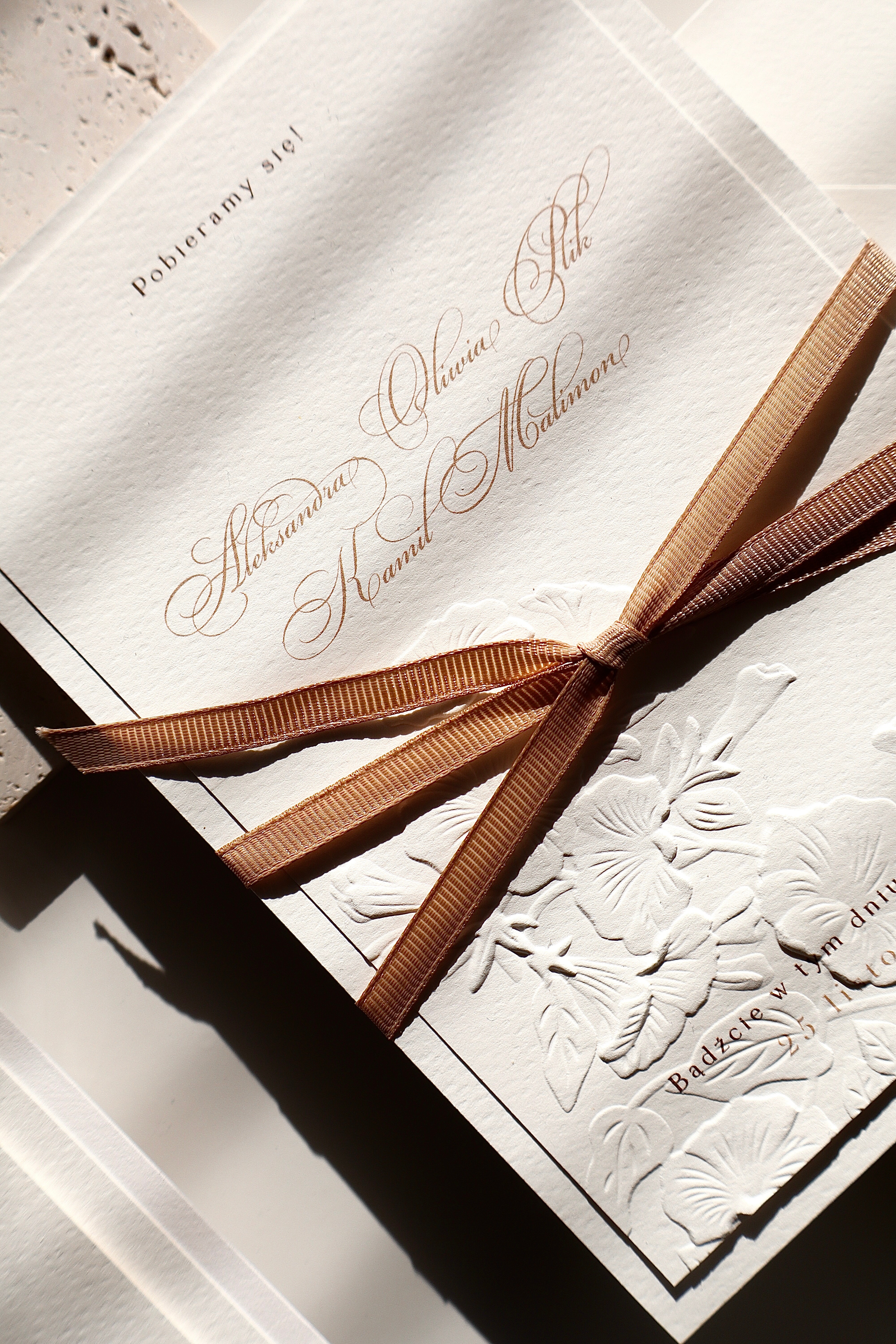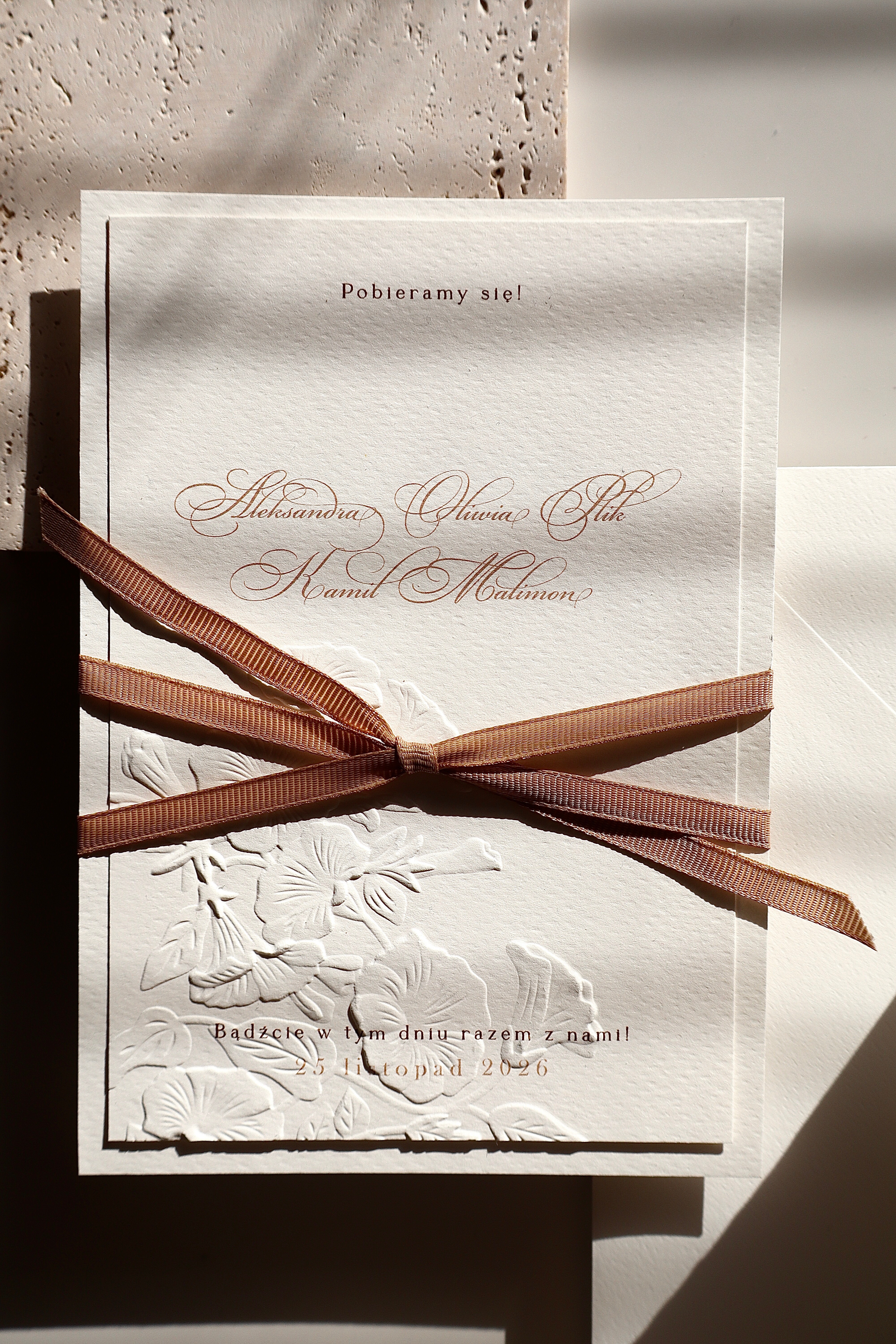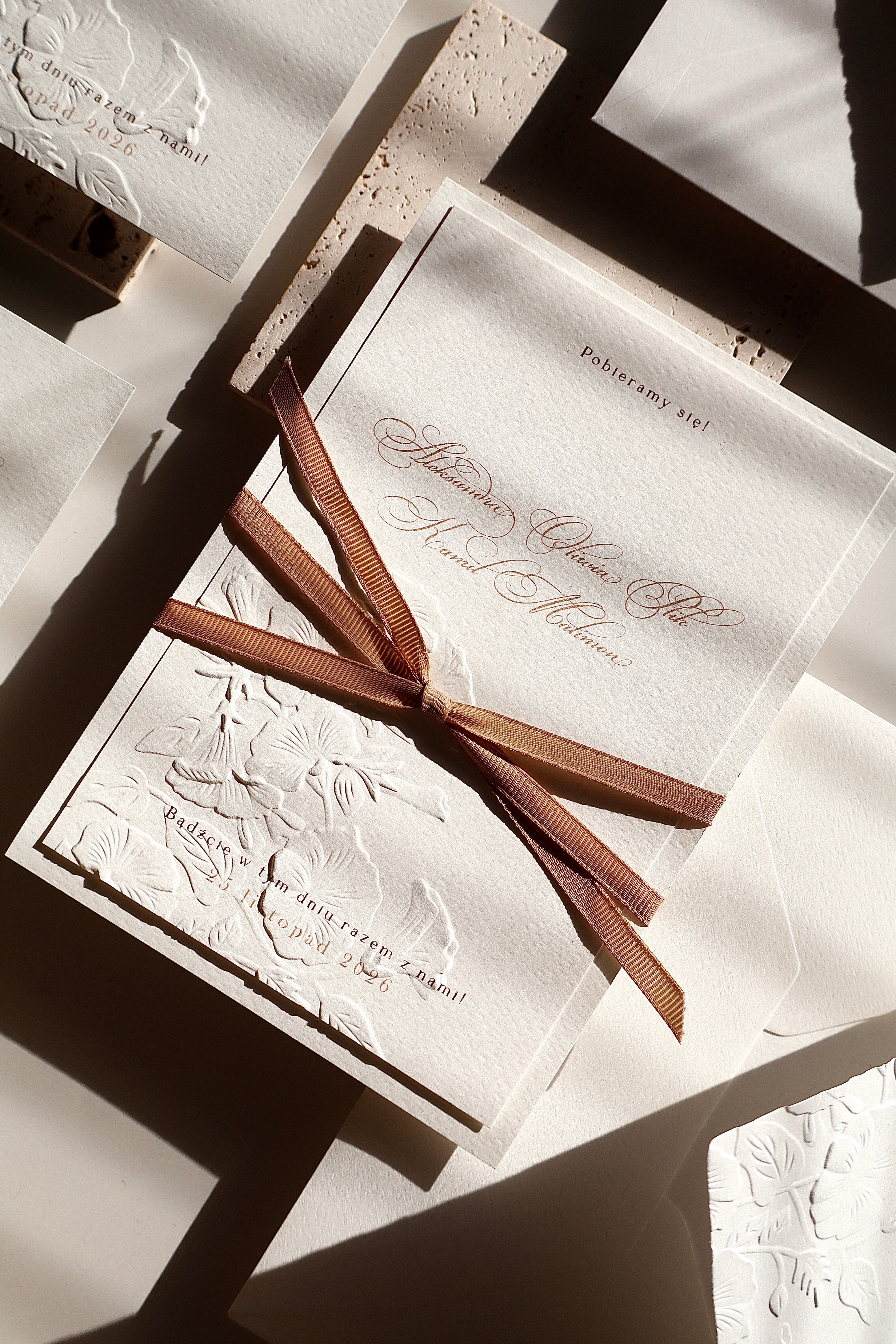 W zestawie znajdują się dwie karty zaproszenia, utrzymane w spójnej, klasycznej estetyce. Jedna z nich została ozdobiona delikatnym tłoczeniem kwiatowym, które tworzy wyjątkowy efekt trójwymiarowości i nadaje całości romantycznego charakteru. Druga karta, minimalistyczna i elegancka, stanowi idealne dopełnienie kompozycji, eksponując starannie dobraną typografię.