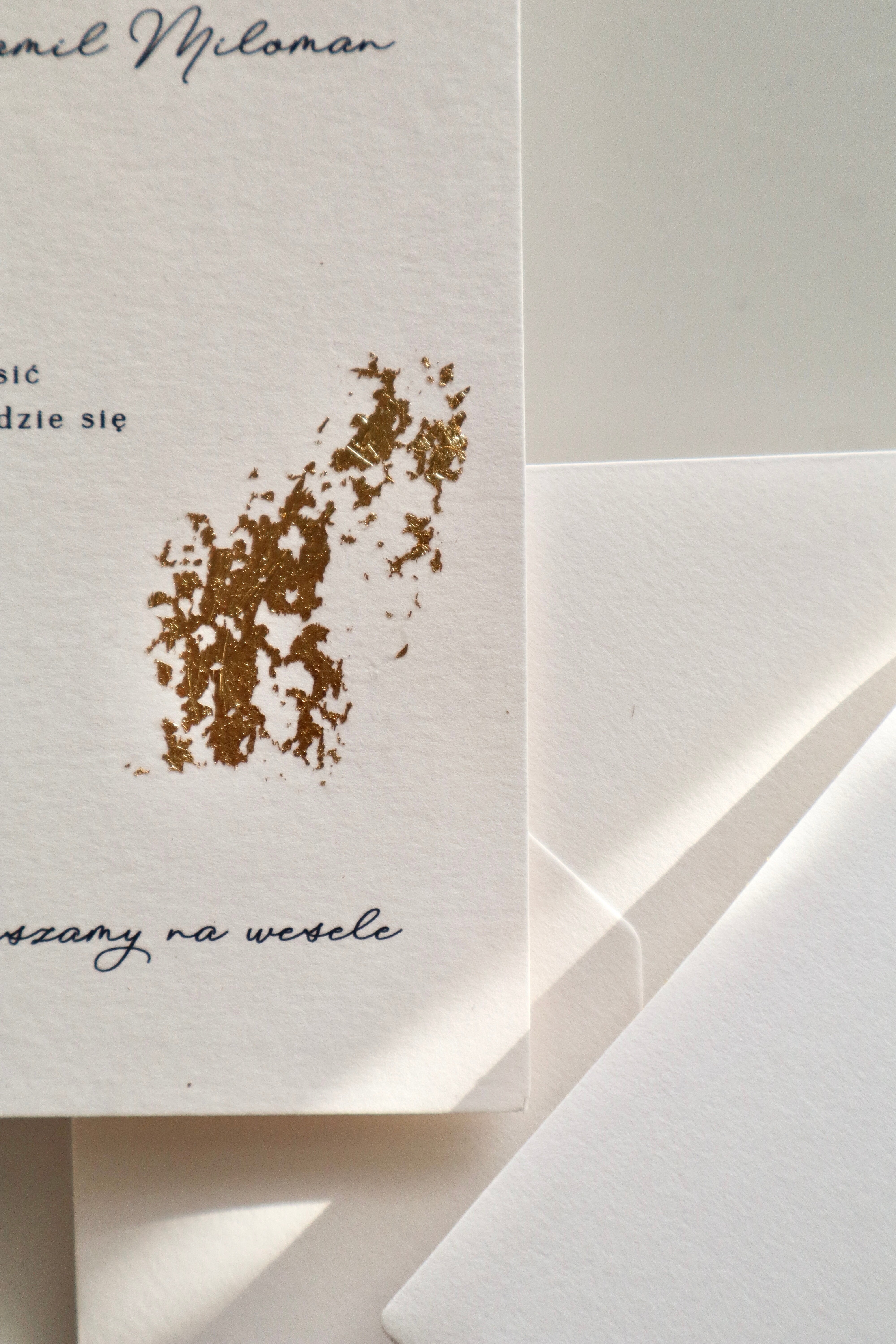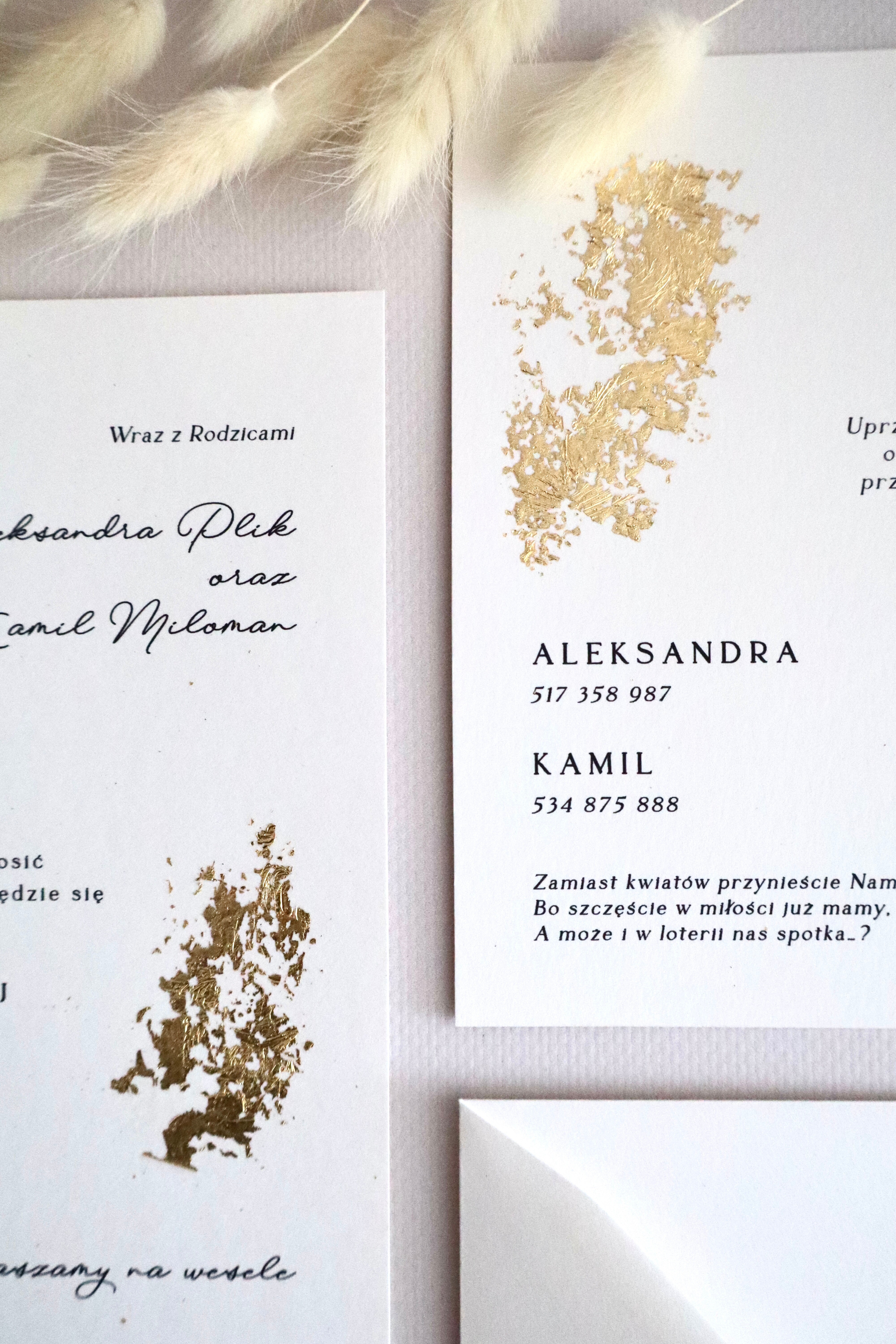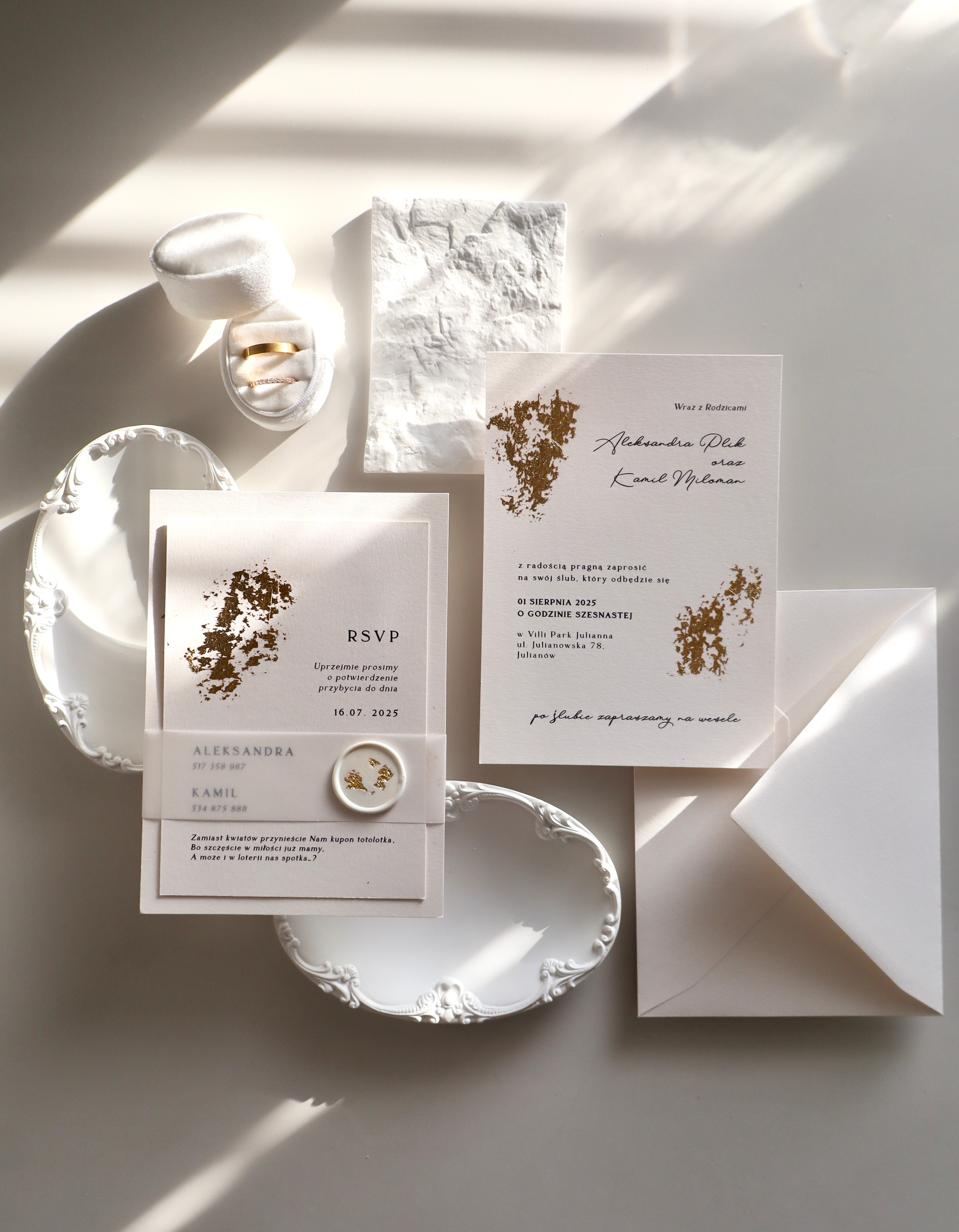Kolekcja Sparkling Gold to propozycja dla par, które pragną zaproszenia pełnego uroku, blasku i wyjątkowości. Projekt opiera się na dwóch eleganckich kartach wykonanych z wysokiej jakości papieru śmietankowego, ozdobionych nieregularnymi, ręcznie nanoszonymi złoceniami, które tworzą niepowtarzalny efekt – każda karta jest unikatowa.