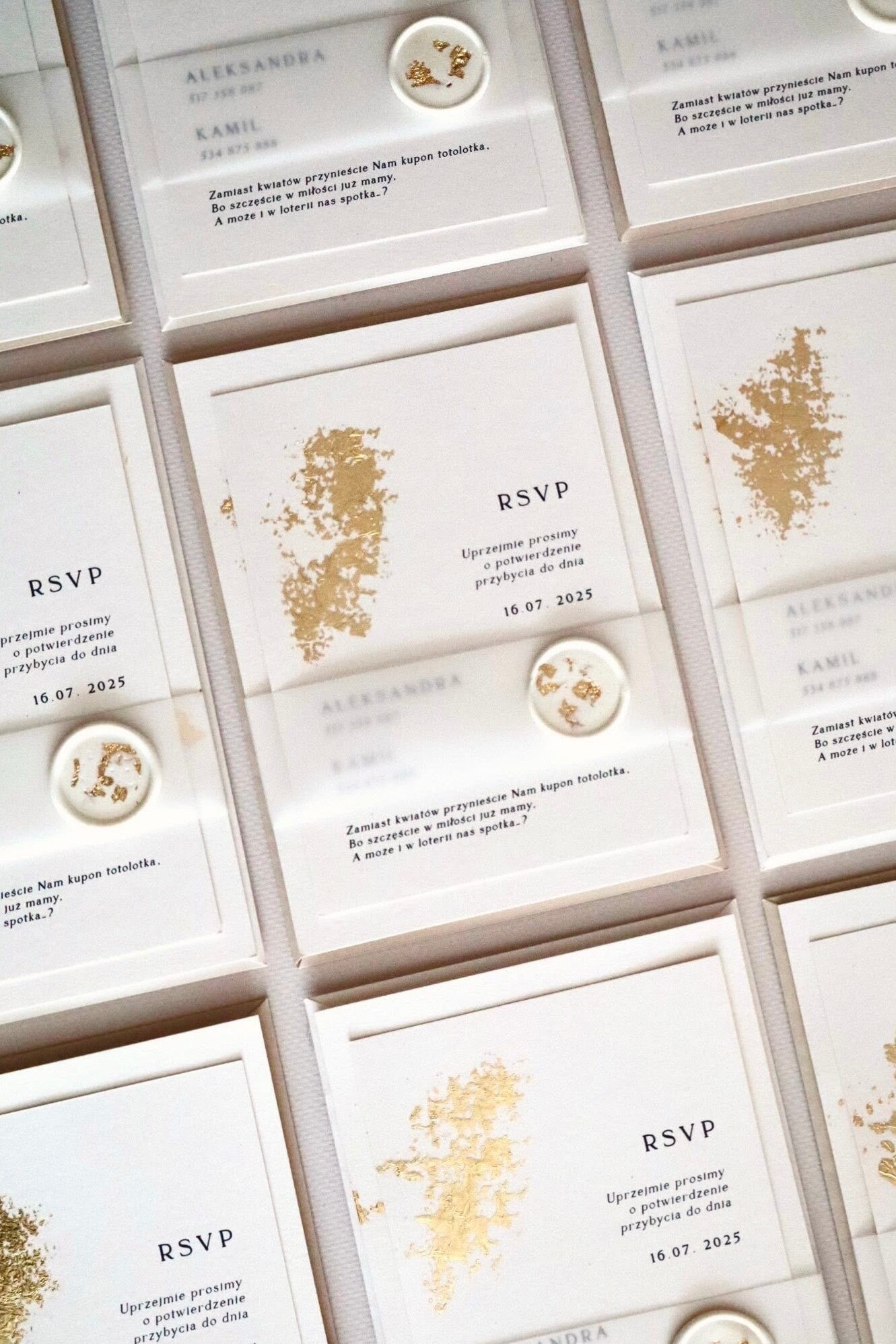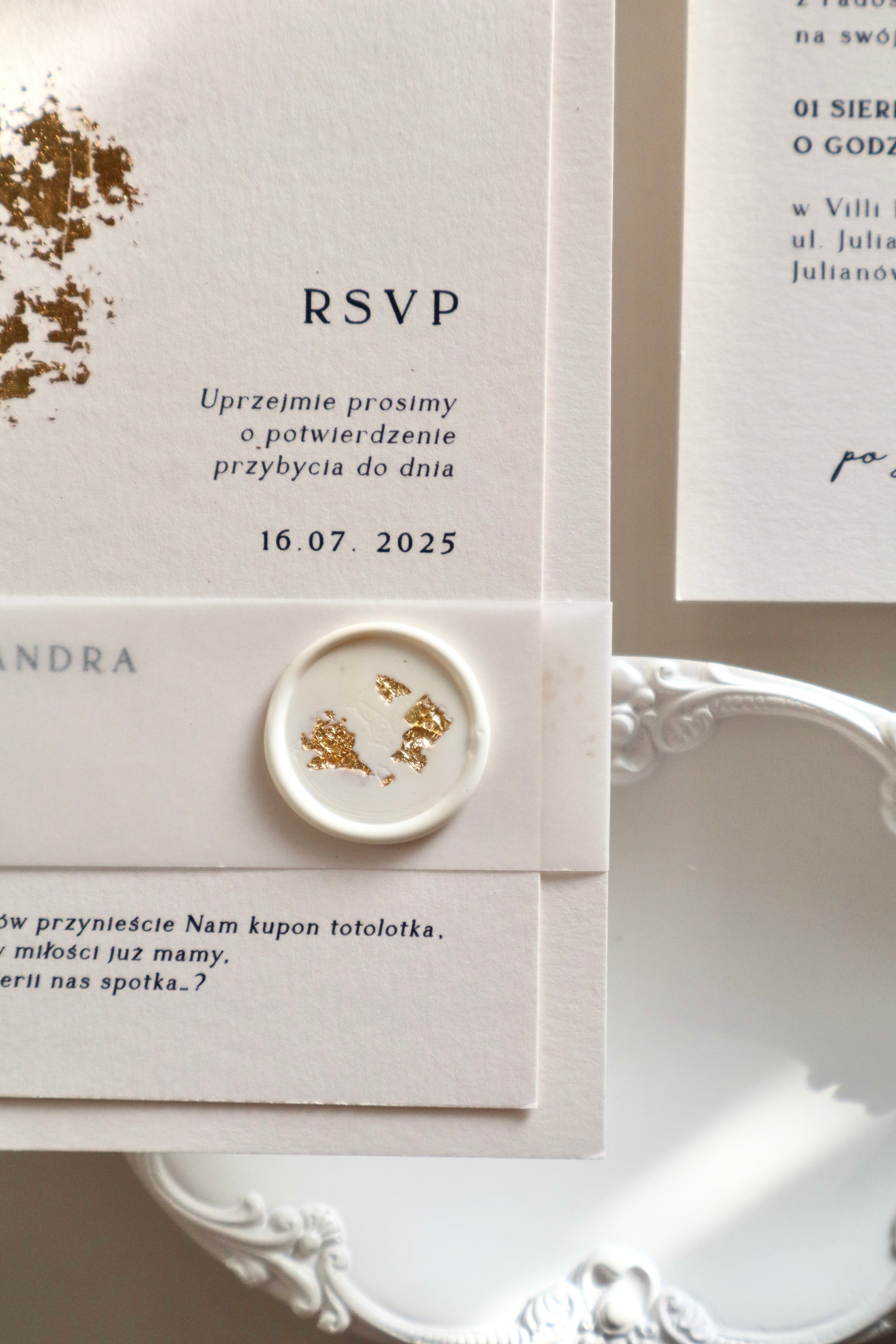 Całość spięta została przezroczystą opaską, subtelną, ale efektowną, która pozwala dostrzec piękno kart w środku. Opaskę zdobi biała pieczęć lakowa z dodatkiem złota płatkowego – niezwykle elegancki detal, który przyciąga wzrok i dopełnia całą kompozycję w stylu luksusowej prostoty.